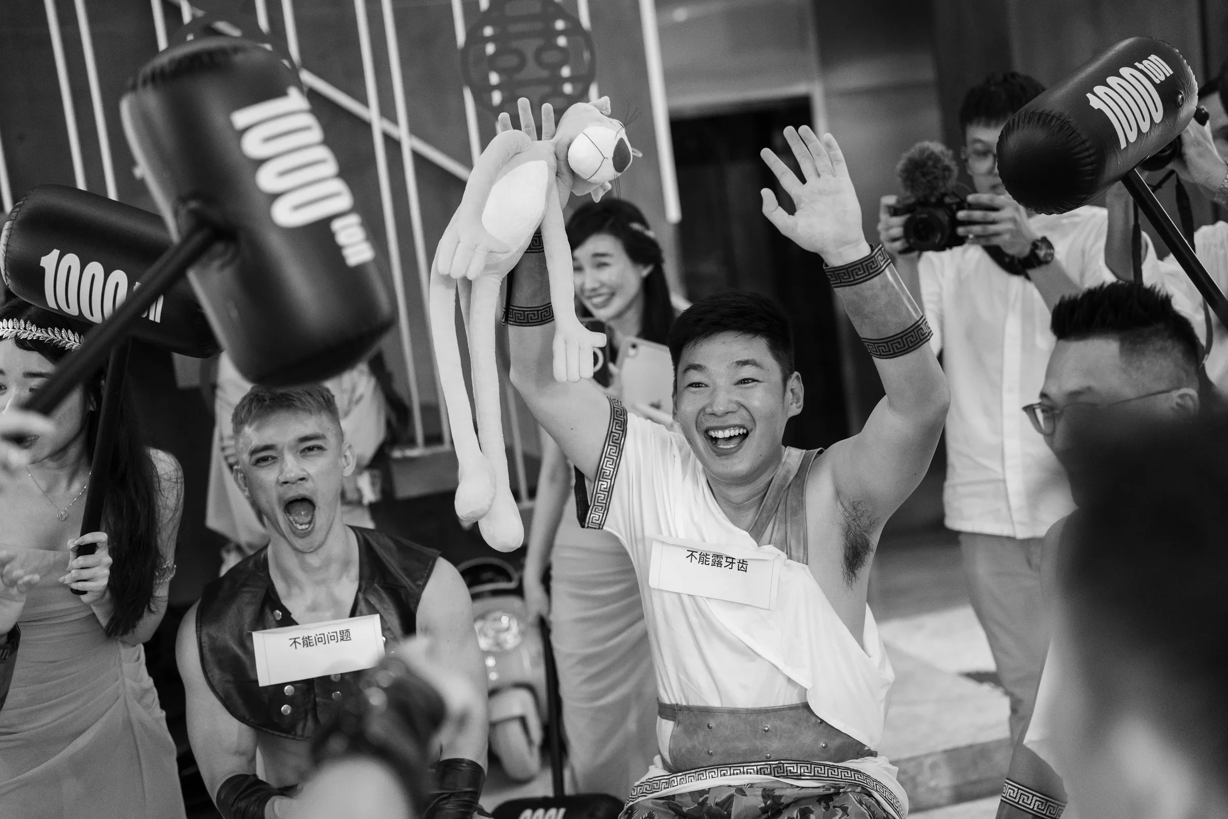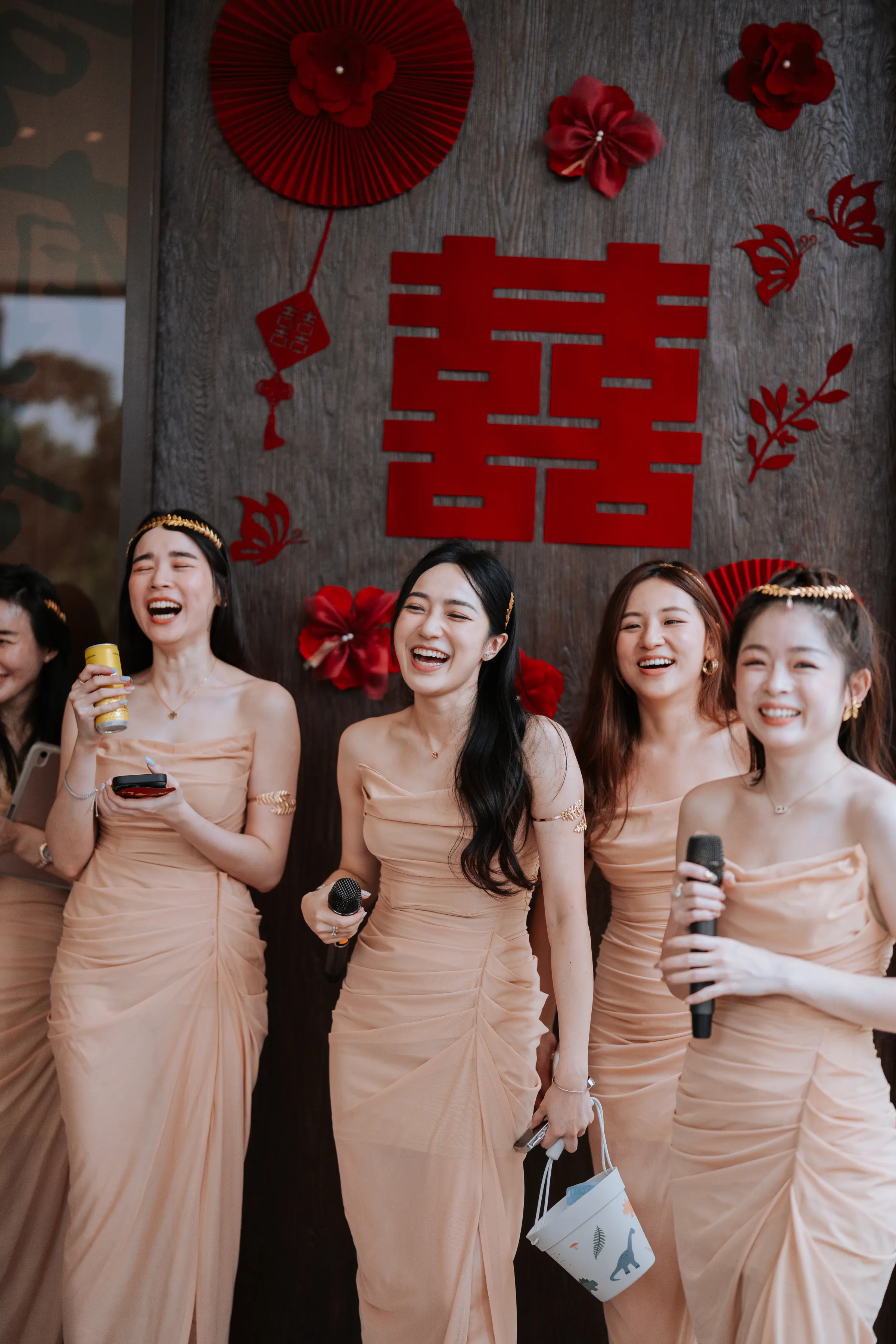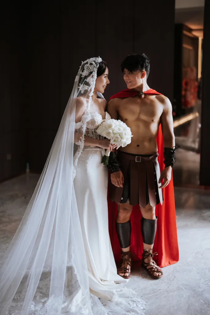 The day began with a lively Chinese gatecrash, where Eddie and his groomsmen embraced a bold Roman gladiator theme, donning leather gladiator skirts and arm cuffs. Nicole’s bridesmaids complemented the theme in blush-toned dresses and gold leaf hair accessories, harmonizing with the playful yet classic mood of the morning.