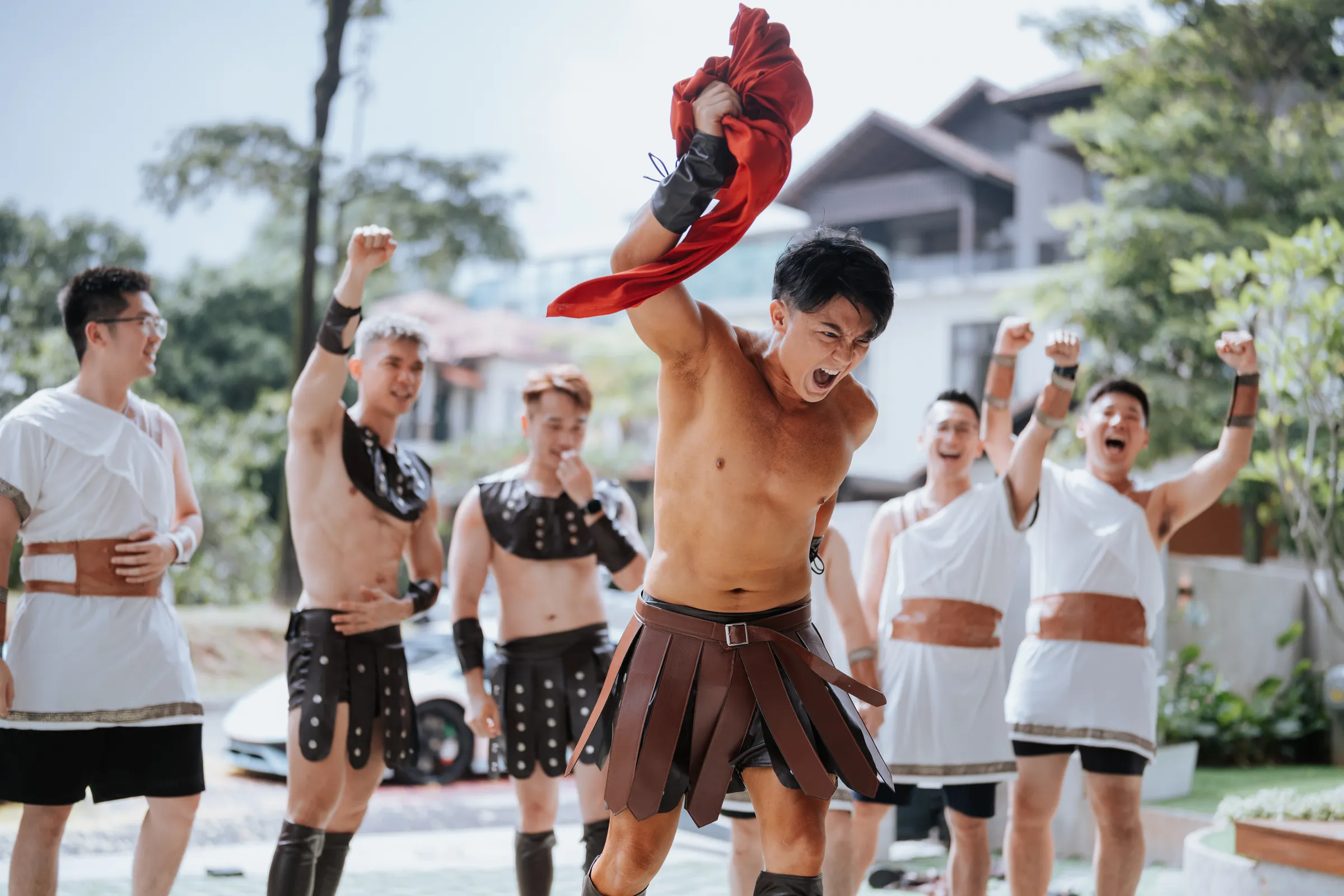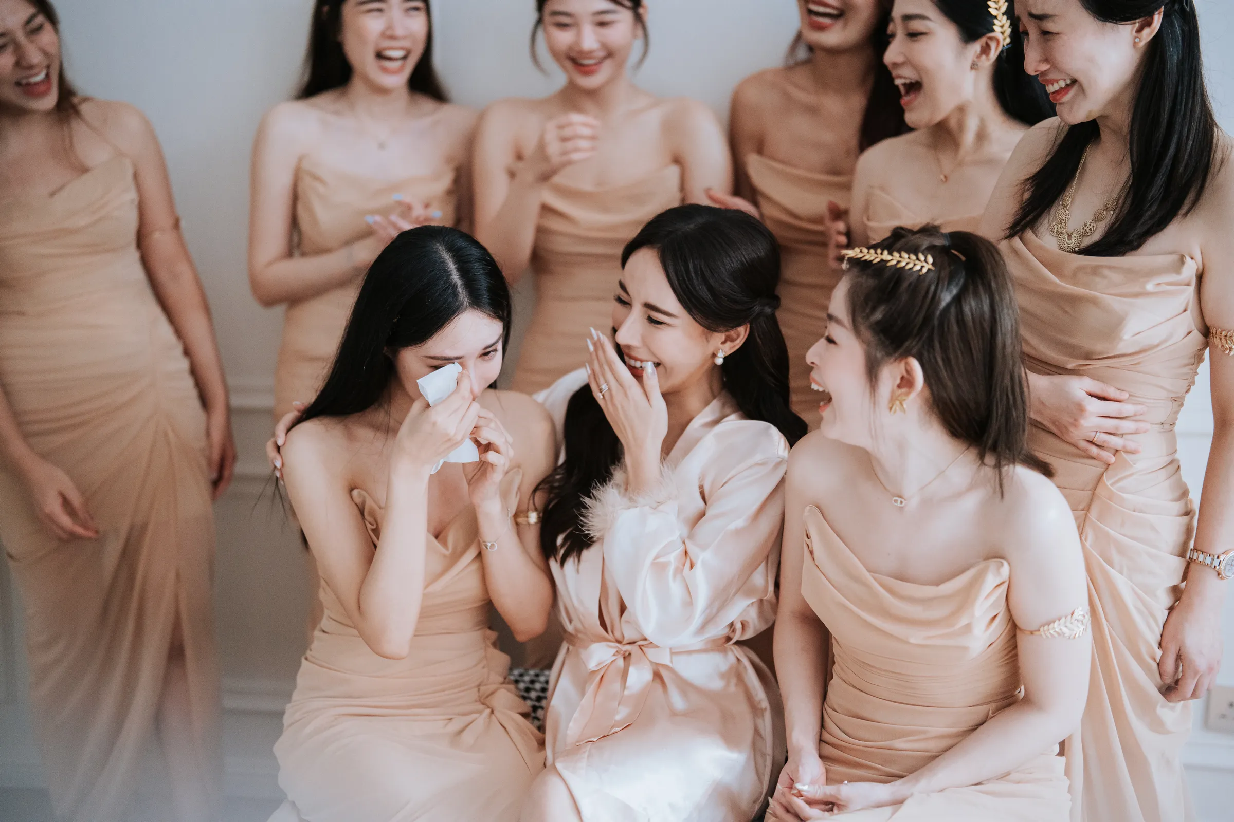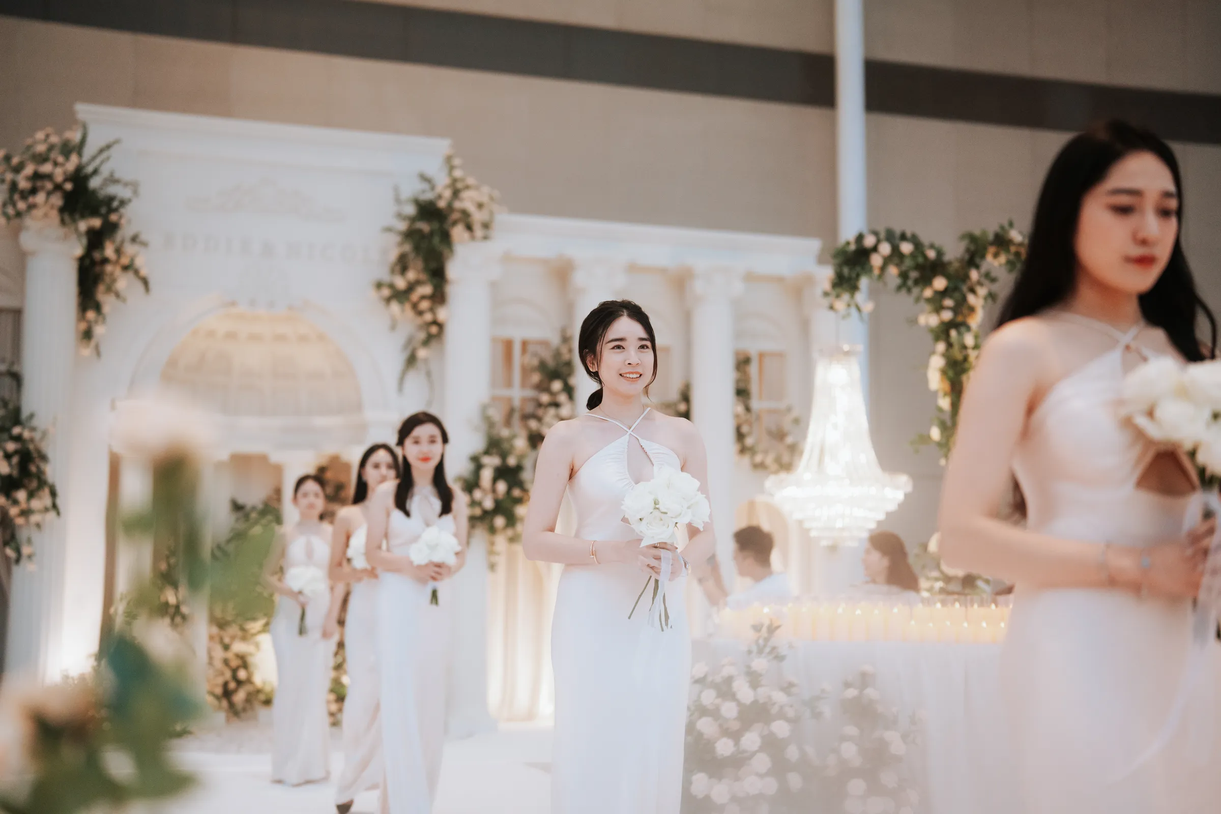 The day began with a lively Chinese gatecrash, where Eddie and his groomsmen embraced a bold Roman gladiator theme, donning leather gladiator skirts and arm cuffs. Nicole’s bridesmaids complemented the theme in blush-toned dresses and gold leaf hair accessories, harmonizing with the playful yet classic mood of the morning.