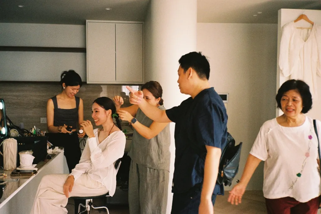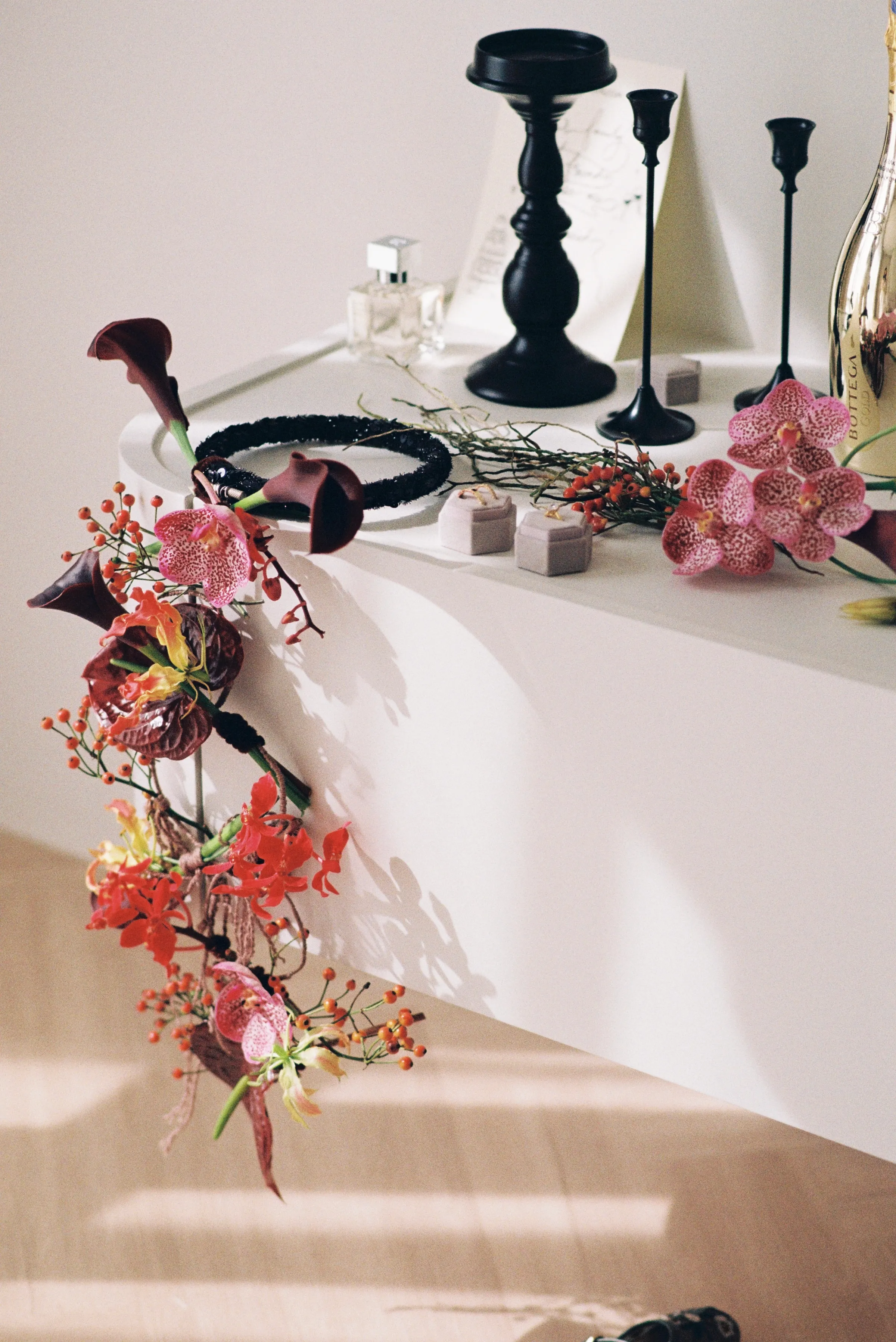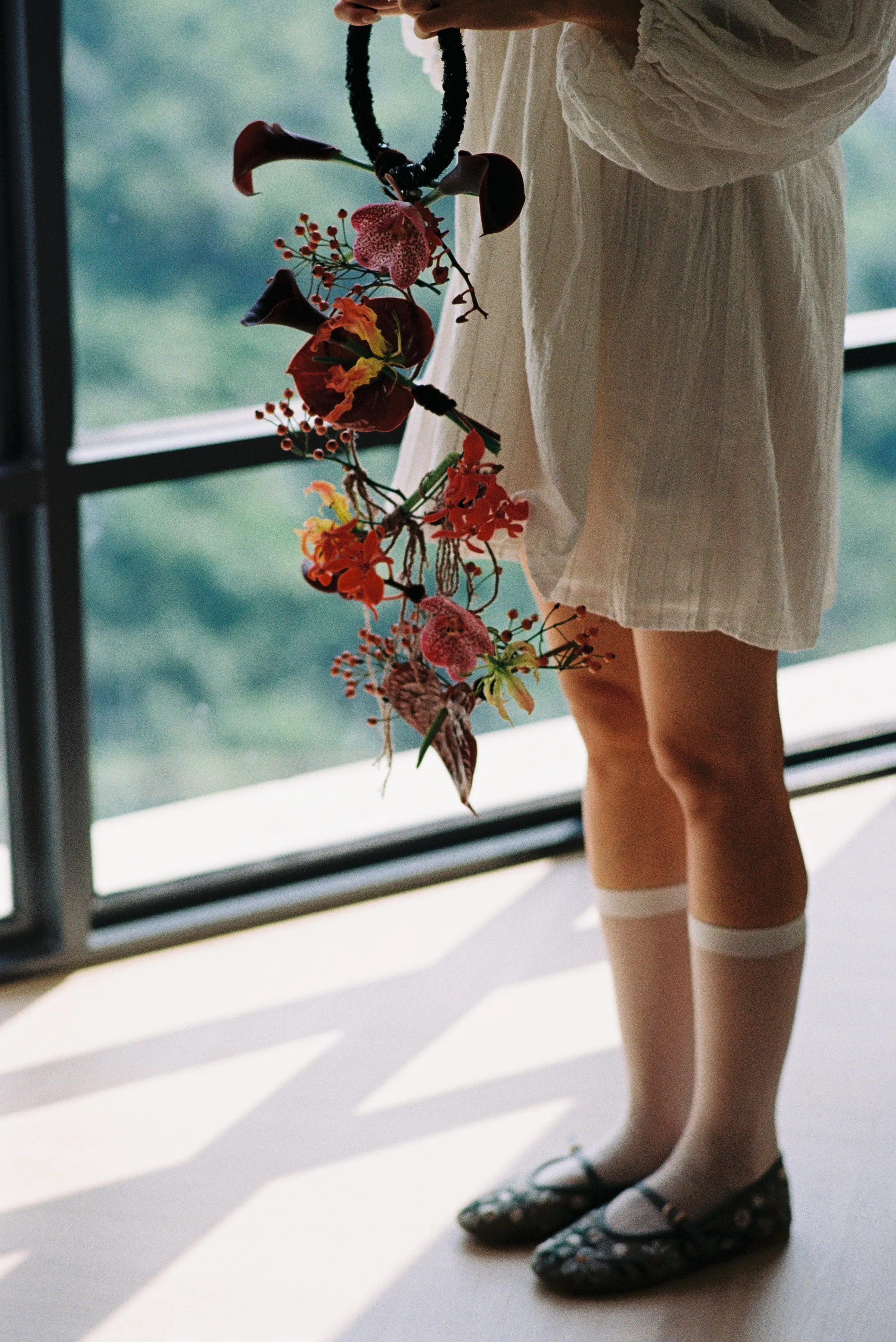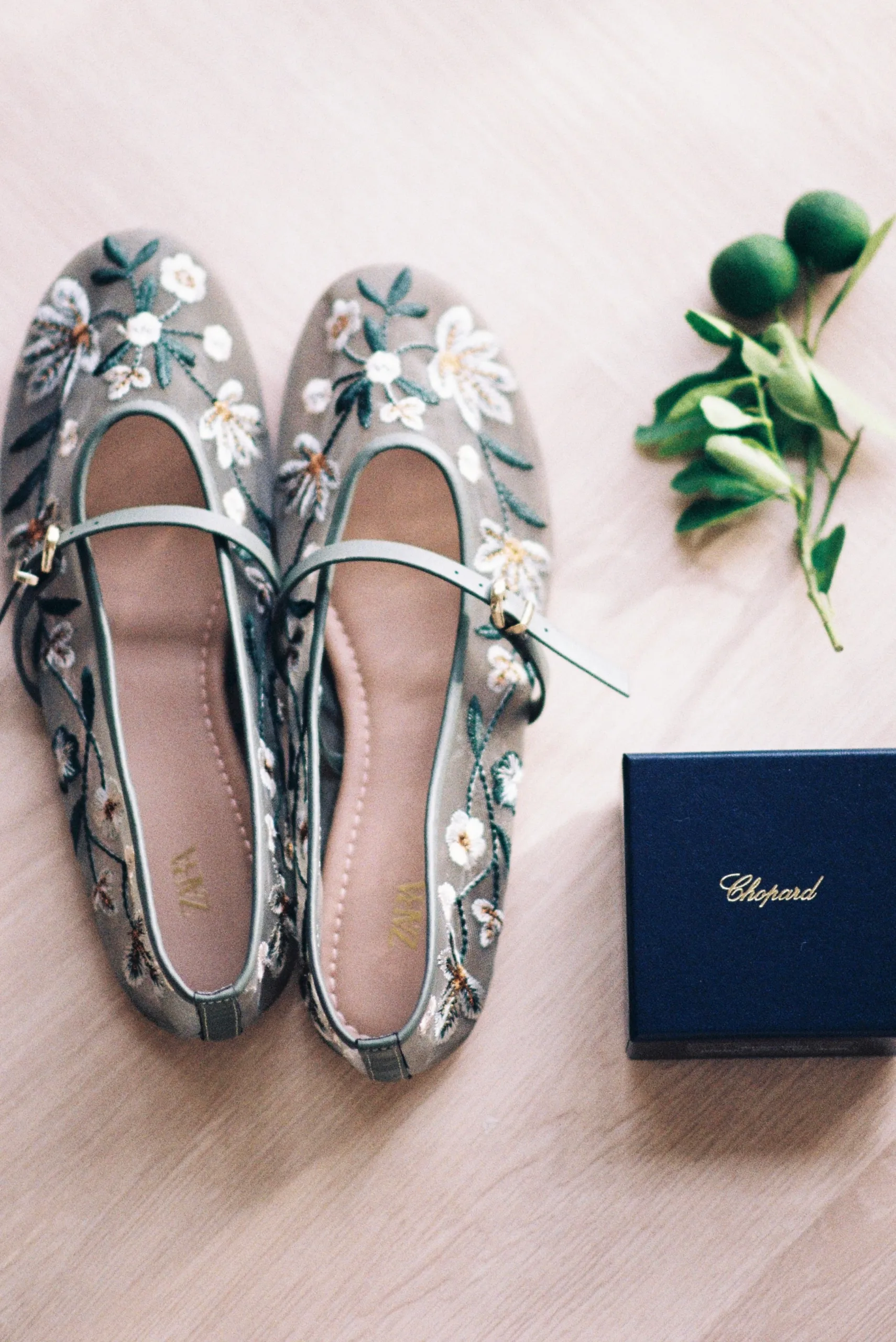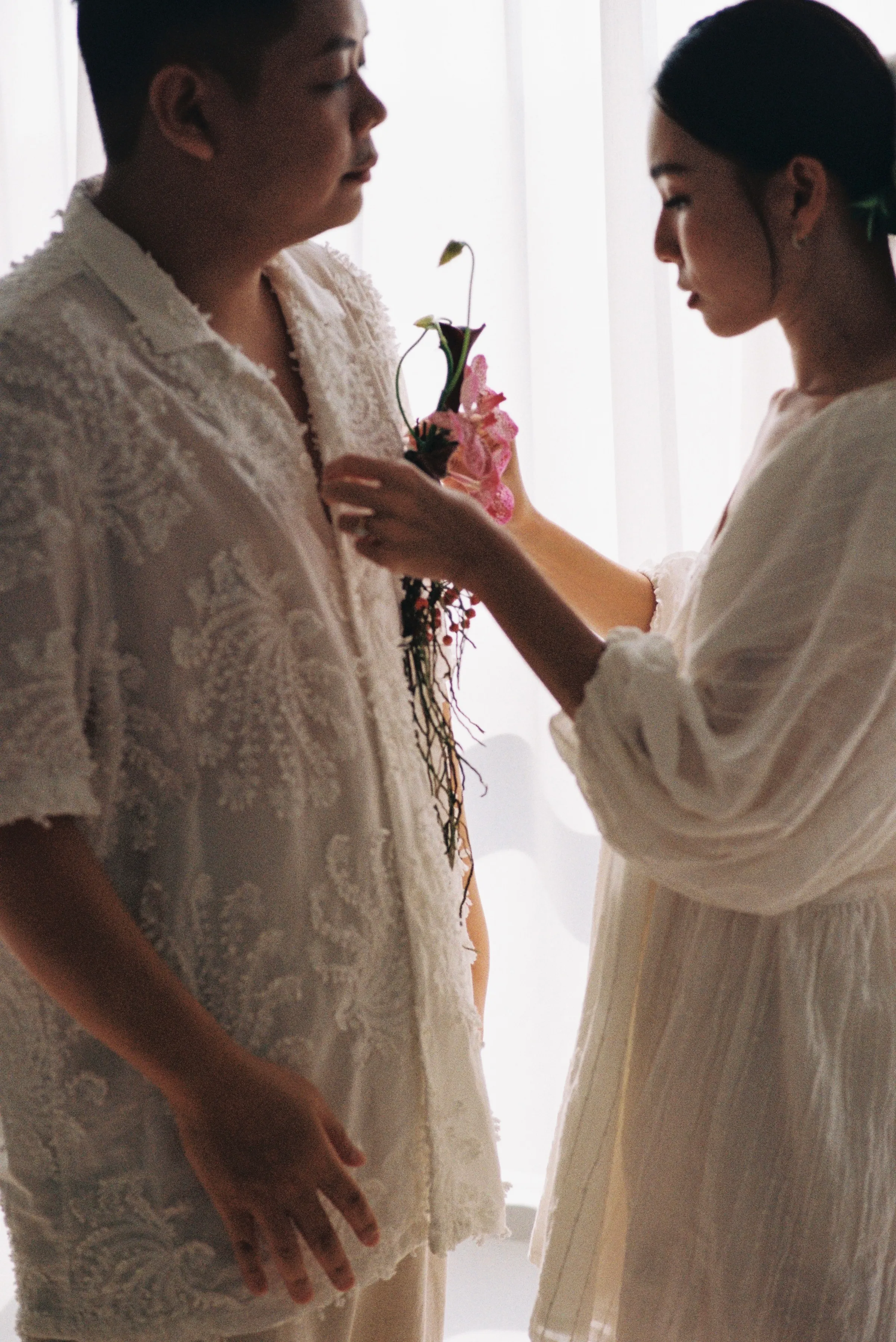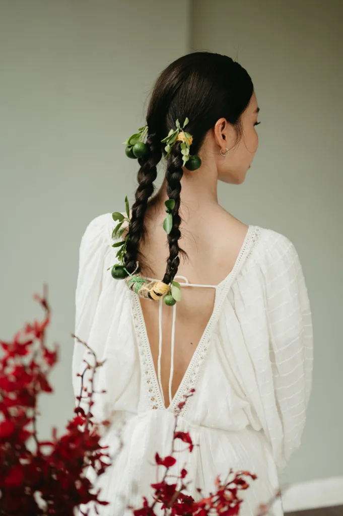 The bride wore a breezy, ivory textured dress featuring a V-neckline and long balloon sleeves. The ensemble’s softness was balanced by her stunning hair detail: twin braids intertwined with miniature green citrus fruits and fresh greenery, evoking a whimsical, folkloric aesthetic rooted in nature. Her look was minimalist—artful with a personal twist. Zu He complemented her with an off-white embroidered shirt featuring intricate floral motifs, paired with cream trousers. The tactile fabric choices from both bride and groom echoed their soft and cinematic theme.