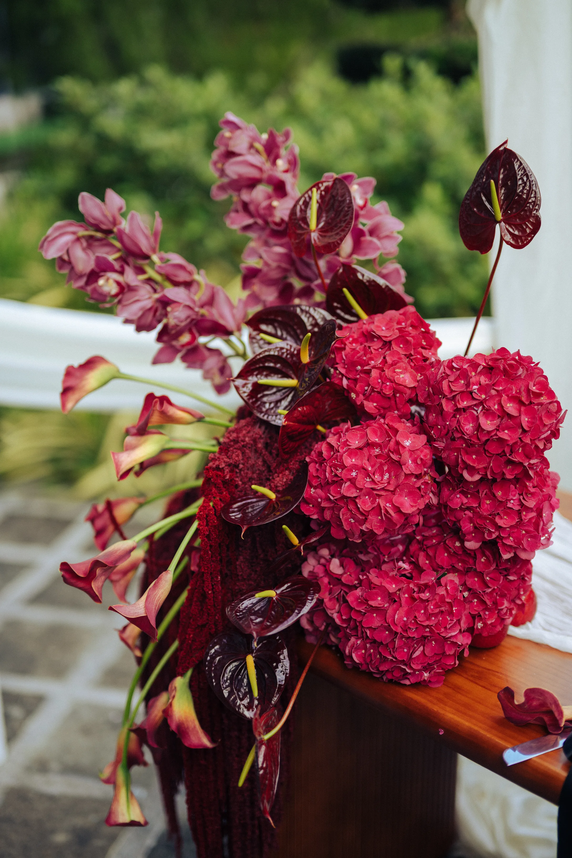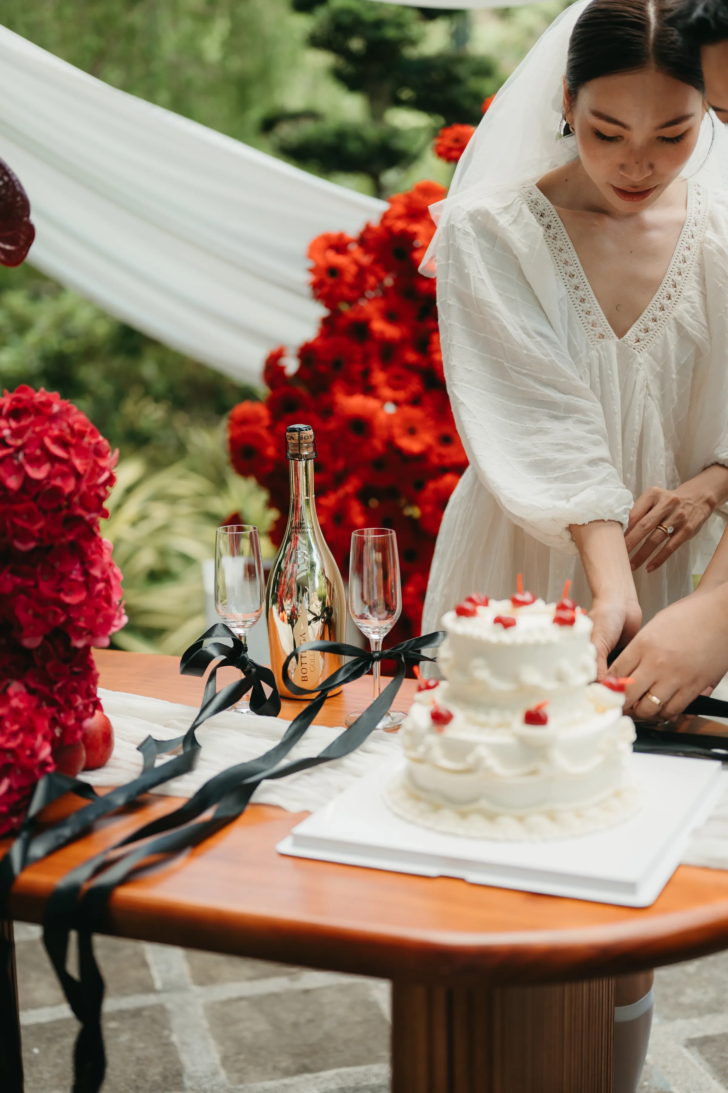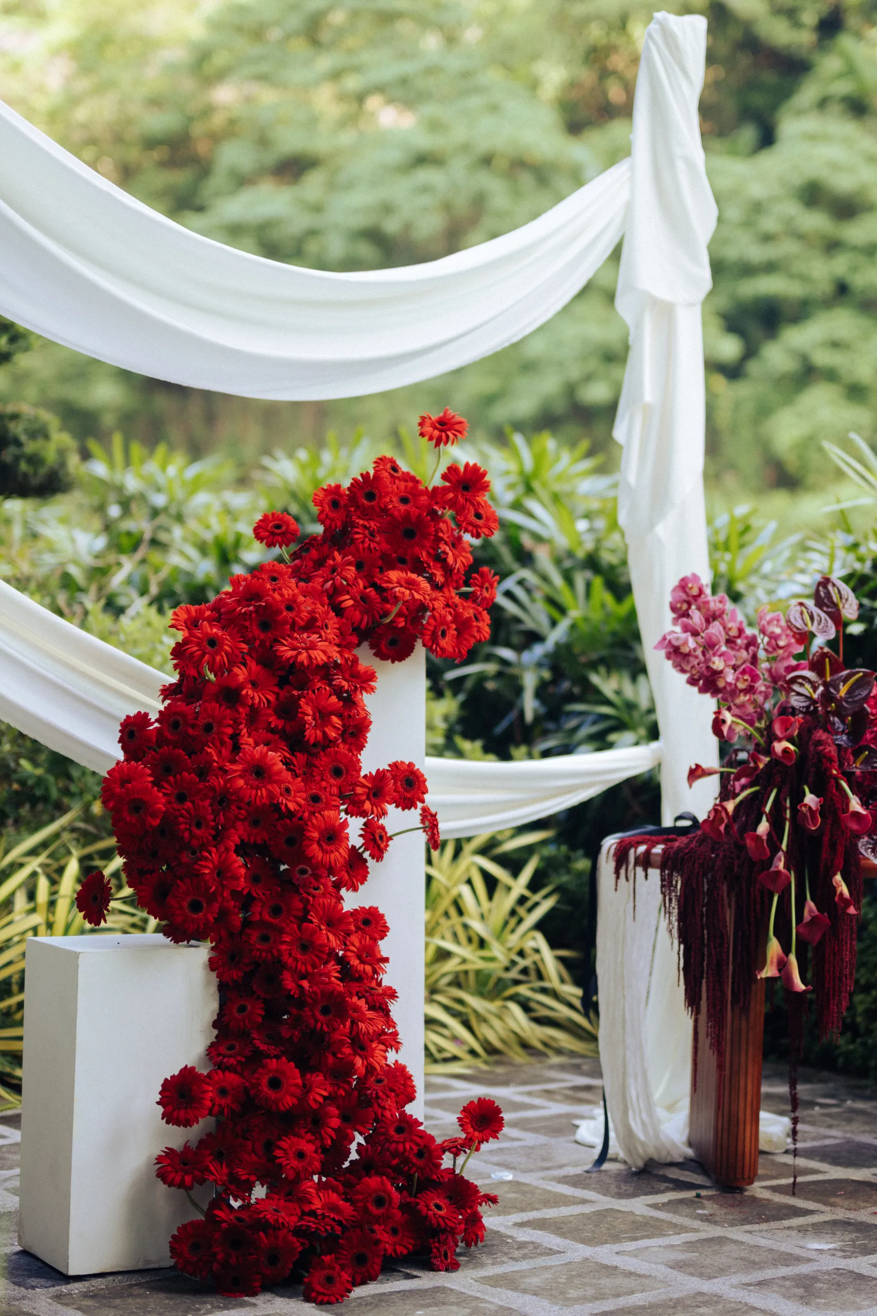 Held in the Japanese garden of their condo, the ceremony space exuded tranquility and character. A lush garden canopy set the backdrop, while the décor layered tones of crimson, soft ivory, and deep burgundy. Floral arrangements were bold yet refined—cascading red amaranthus, deep pink hydrangeas, calla lilies, and anthuriums provided dramatic texture. These florals introduced a romantic palette of ruby and plum tones that stood out vibrantly against the ivory draping.
