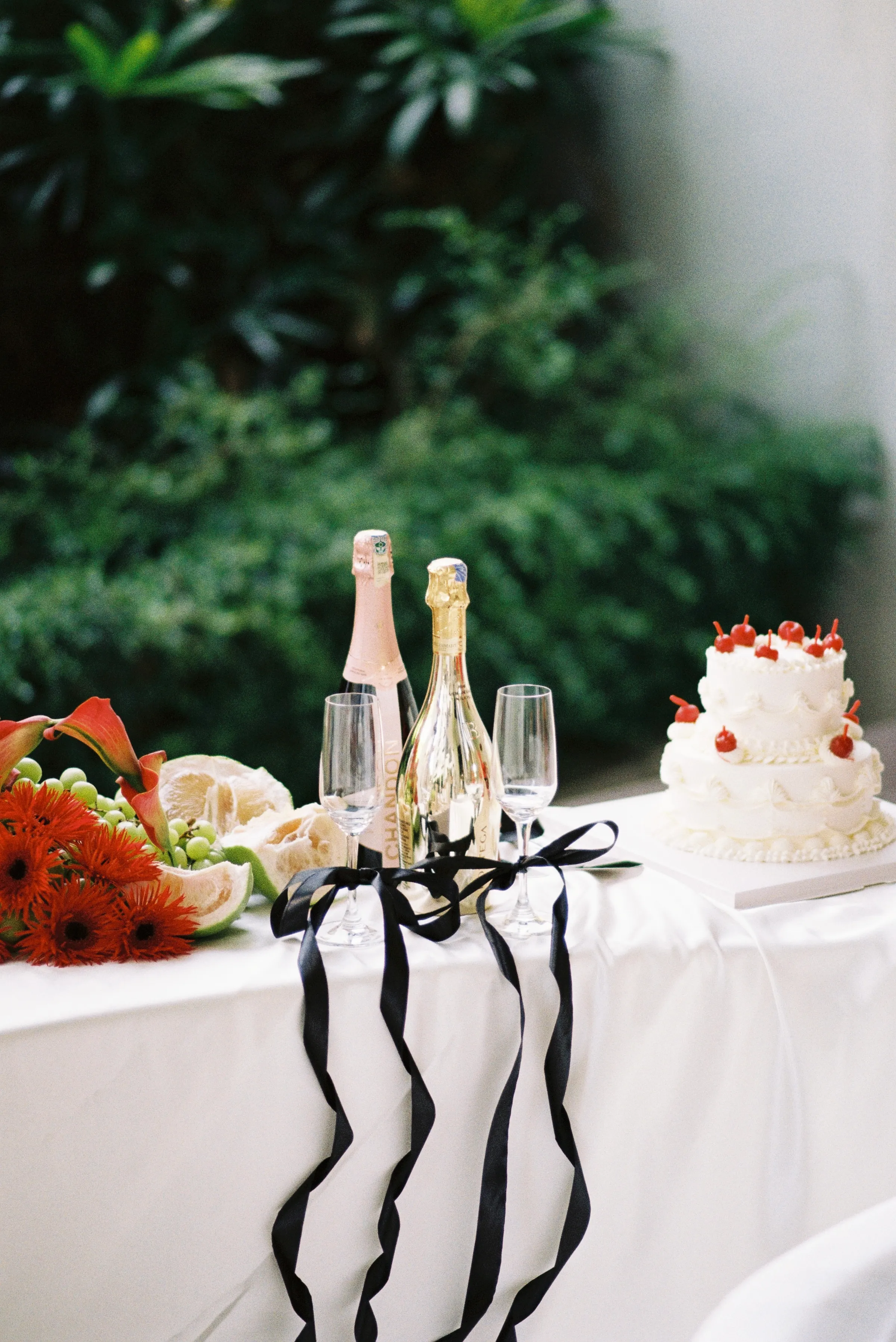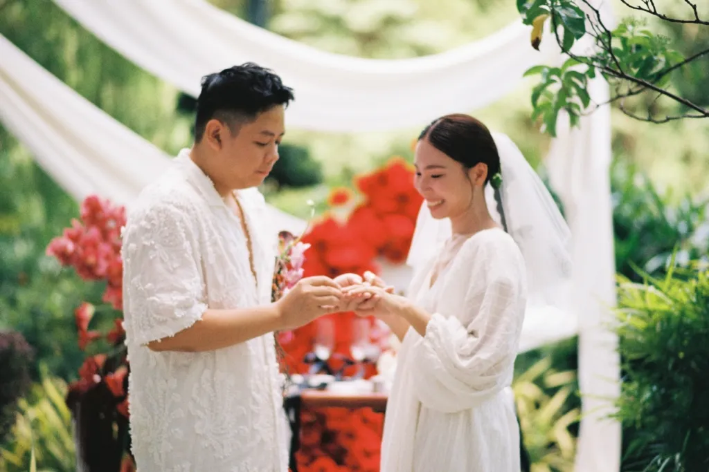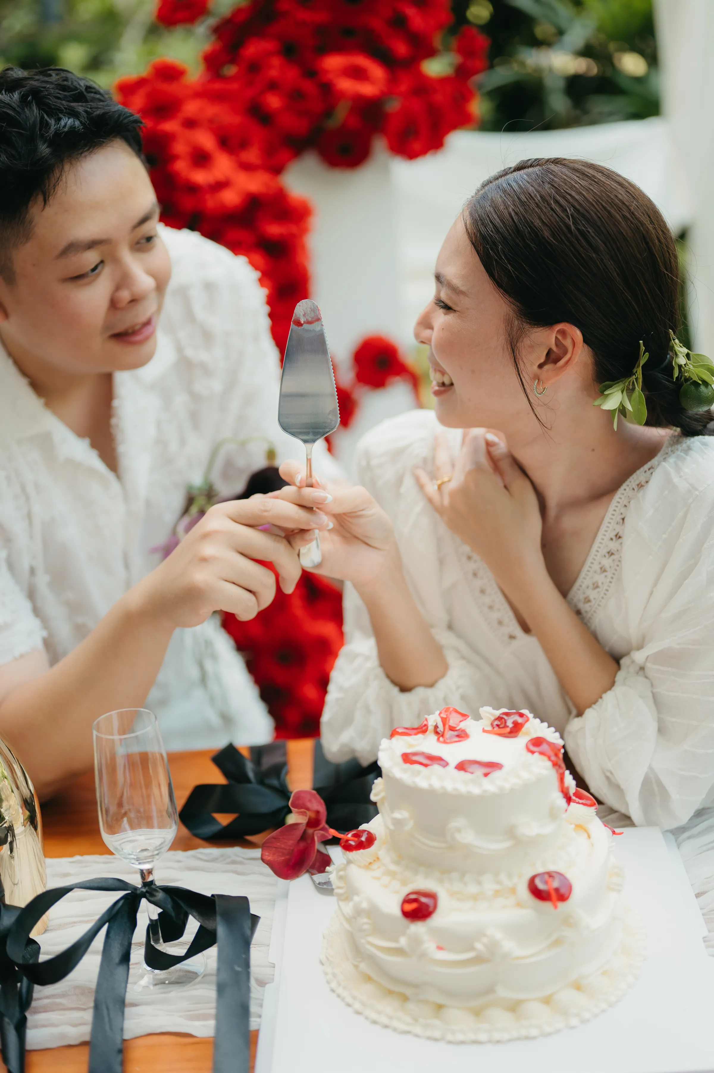 Held in the Japanese garden of their condo, the ceremony space exuded tranquility and character. A lush garden canopy set the backdrop, while the décor layered tones of crimson, soft ivory, and deep burgundy. Floral arrangements were bold yet refined—cascading red amaranthus, deep pink hydrangeas, calla lilies, and anthuriums provided dramatic texture. These florals introduced a romantic palette of ruby and plum tones that stood out vibrantly against the ivory draping.