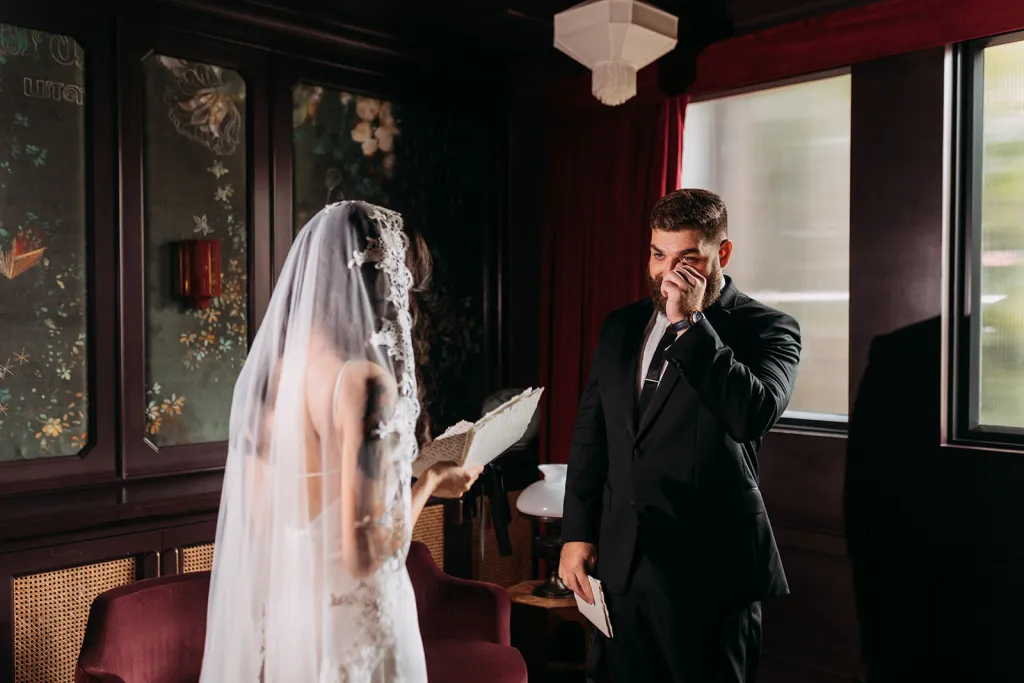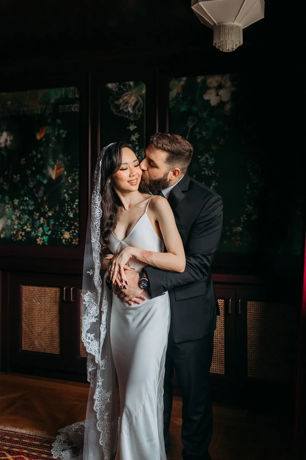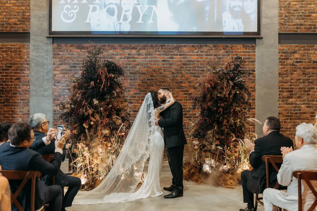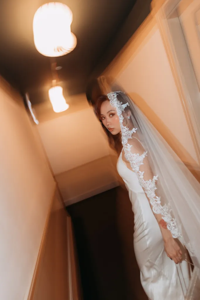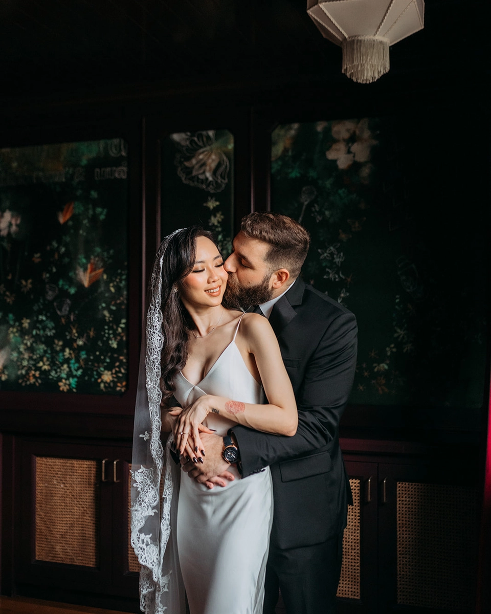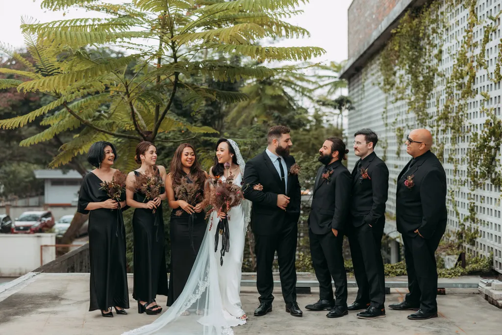 Robyn, a bubbly advertising exec with a touch of goth flair, and Mitch, a chill software engineer, tied the knot in an intimate, personality-packed celebration that’s sure to inspire. Robyn wore a satin slip gown paired with minimal jewellery and completed her look with a cathedral length lace-trimmed veil for dramatic effect. The groom looked emaculate in a suit, simple black tie and adorable robin cufflinks. The couple shared a private moment exchanging vows at The Chow Kit Hotel – a highlight of the day for both of them, before heading off to their ceremony and reception venue. Bidding adieu to the idea of a lavish hotel ballroom affair, they opted for Metal Bees – a warehouse venue in Kuala Lumpur that offered a blank canvas for their creative ideas.