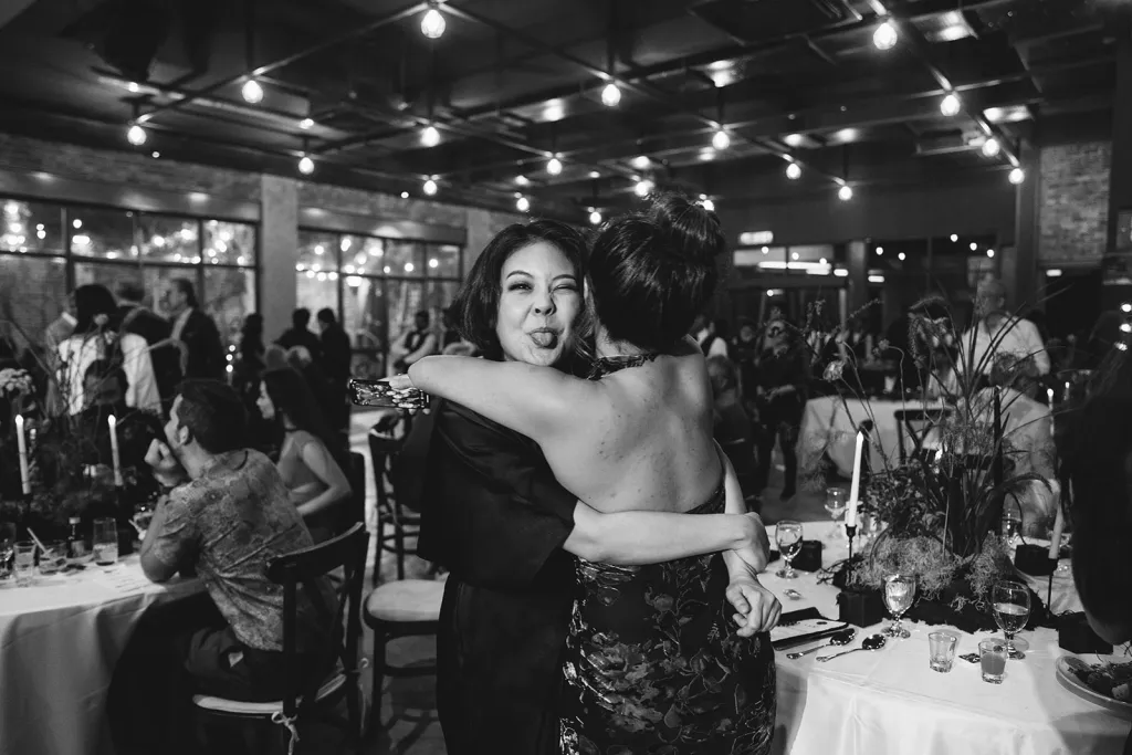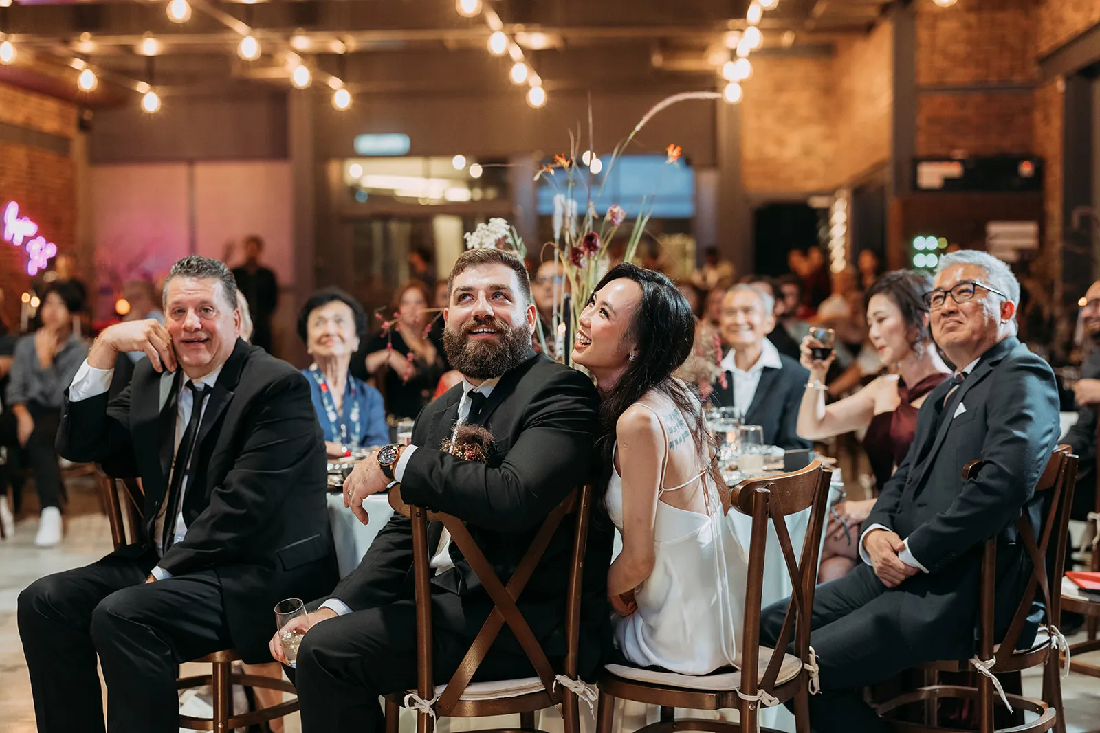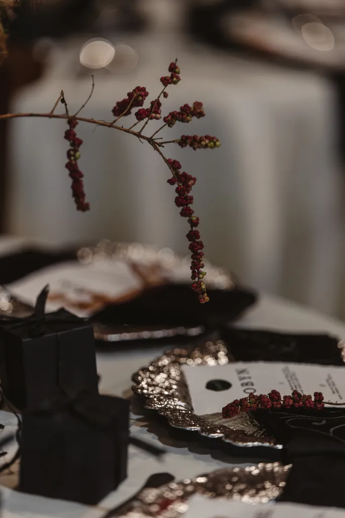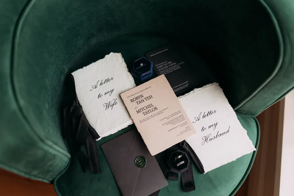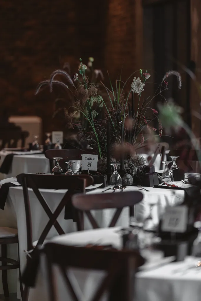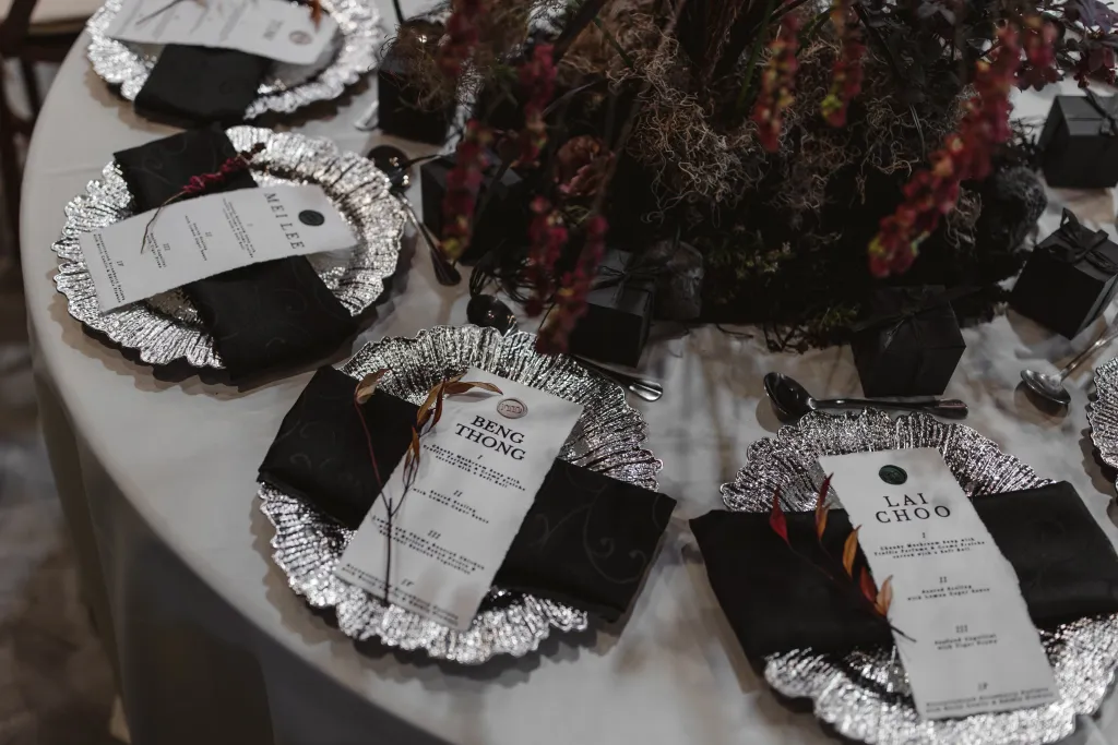 Inviting a cozy crowd of about 80 guests, they stuck to a simple rule: if they hadn’t spoken in a year, no invite (with a few exceptions for the parents of the bride and groom). Metal Bees, with its bare bones charm and three distinct spaces, was the perfect setting for their ‘Dark Academia’ themed wedding, a blend of black elegance, cozy vibes, and striking floral arrangements – a central piece in their minimal yet impactful decor, artfully arranged by Za Huo Hang, creating an ambiance that one guest likened to a “My Chemical Romance wedding.”.