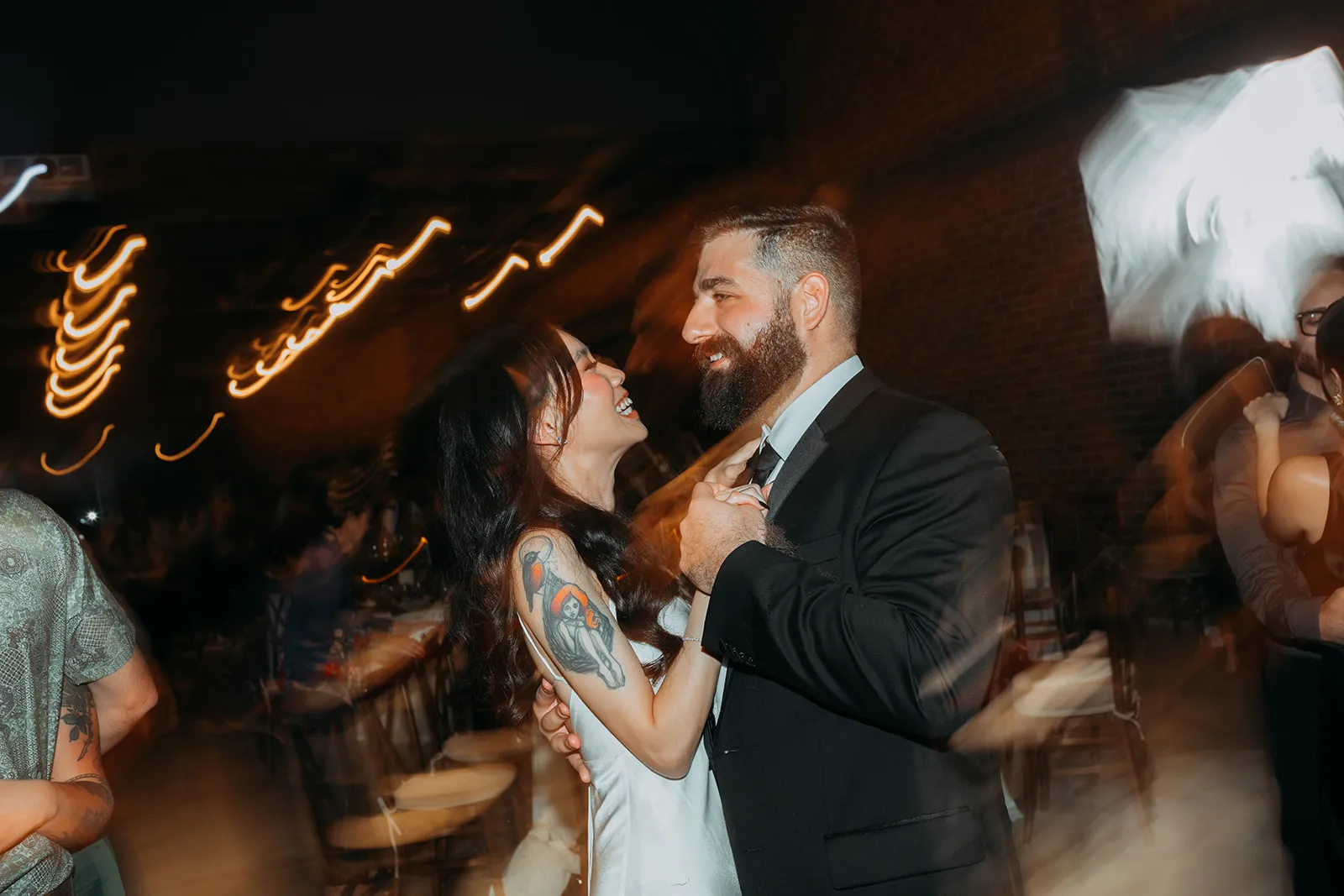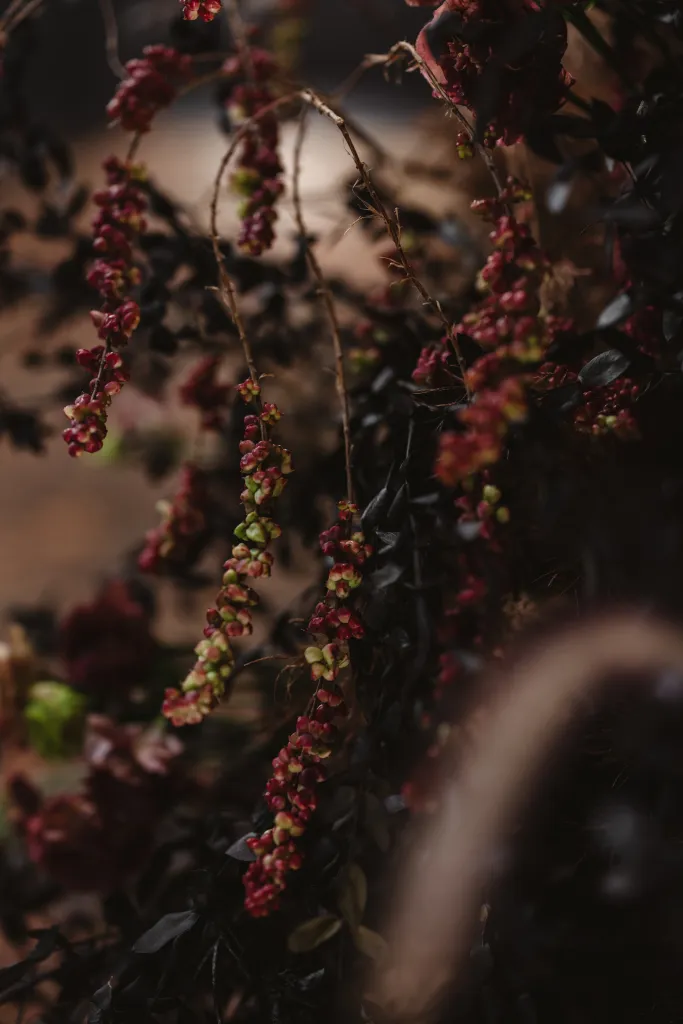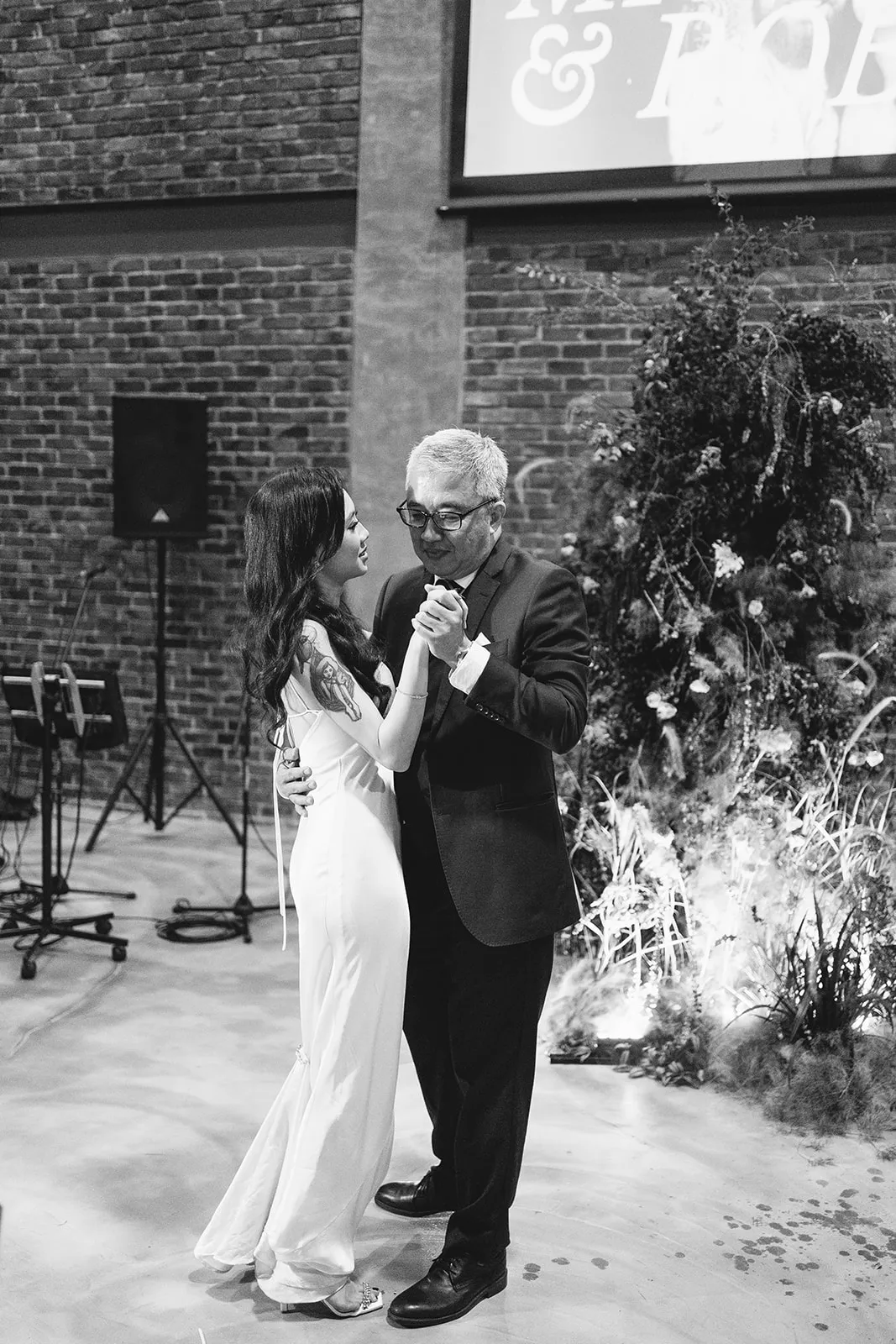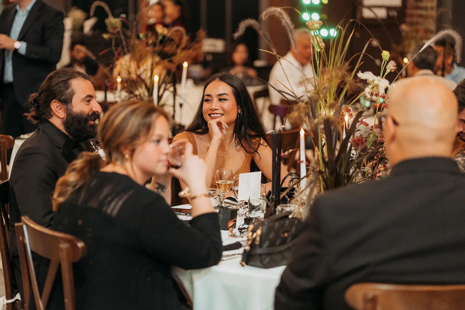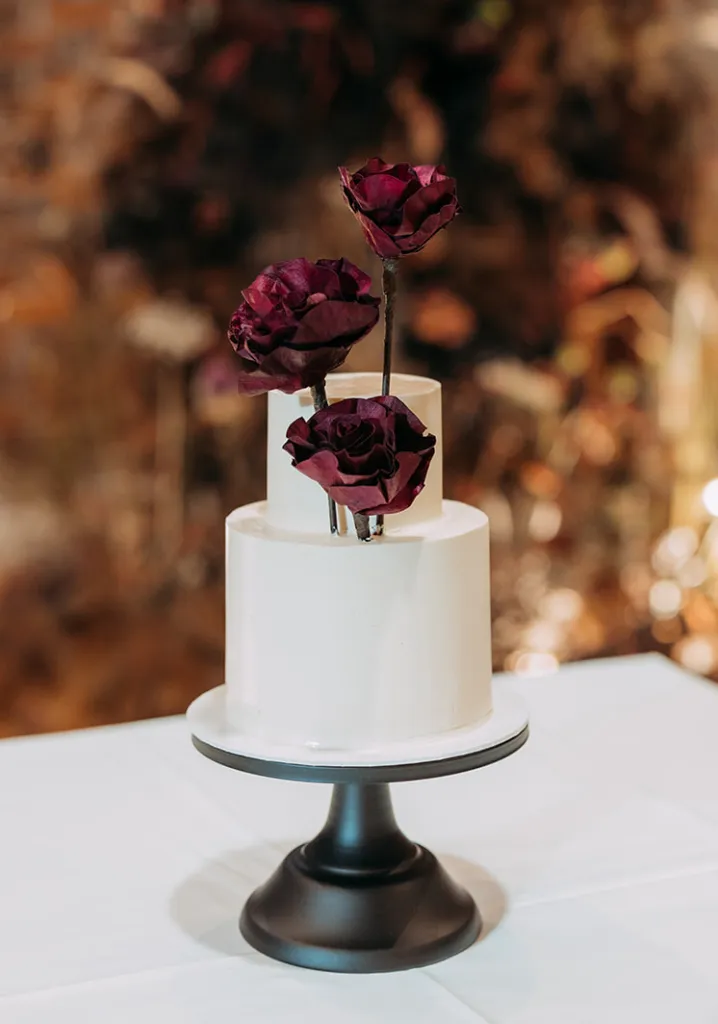 Inviting a cozy crowd of about 80 guests, they stuck to a simple rule: if they hadn’t spoken in a year, no invite (with a few exceptions for the parents of the bride and groom). Metal Bees, with its bare bones charm and three distinct spaces, was the perfect setting for their ‘Dark Academia’ themed wedding, a blend of black elegance, cozy vibes, and striking floral arrangements – a central piece in their minimal yet impactful decor, artfully arranged by Za Huo Hang, creating an ambiance that one guest likened to a “My Chemical Romance wedding.”.