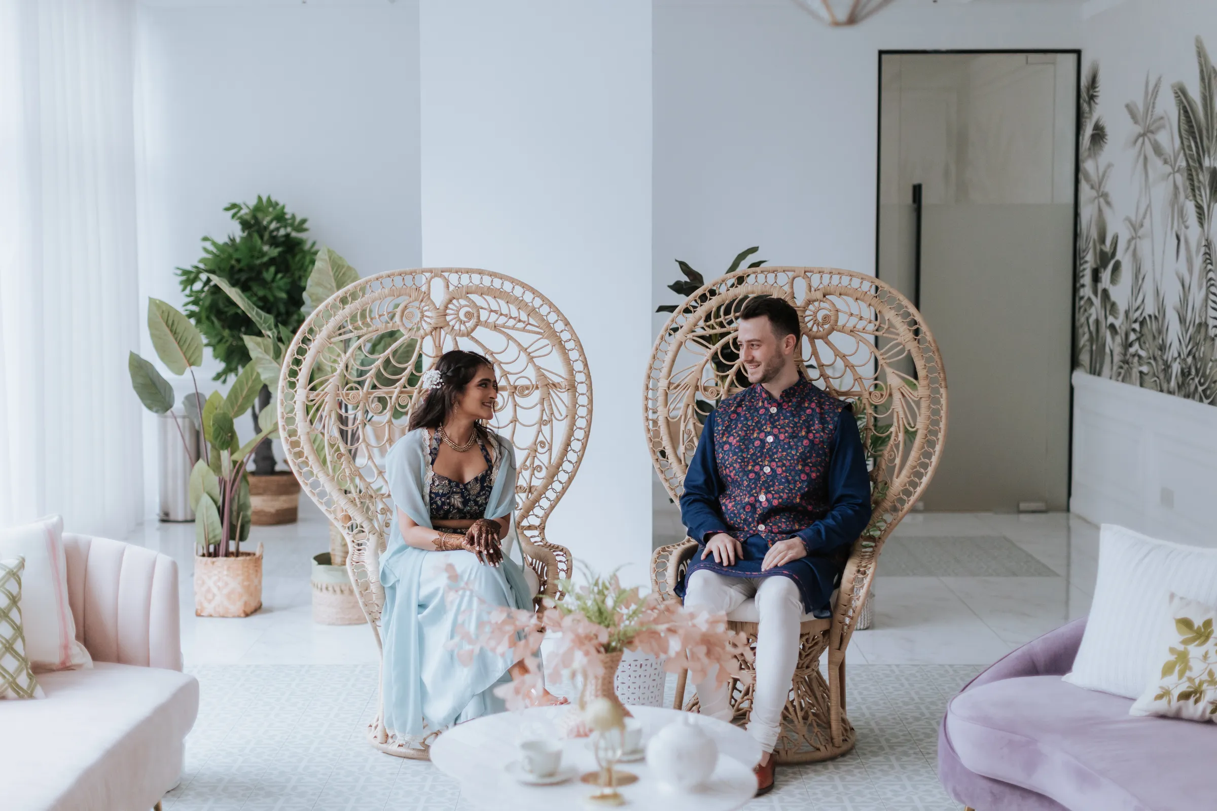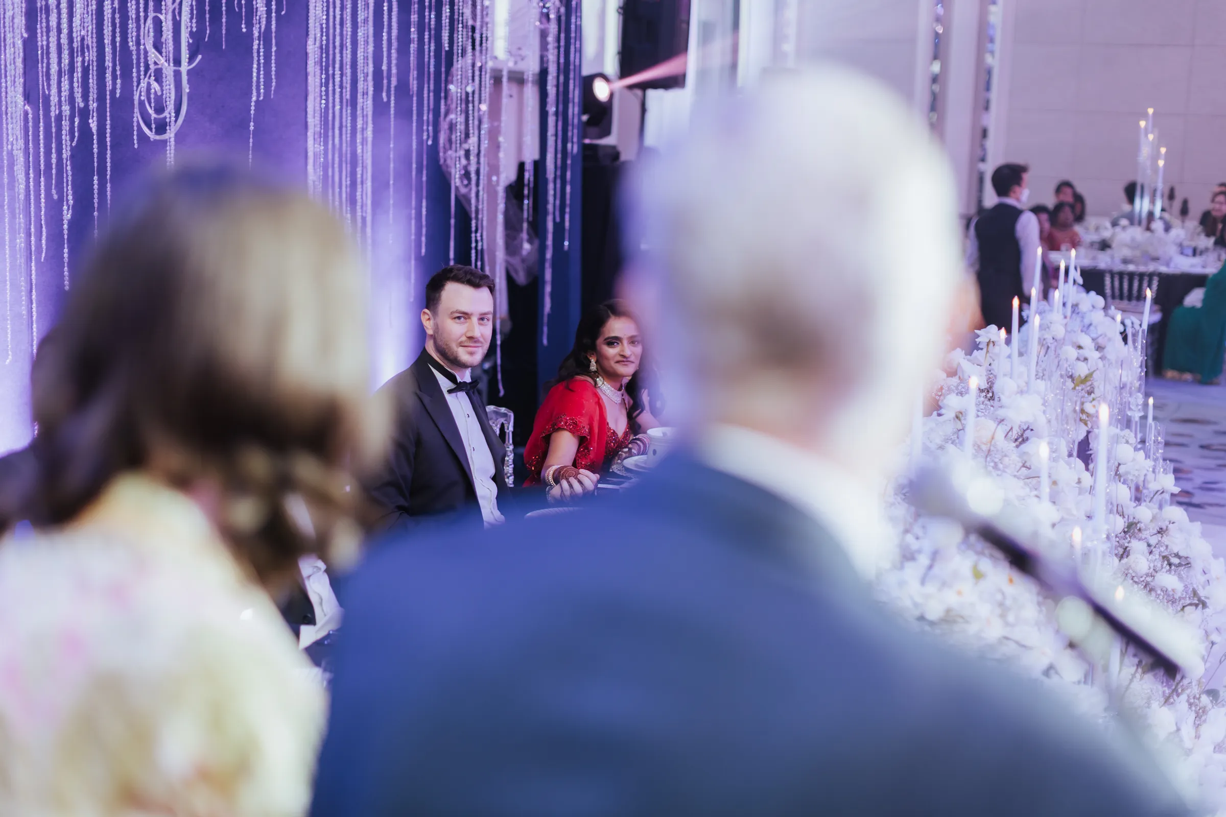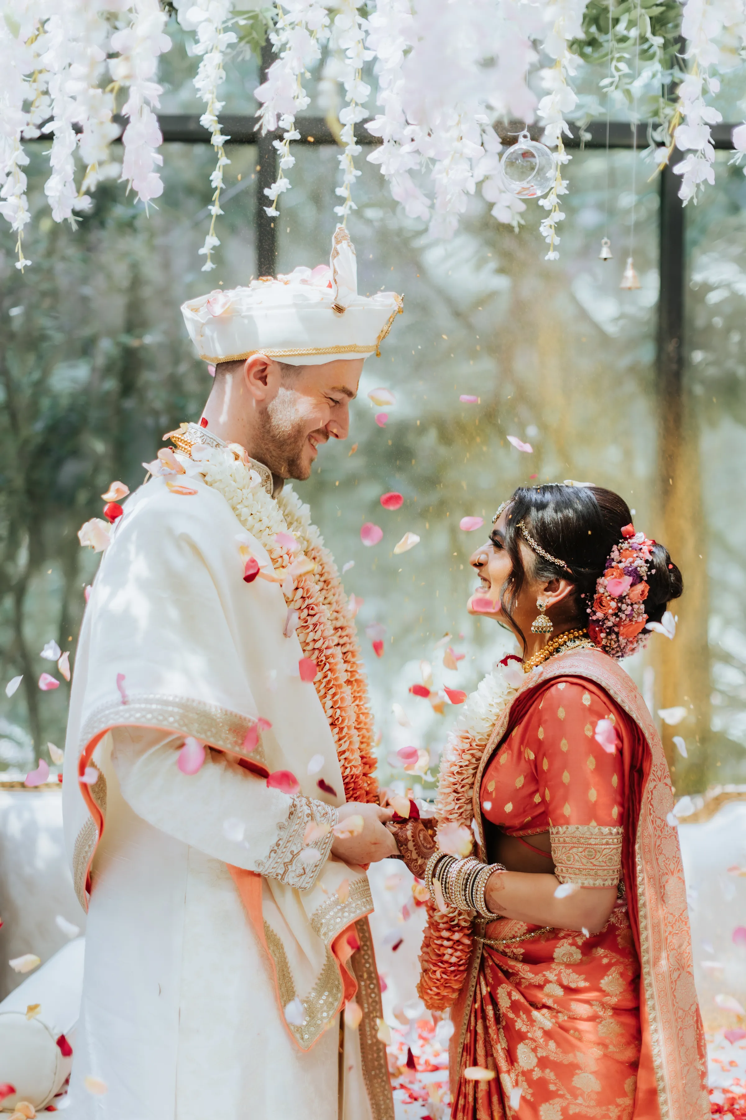 Taking inspiration from the Netflix series Bridgerton, Shaleen infused a touch of English countryside spring into their traditional reception at The Glasshouse. Pastel hues and abundant floral arrangements adorned the venue, evoking a sense of romance. While the decor exuded English spring beauty, Shaleen and James opted to don traditional Indian attire acquired from India itself. James looked dashing in a Sherwani, completing his ensemble with a Wedding Turban that matched his suit. Shaleen had the pleasure of wearing two exquisite Sarees on this special day. She made her grand entrance in a custom bridal Saree of her own choosing before changing into another magnificent piece, gifted to her by the groom as a customary symbol of their union.