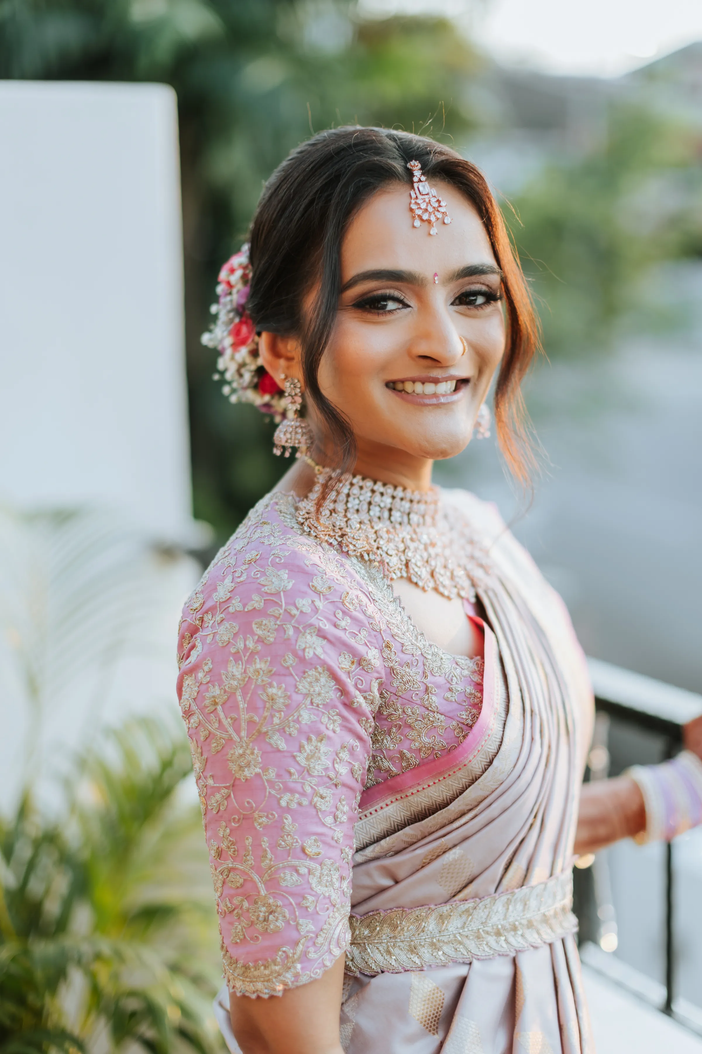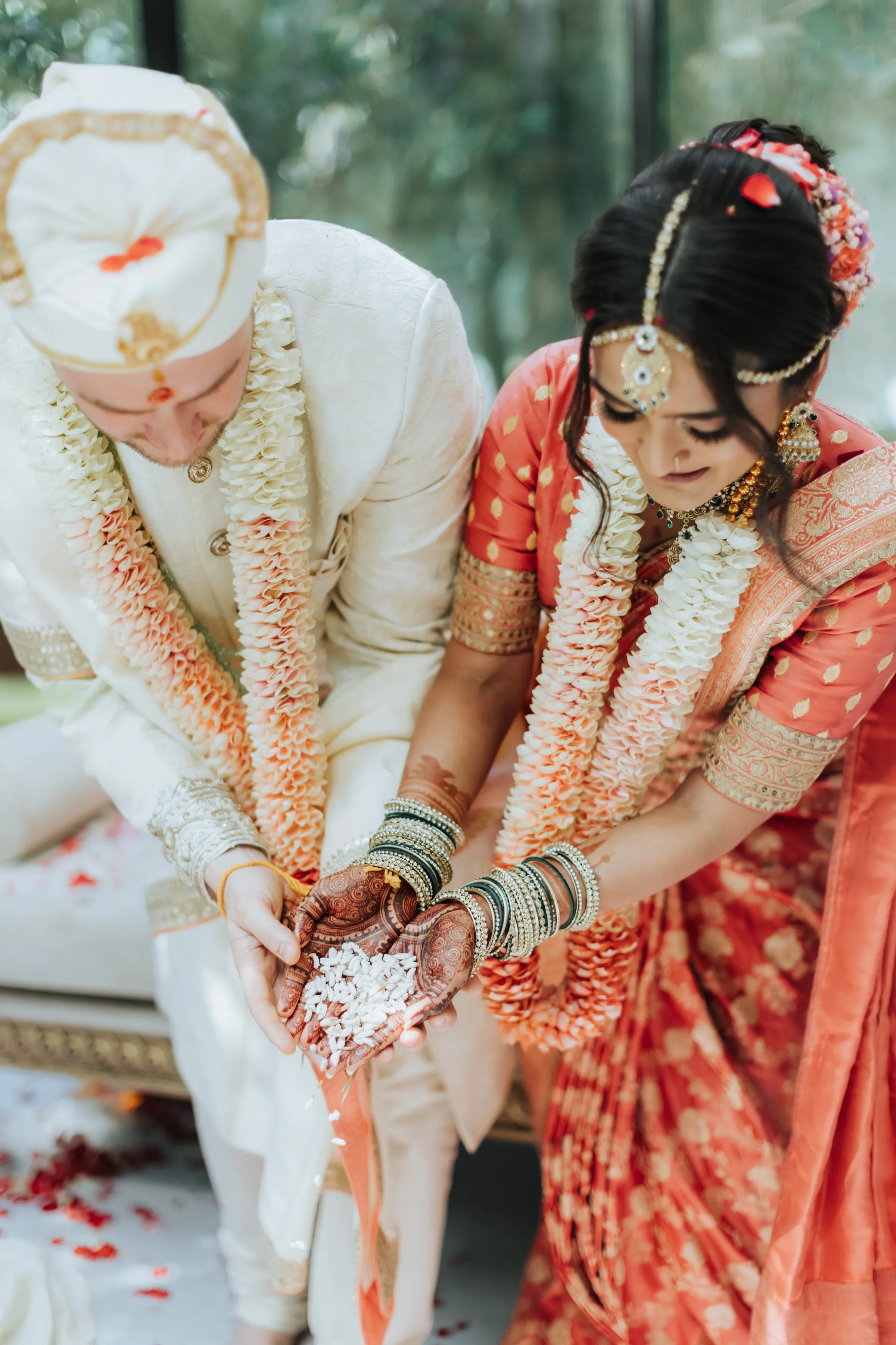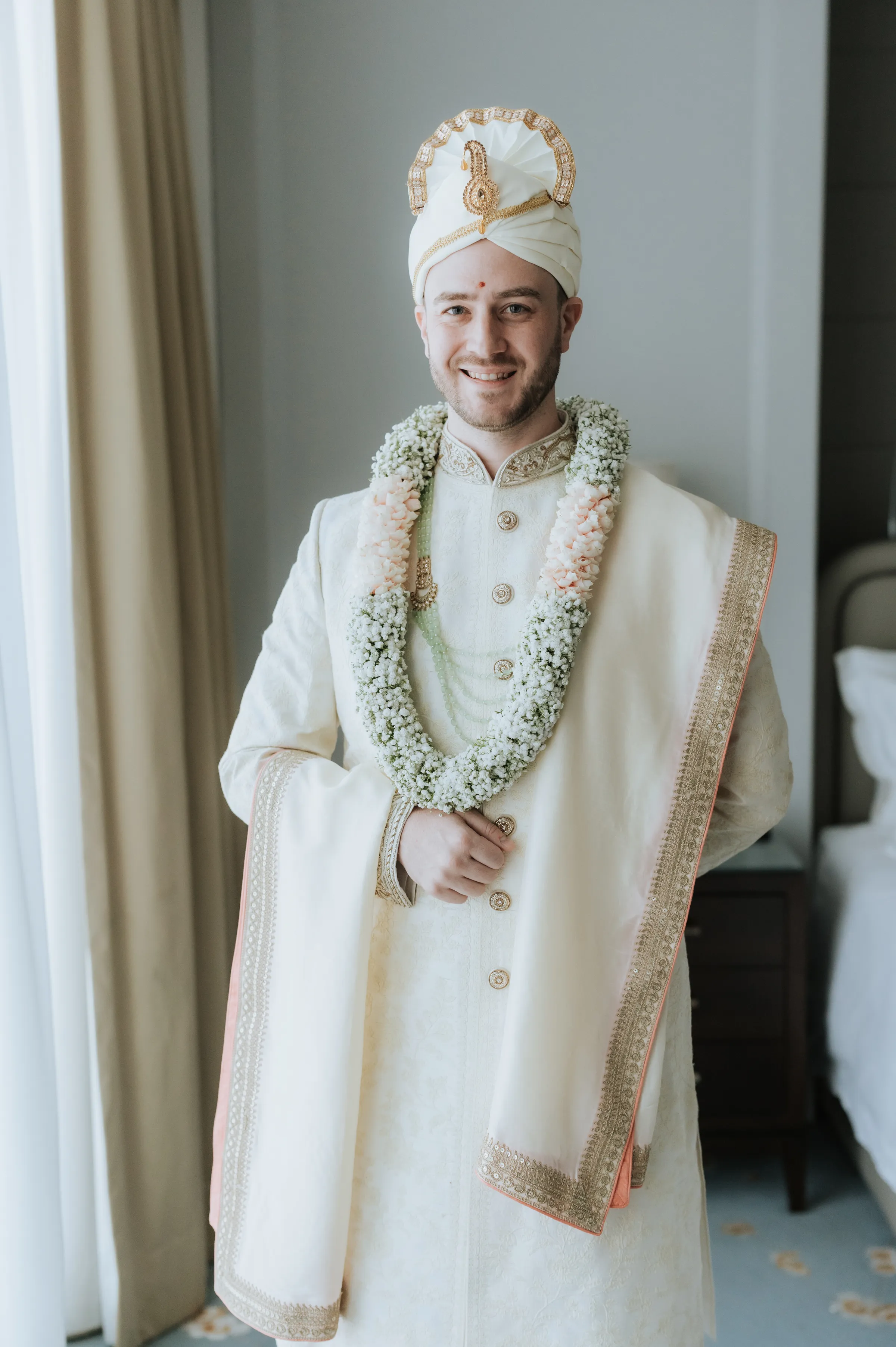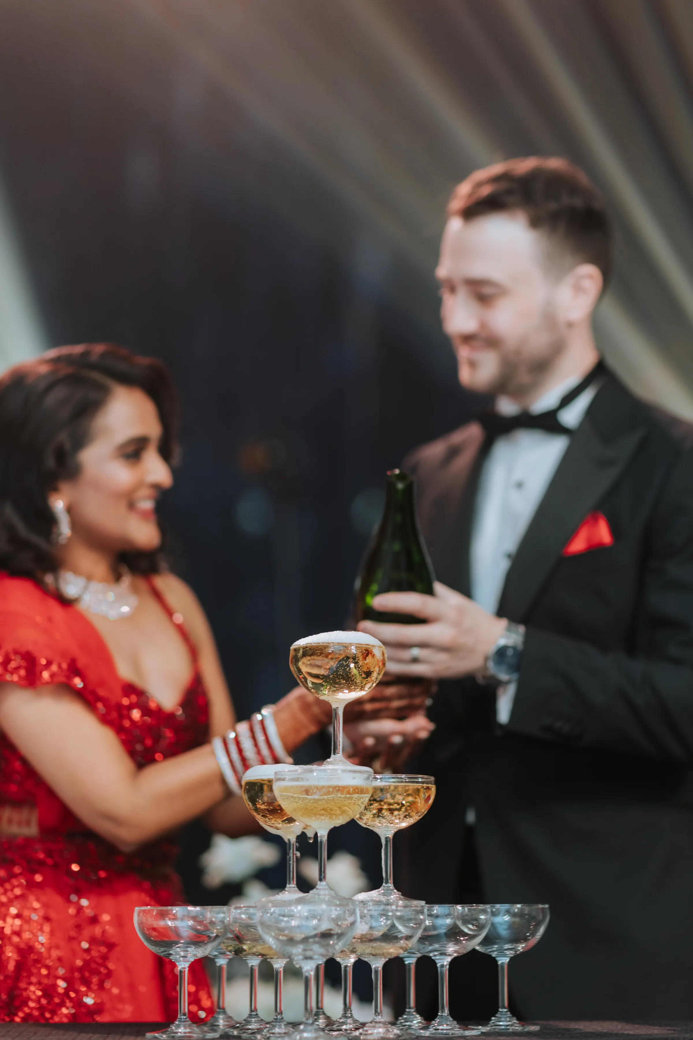 Taking inspiration from the Netflix series Bridgerton, Shaleen infused a touch of English countryside spring into their traditional reception at The Glasshouse. Pastel hues and abundant floral arrangements adorned the venue, evoking a sense of romance. While the decor exuded English spring beauty, Shaleen and James opted to don traditional Indian attire acquired from India itself. James looked dashing in a Sherwani, completing his ensemble with a Wedding Turban that matched his suit. Shaleen had the pleasure of wearing two exquisite Sarees on this special day. She made her grand entrance in a custom bridal Saree of her own choosing before changing into another magnificent piece, gifted to her by the groom as a customary symbol of their union.