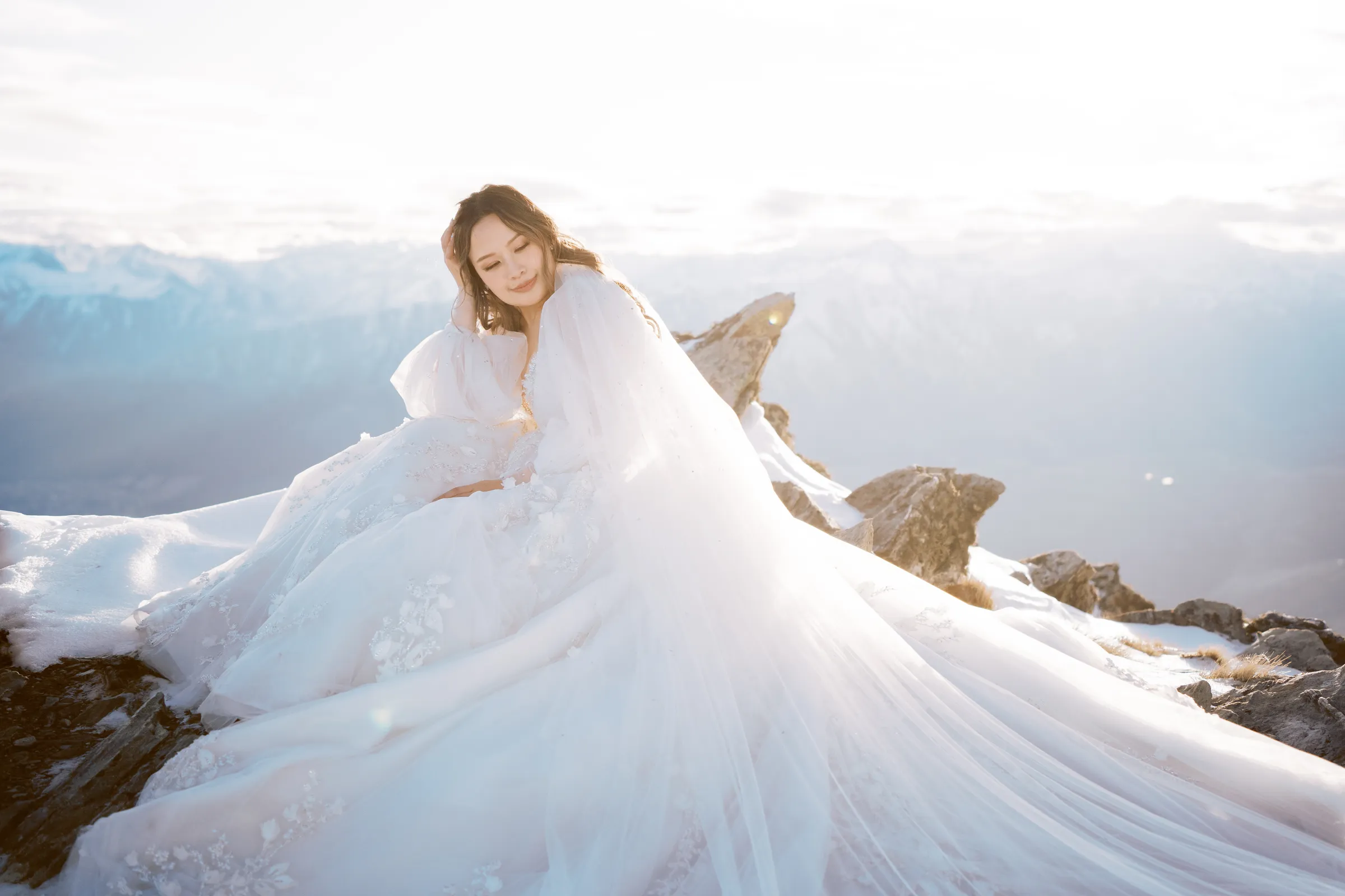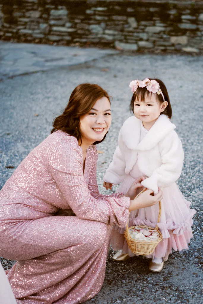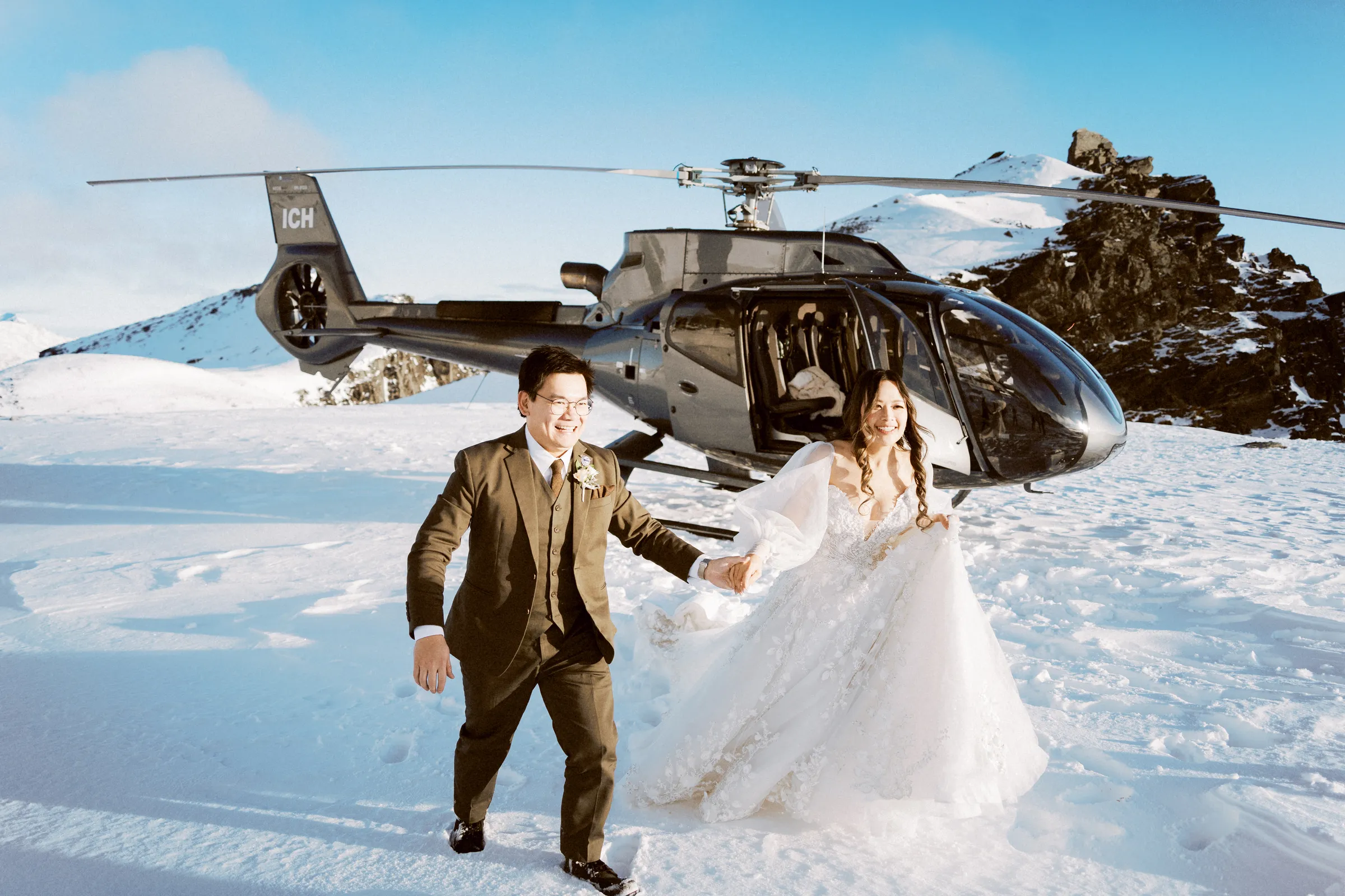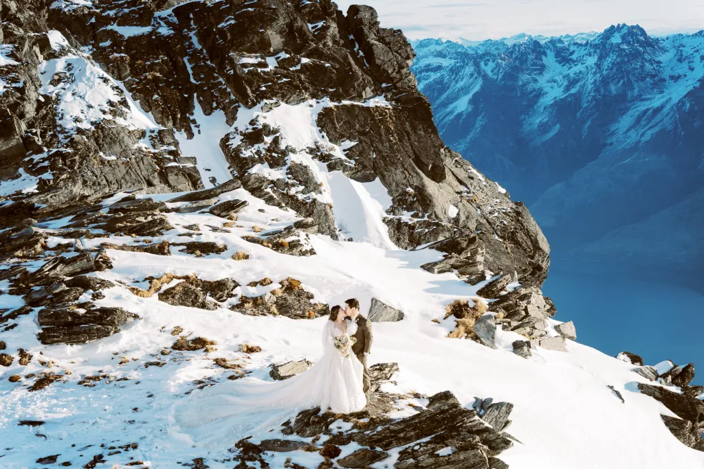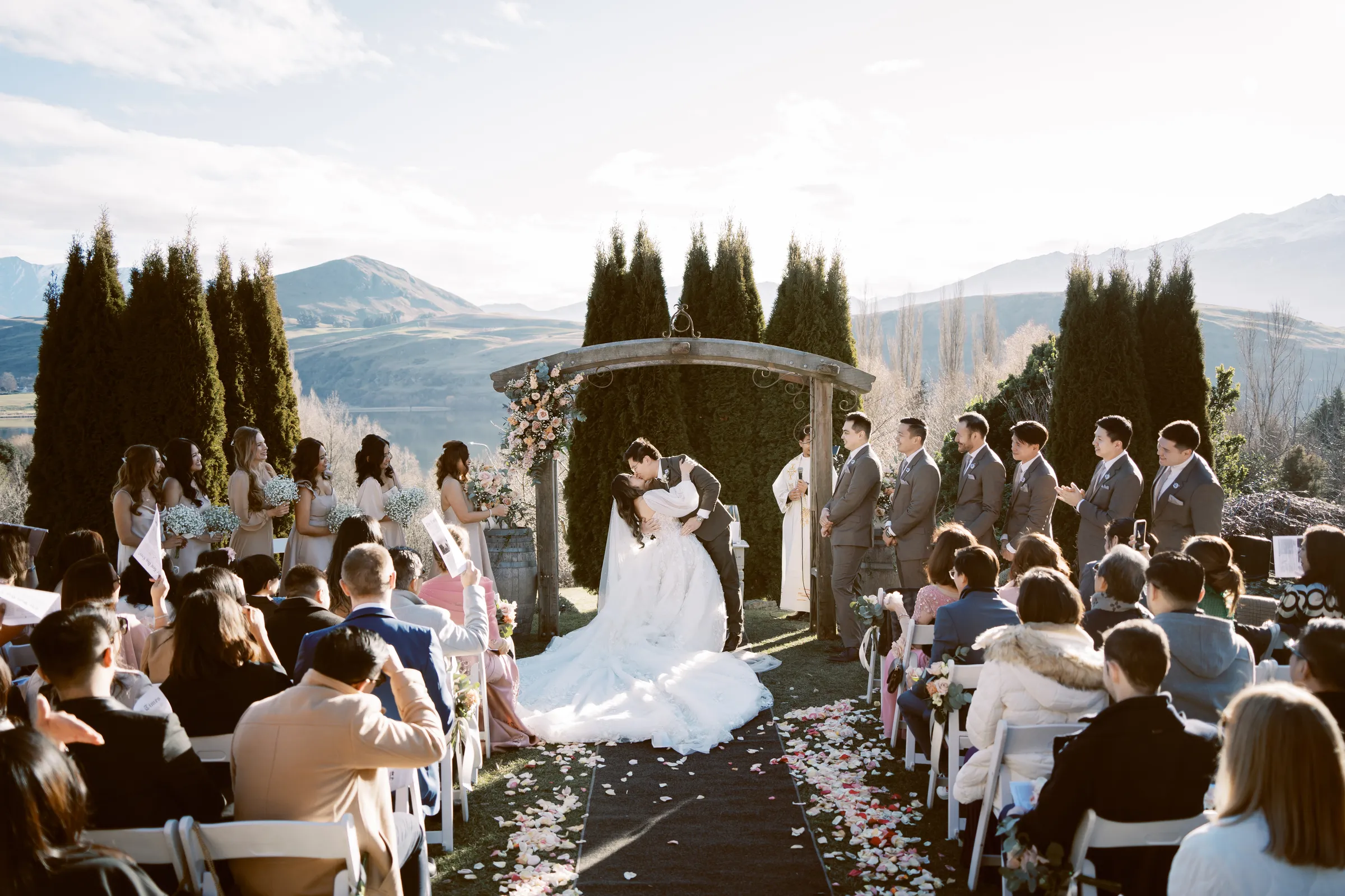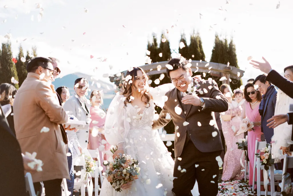 The day blessed them with the warmest weather of the month – clear blue skies and just a whisper of wind. Their Catholic garden ceremony was heartfelt and intimate, filled with joy and laughter. But the adventure didn’t stop there. In a spectacular twist, the newlyweds were whisked away by helicopter to the peak of a The Remarkables for their photoshoot. The image of Mei, in her gorgeous, voluminous gown, fitting into a chopper and being carefully navigated across the snow, will forever be etched in the memories of the two lovebirds.