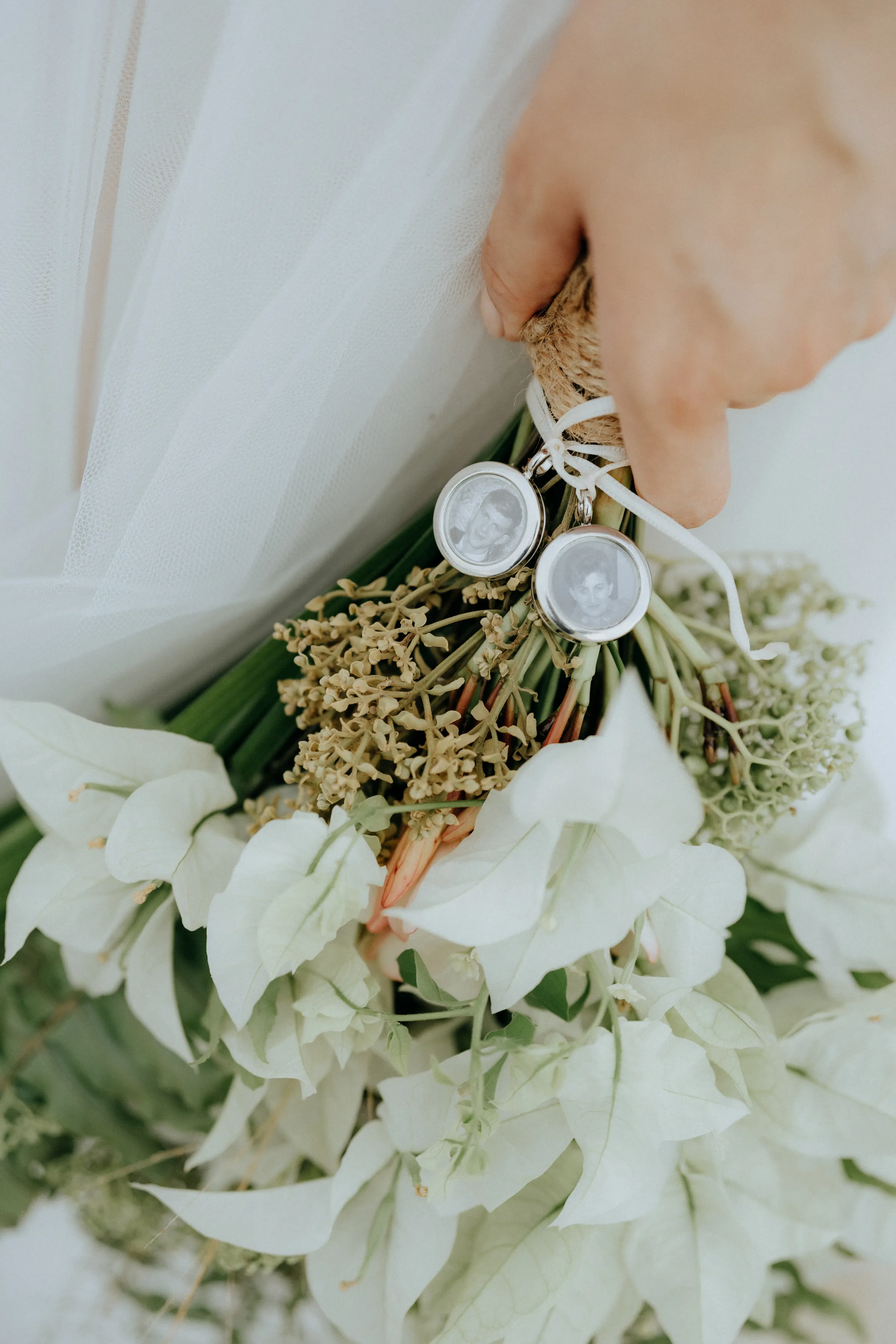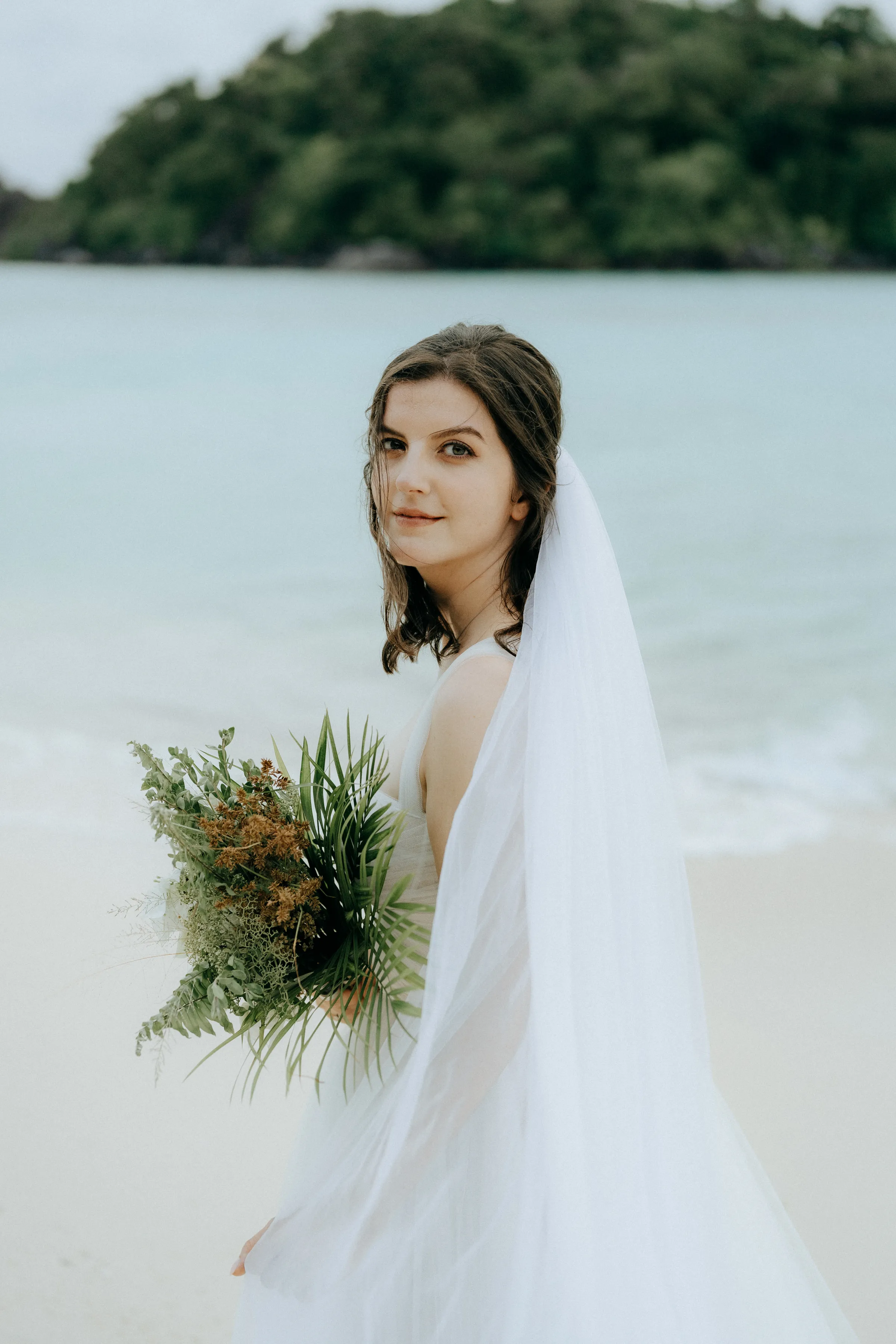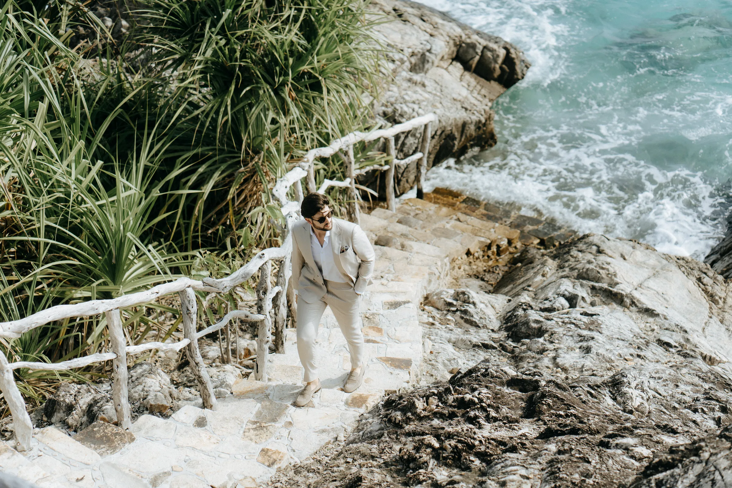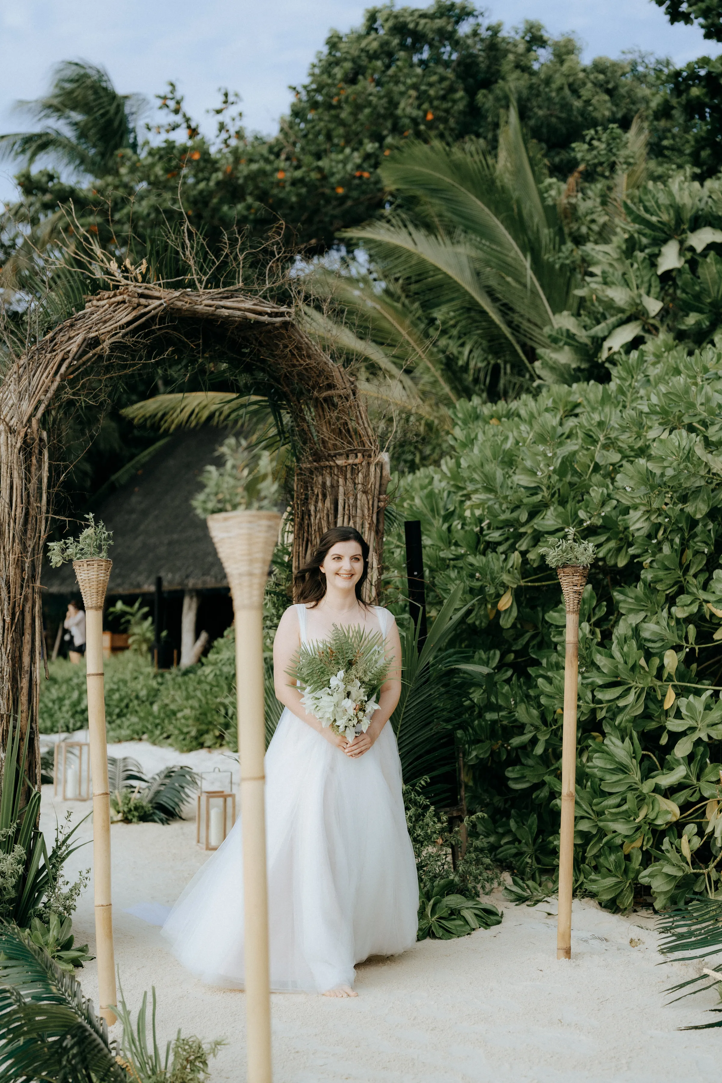 Their wedding at Bawah Reserve, a secluded destination in Indonesia’s Riau Archipelago, reflected their appreciation for nature. A tropical theme, with lush greenery, natural wood accents, and ivory tones, seamlessly blended with the environment. The ceremony’s backdrop—a palm-framed arch on a private island—enhanced the intimacy of the day.