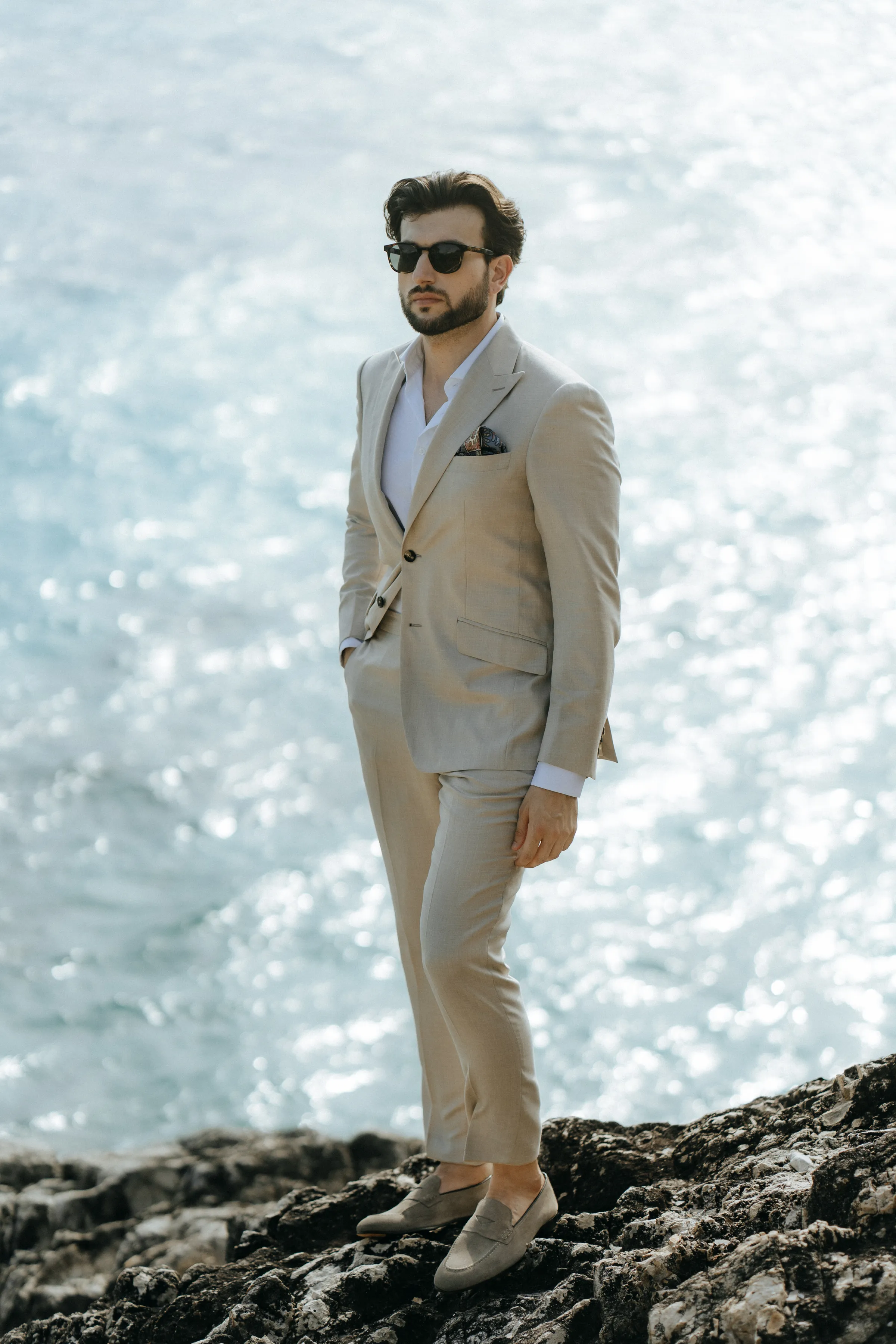 Mariella wore an elegant strapless gown with a flowing tulle skirt, paired with a simple veil and a bouquet featuring memorial charms for her grandparents, added a meaningful personal touch. Mladen complemented her with a light beige suit, a white shirt, and neutral loafers, embodying relaxed sophistication.