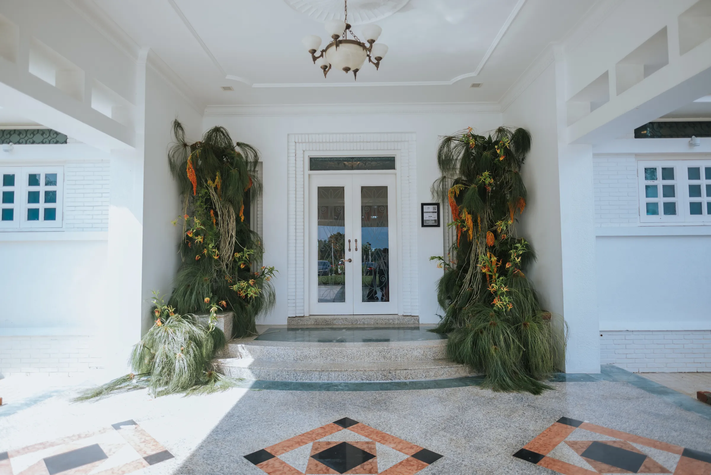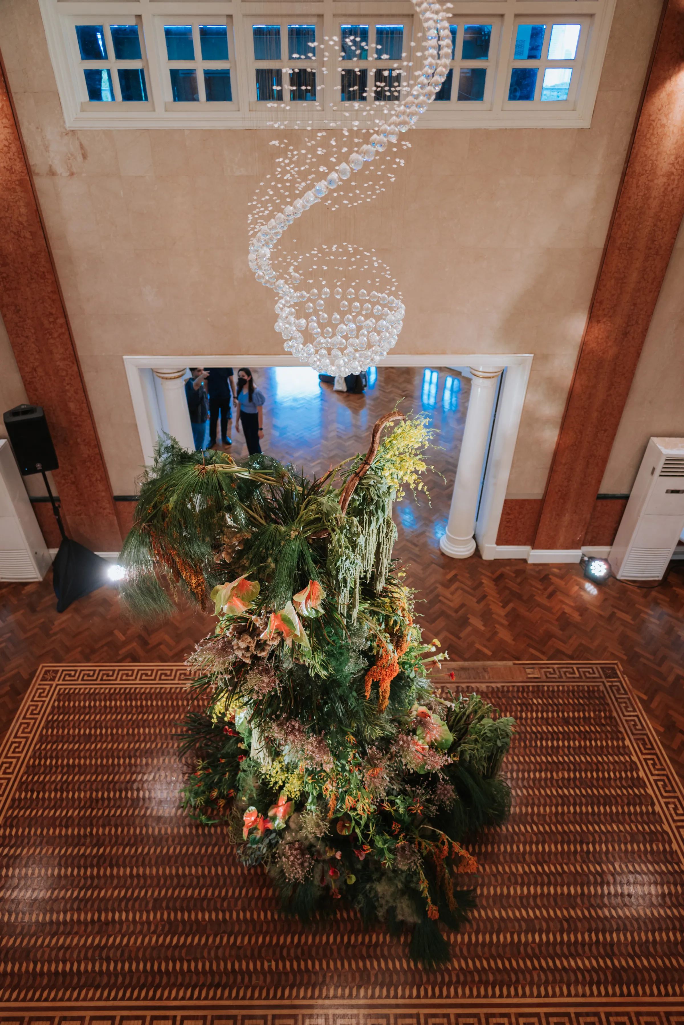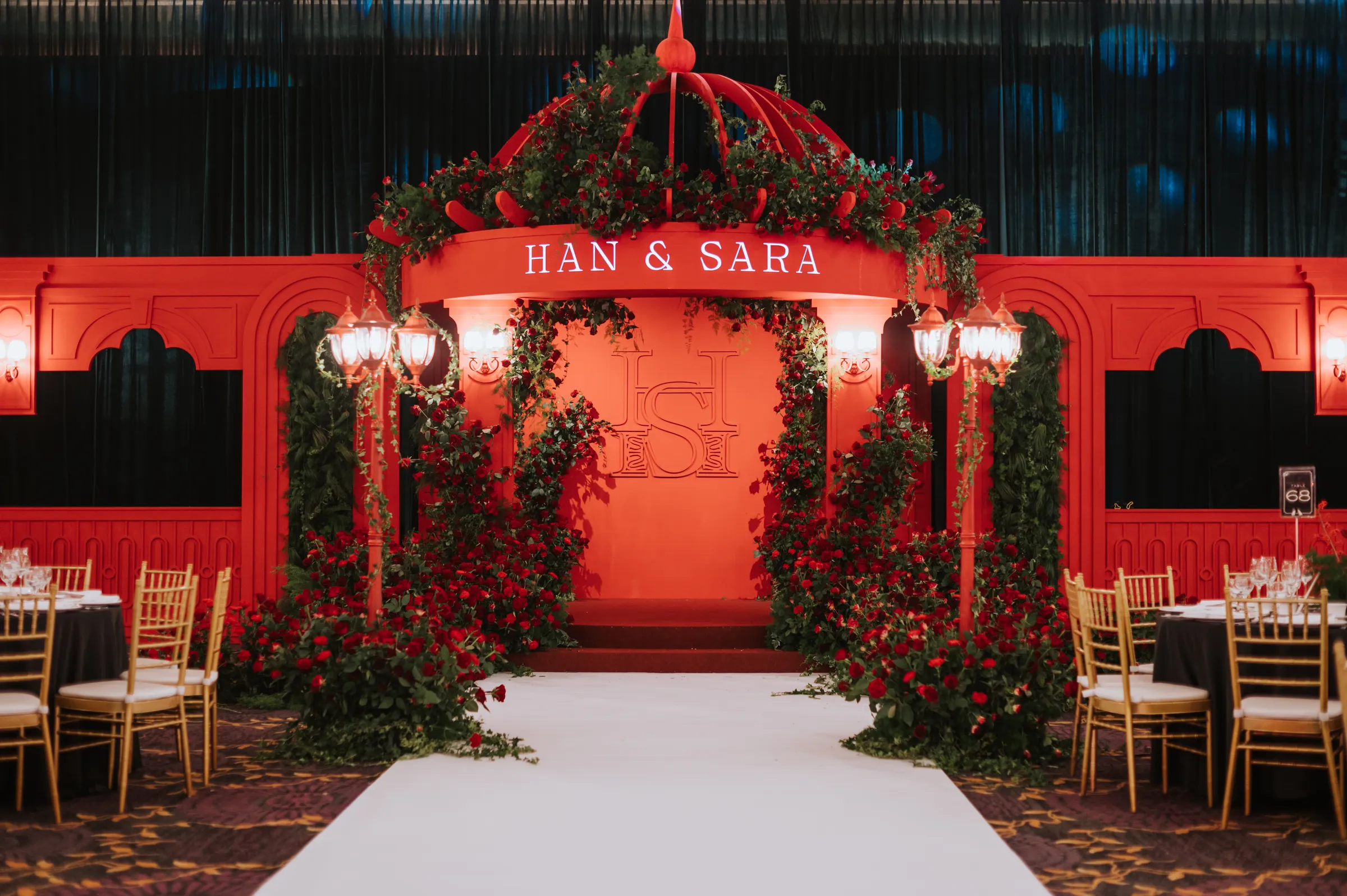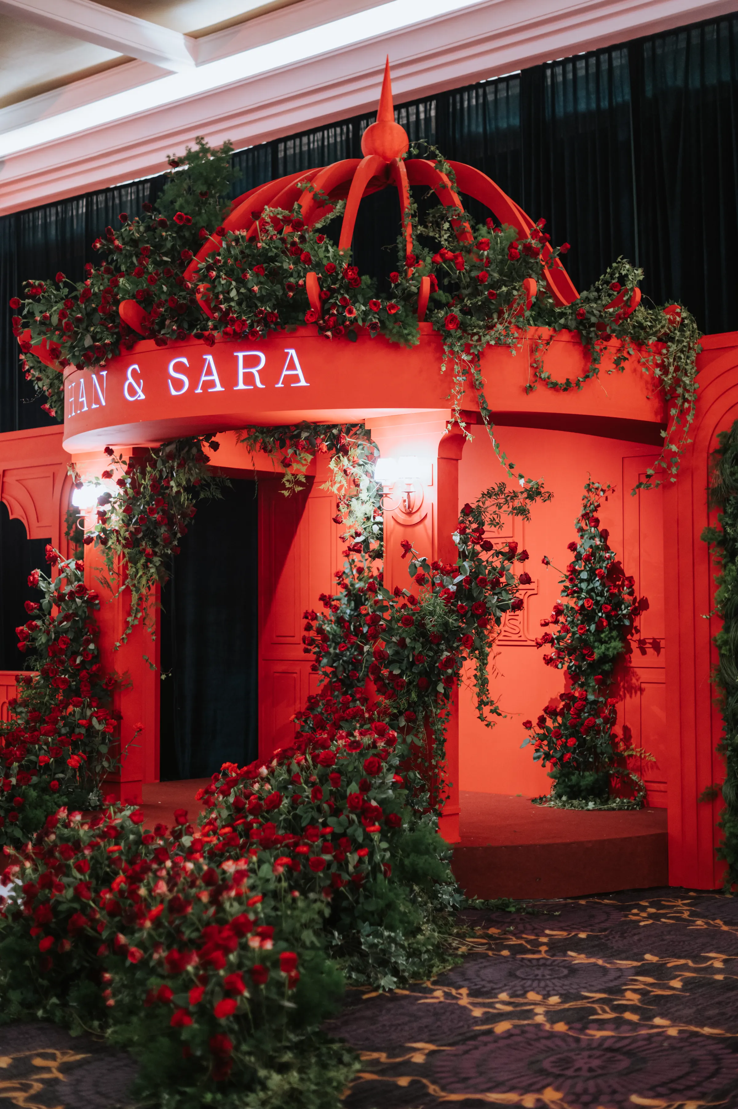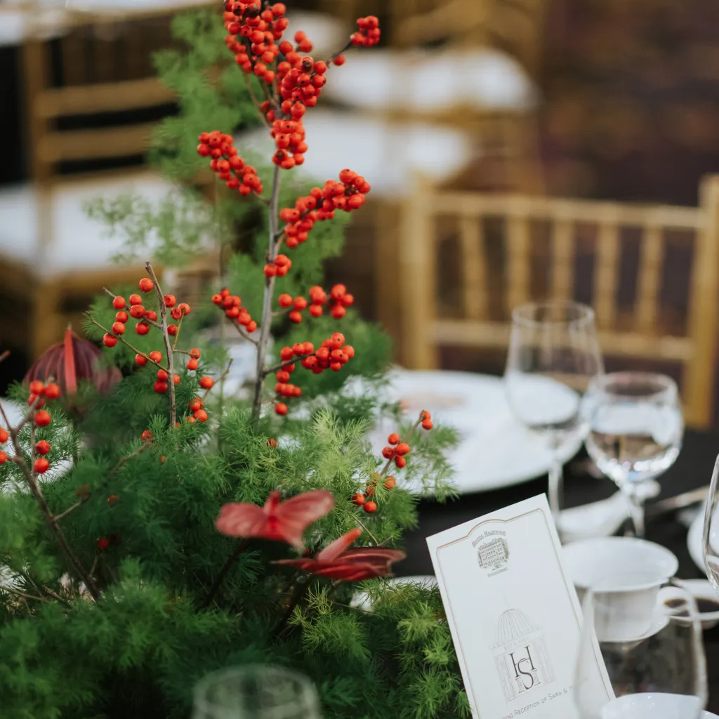 The décor was set to fit the theme with reds and greens filling the hall, holly berries graced the table centrepieces, alongside anthuriums in matching colours. This time dark red roses took centre stage. A gazebo structure with flowers arranged in formation of creepers around the pillars was erected at the entrance to the ballroom. Green vines scattered in between the blooms, keeping the decor looking organic.