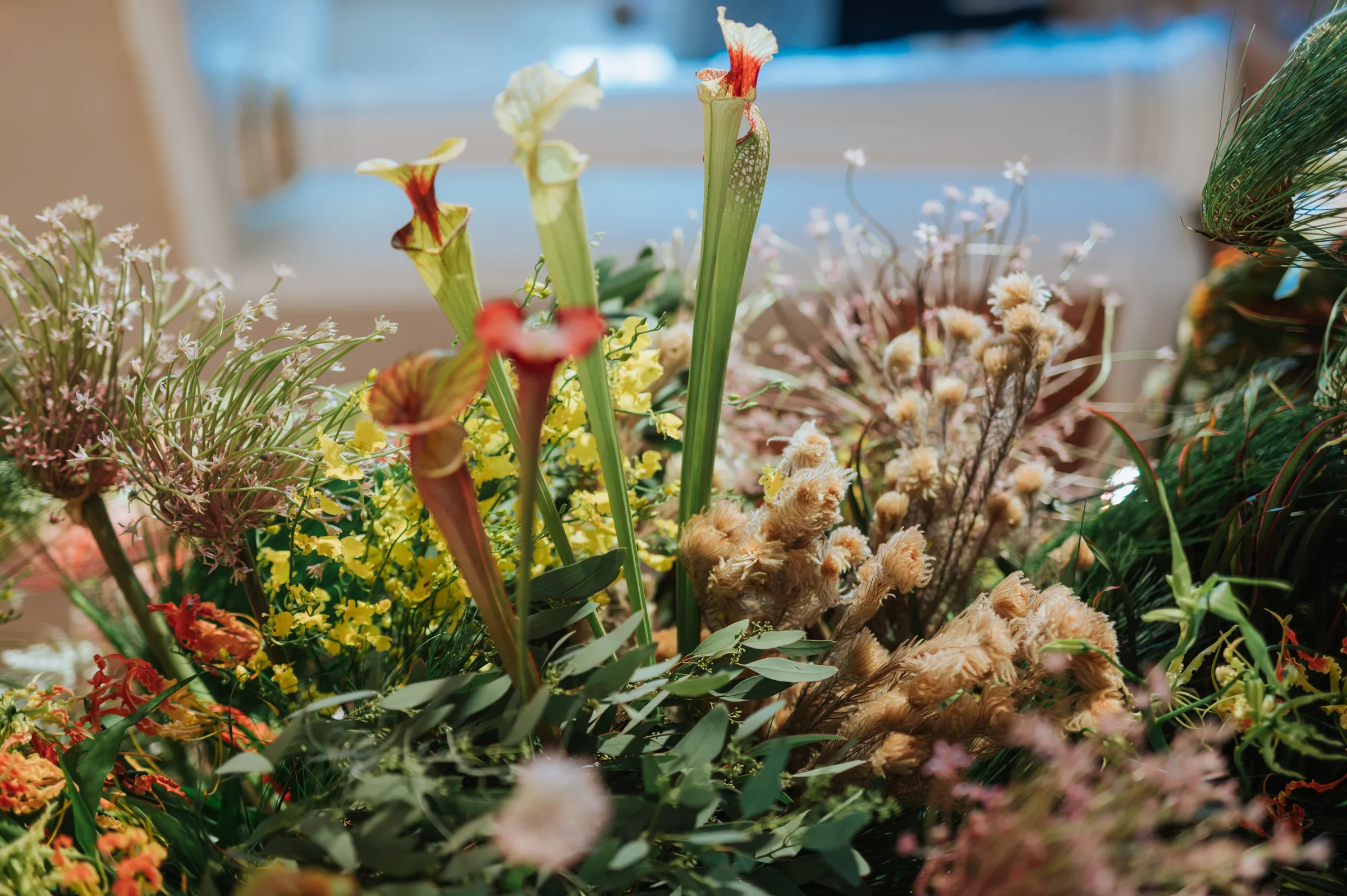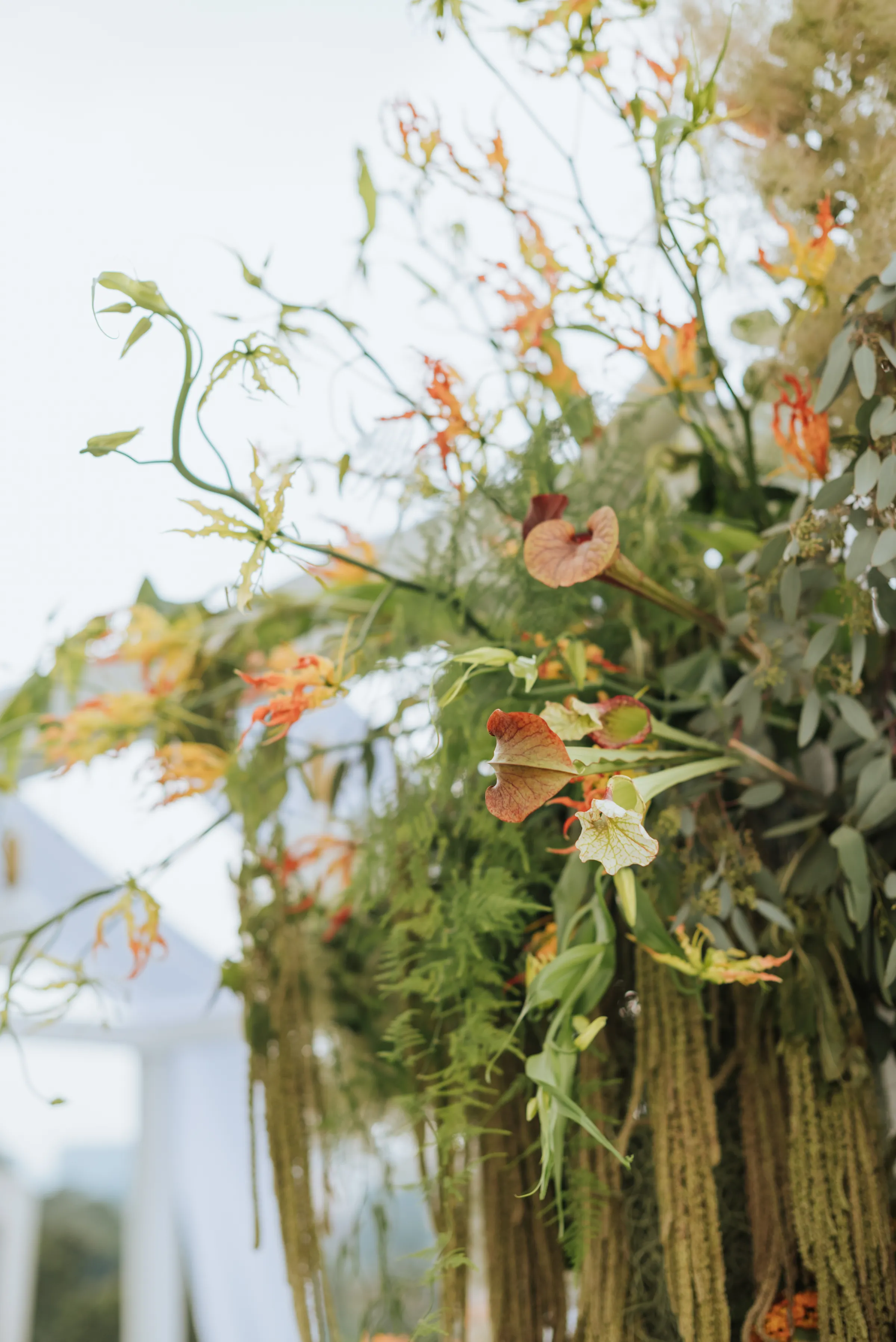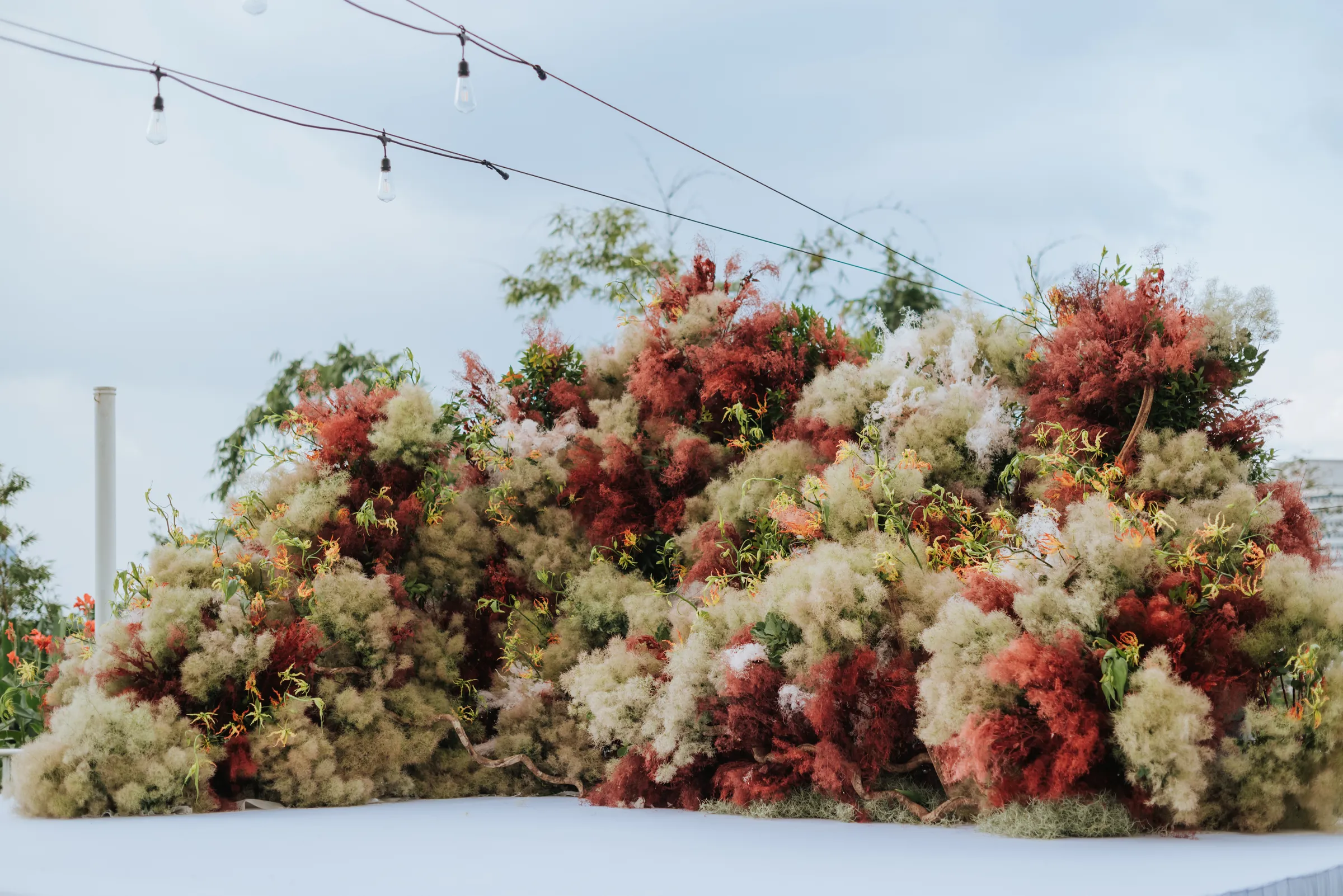 When it came time to plan their wedding, Sara and Wey Han wanted to create a day full of memorable moments by pouring their creative efforts together. Aiming for a clean and organic look; steering clear of pastels, predictable and typical floral arrangements, the bride centred her vision around the cotinus plant to add a unique touch to the décor. The exquisitely sourced plant, also known as smoke bush, was flown in from Holland and arranged into mountains of fluffy layers. Wild looking blooms such as the pitcher plants, amaranthus, and gloriosa, completed the whimsical look, making an unorthodox statement at the centre of the lawn.