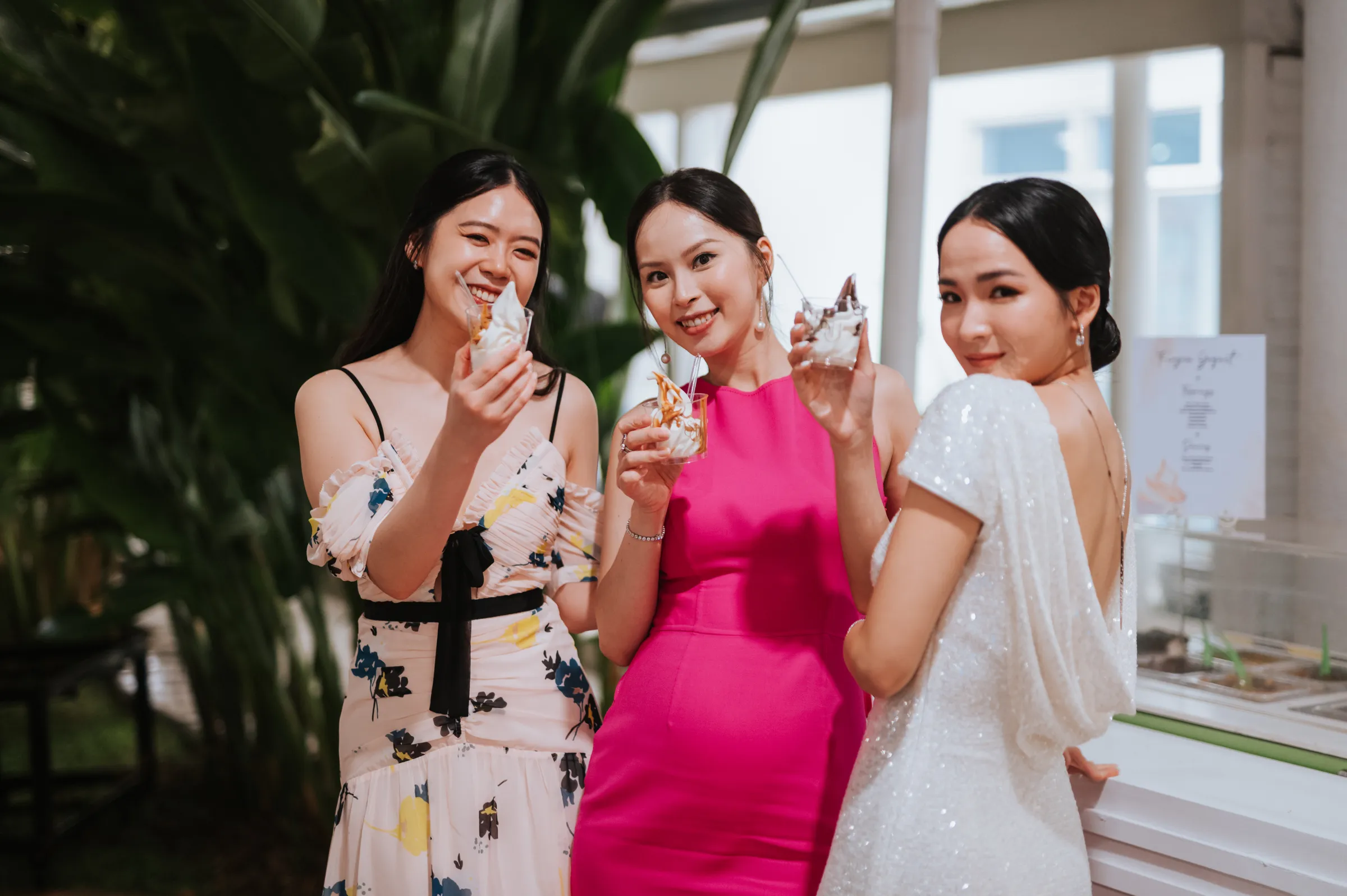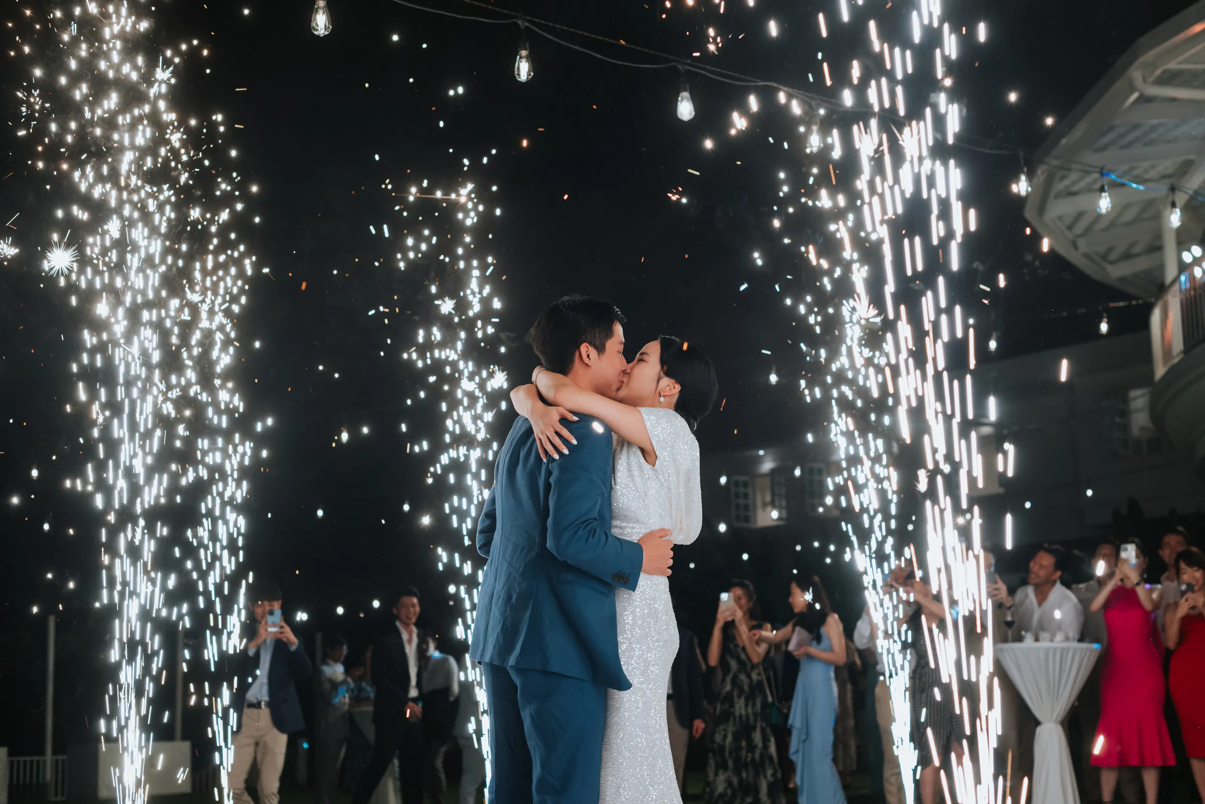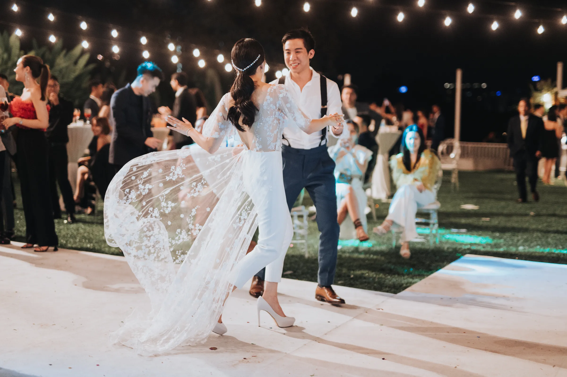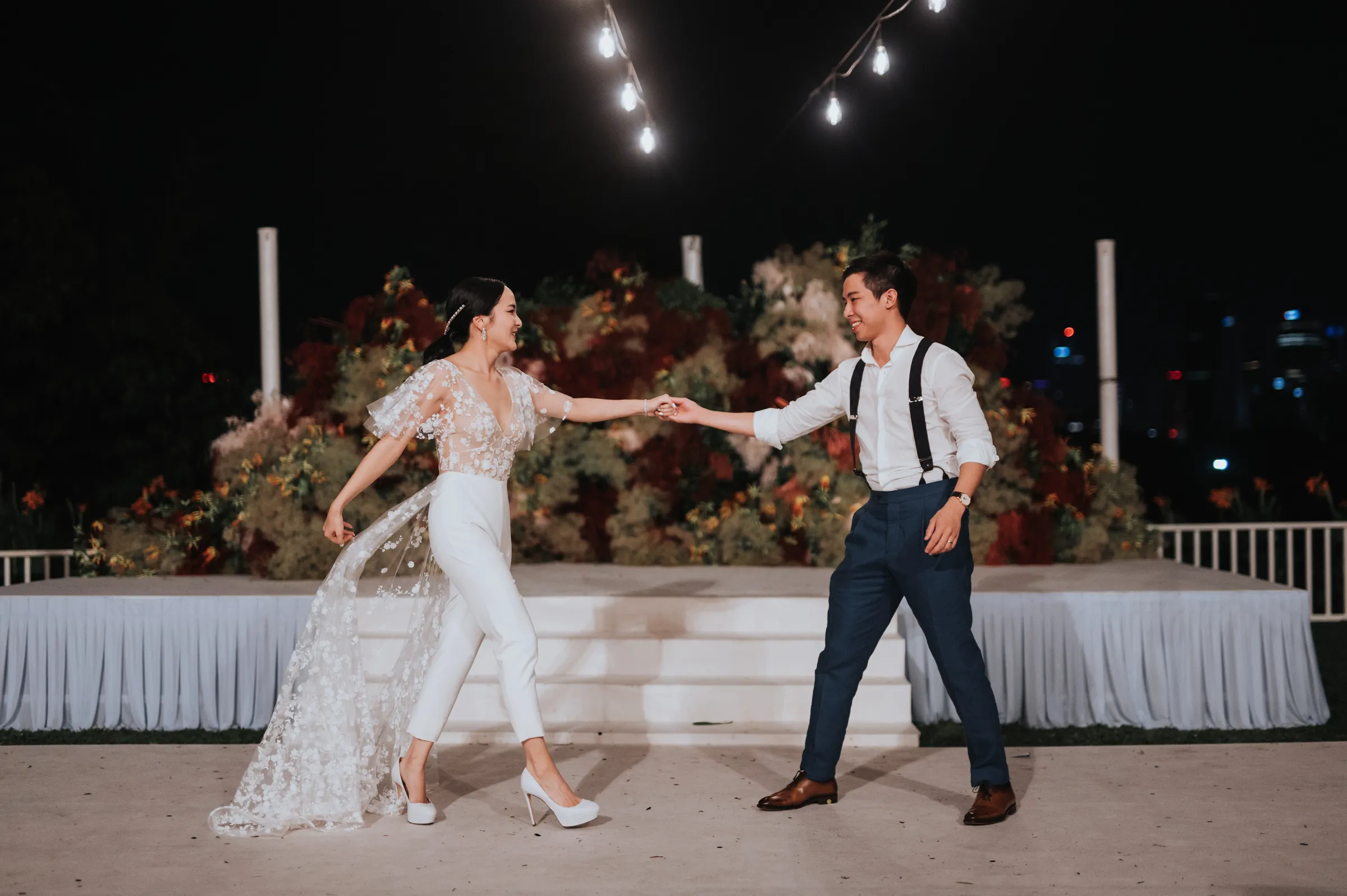 The setting of their venue felt like an upscale backyard wedding, providing an intimate and laid-back celebratory vibe the couple was gunning for. Guest were treated to a casual buffet dinner after the ceremony and for dessert, free flow of penang cendol and llao llao were on offer. For the after-party, Sara changed into a custom-made laced jumper, the couple’s first dance ended with fireworks which set the mood throughout the evening.