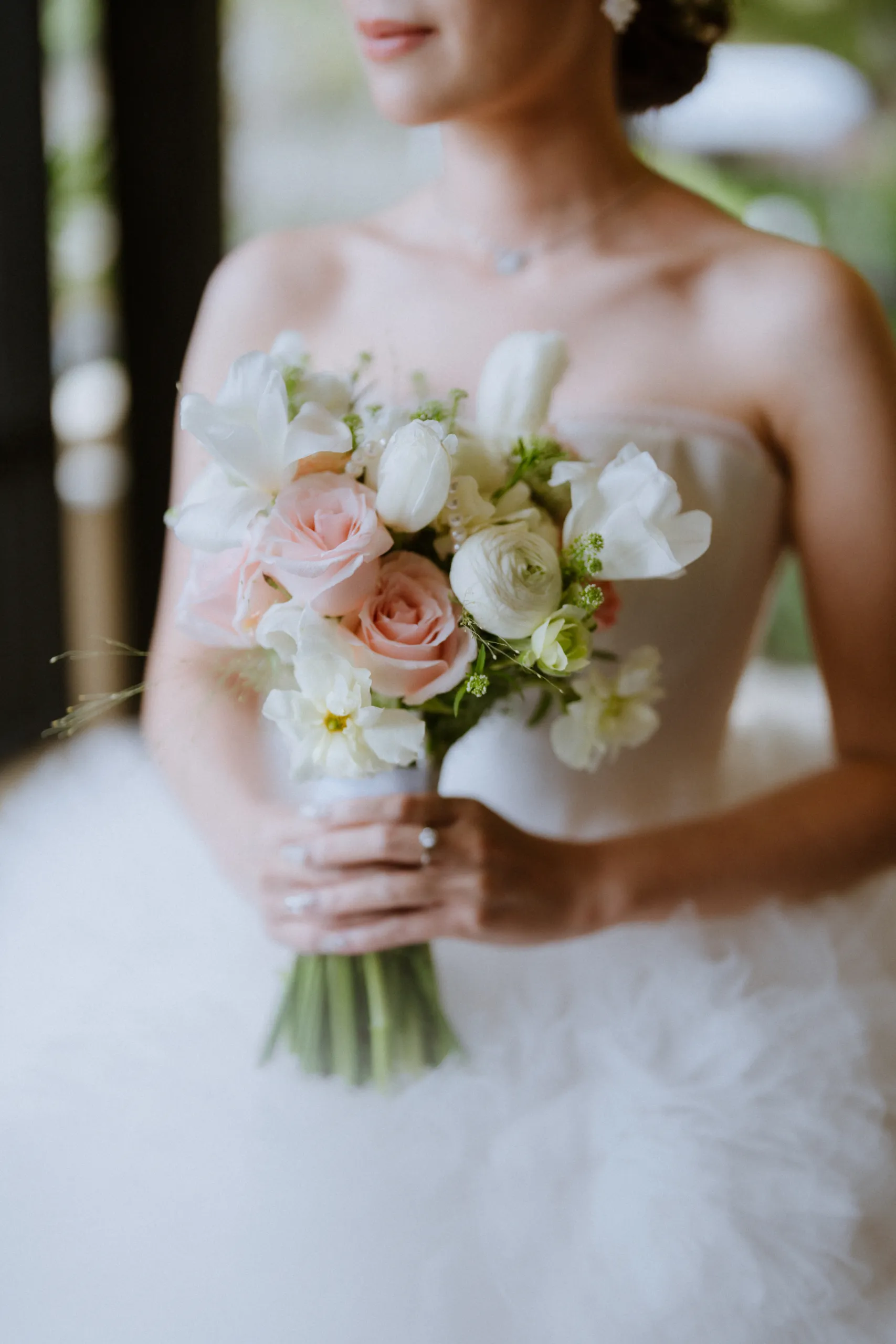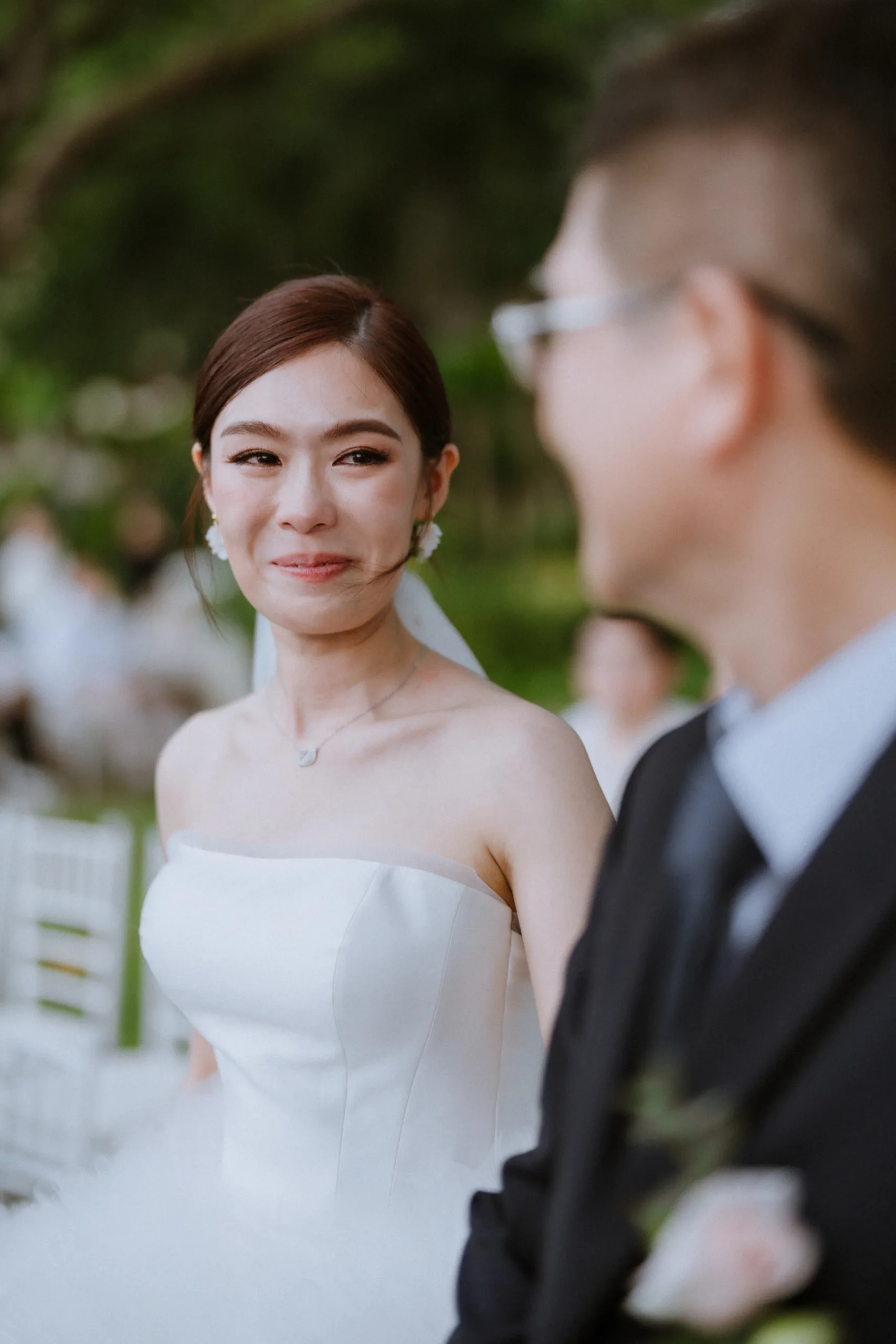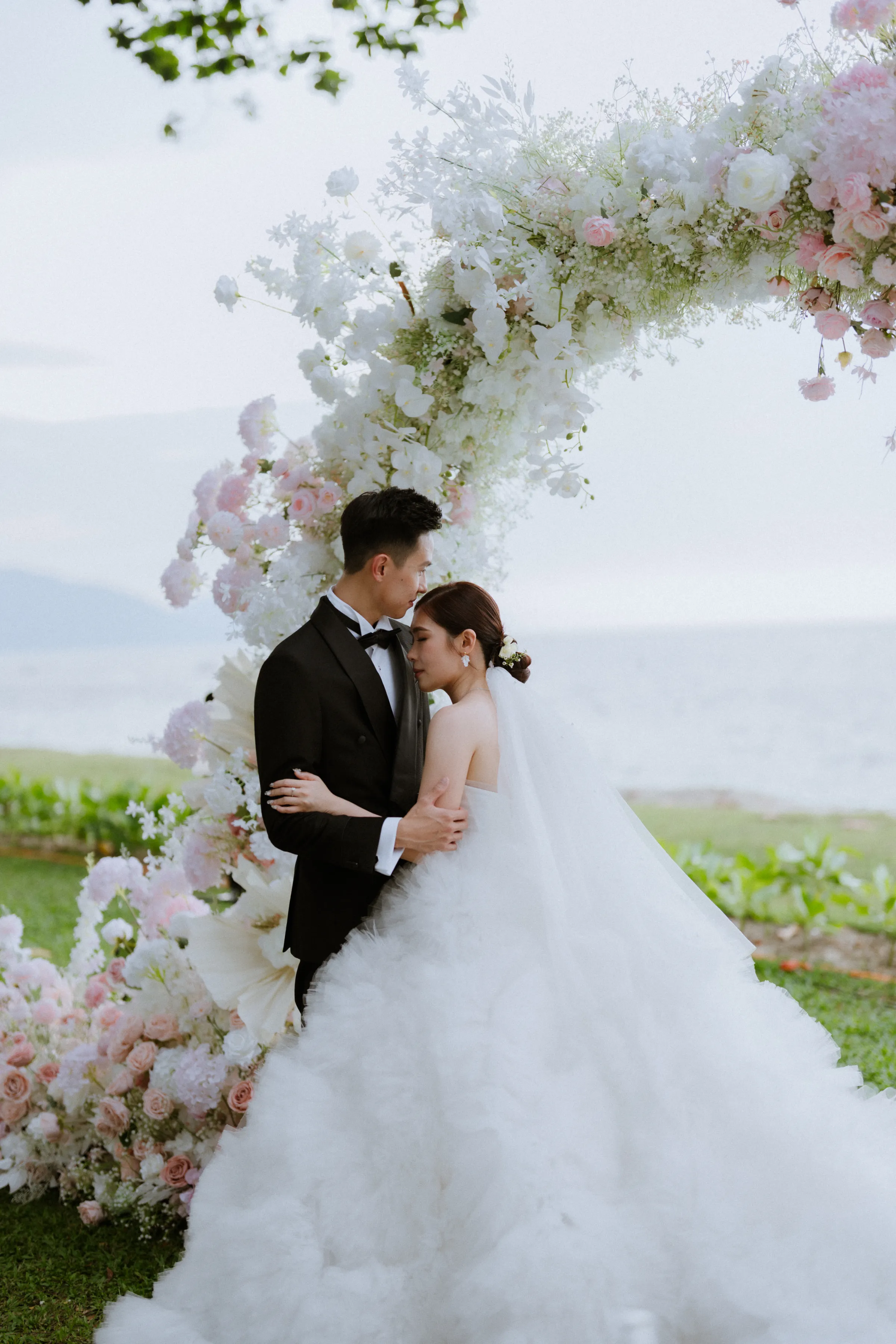 For the ceremony, the bride looked ethereal in a voluminous strapless white gown featuring layers of cloud-like tulle, paired with a classic long veil and a delicate floral bouquet — understated, yet romantic. The groom stood confidently beside her in a timeless black tuxedo, the ideal contrast that brought balance and elegance to their seaside vow exchange.