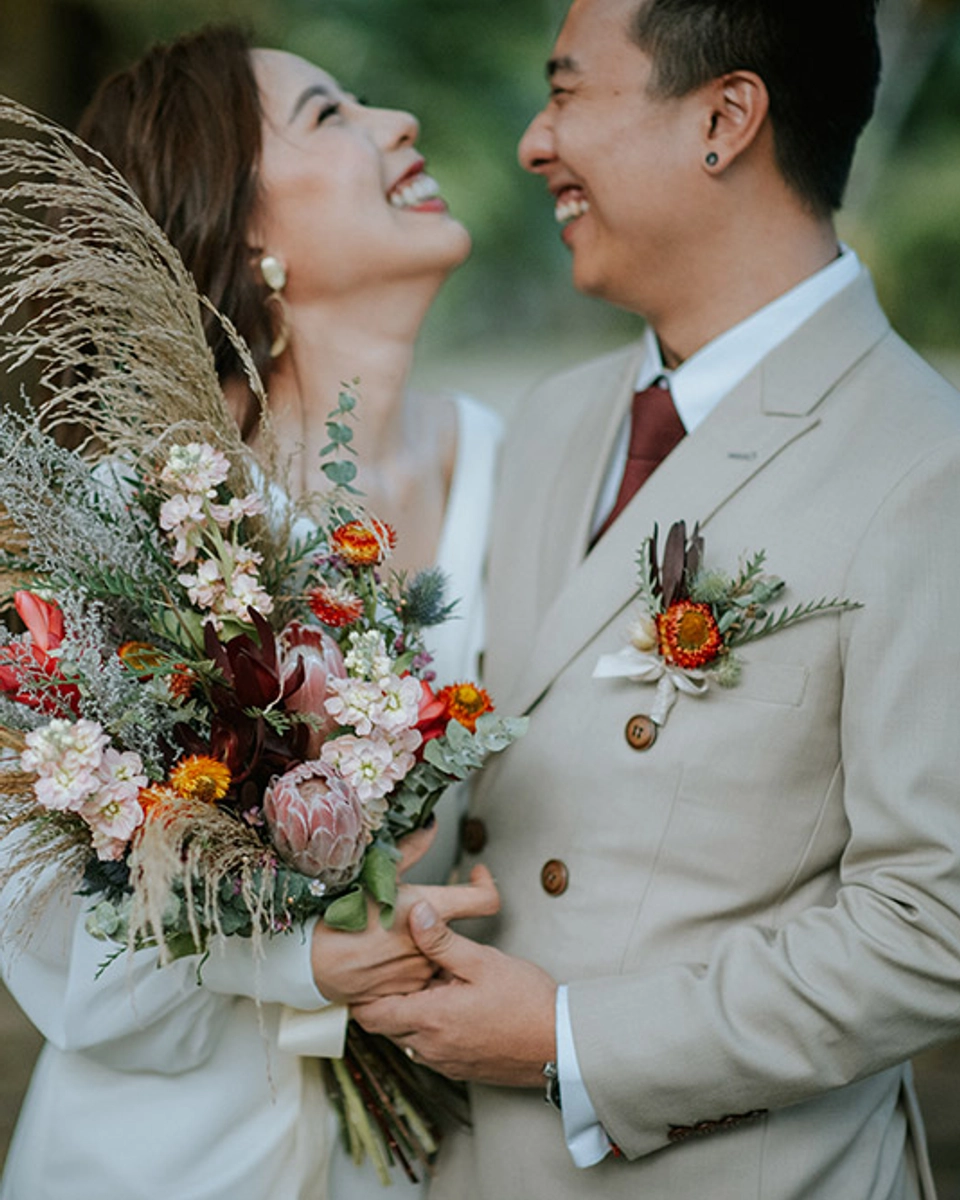 For décor, the couple incorporated Viking guest tables into the outdoor Balinese resort space, completing the look with fairy lights for a rustic setting. “When you’ve got all that going, you’re set for a laidback wedding celebration,” added the bride.