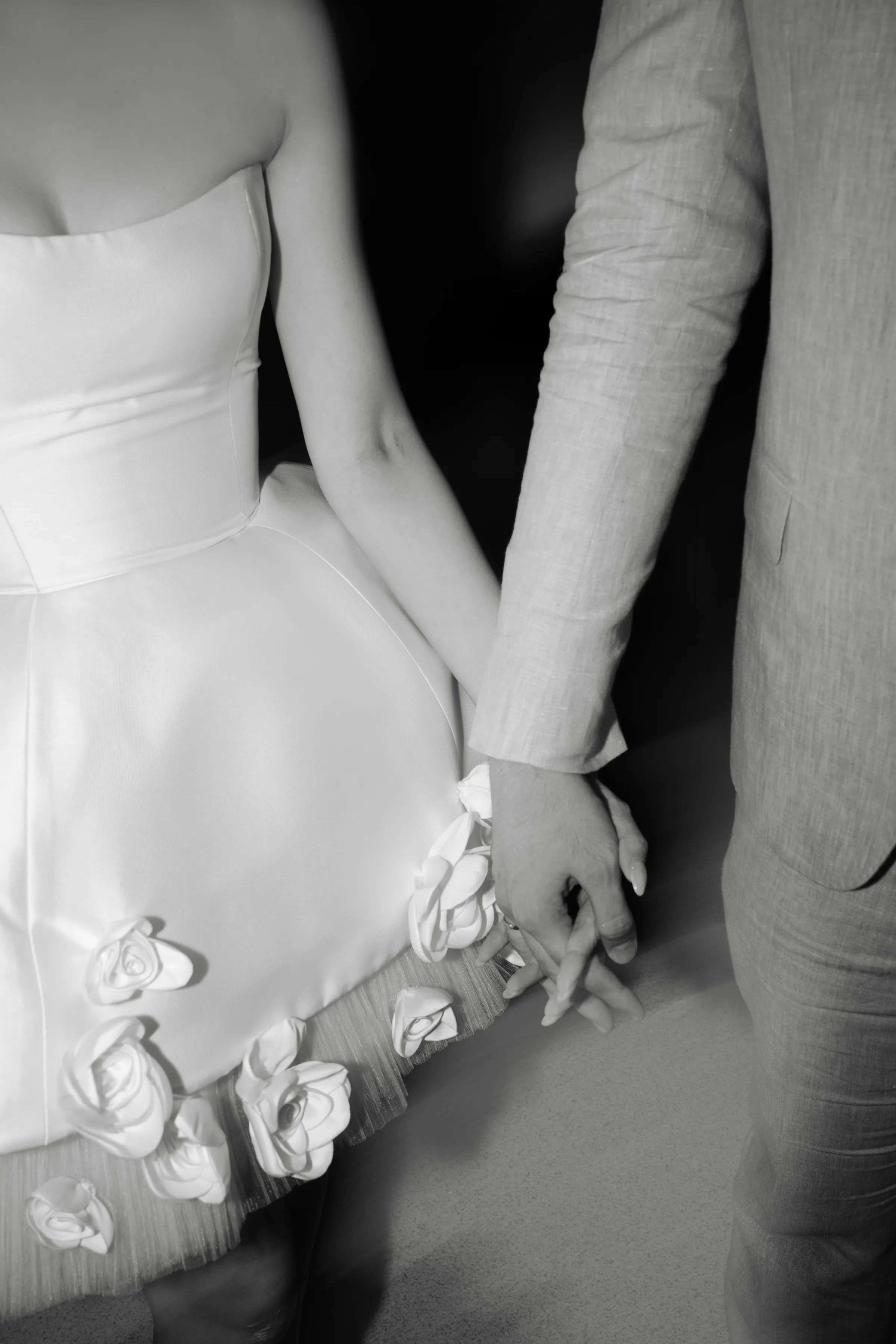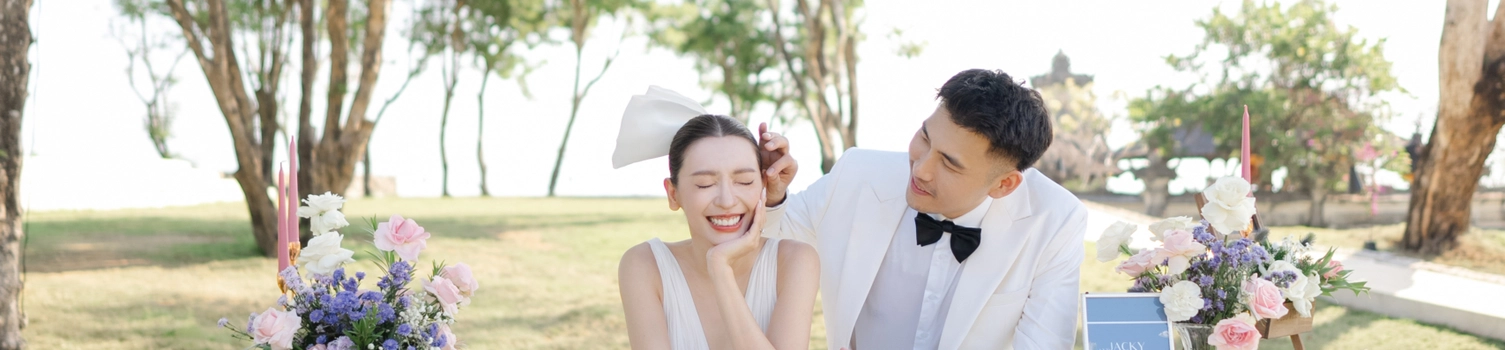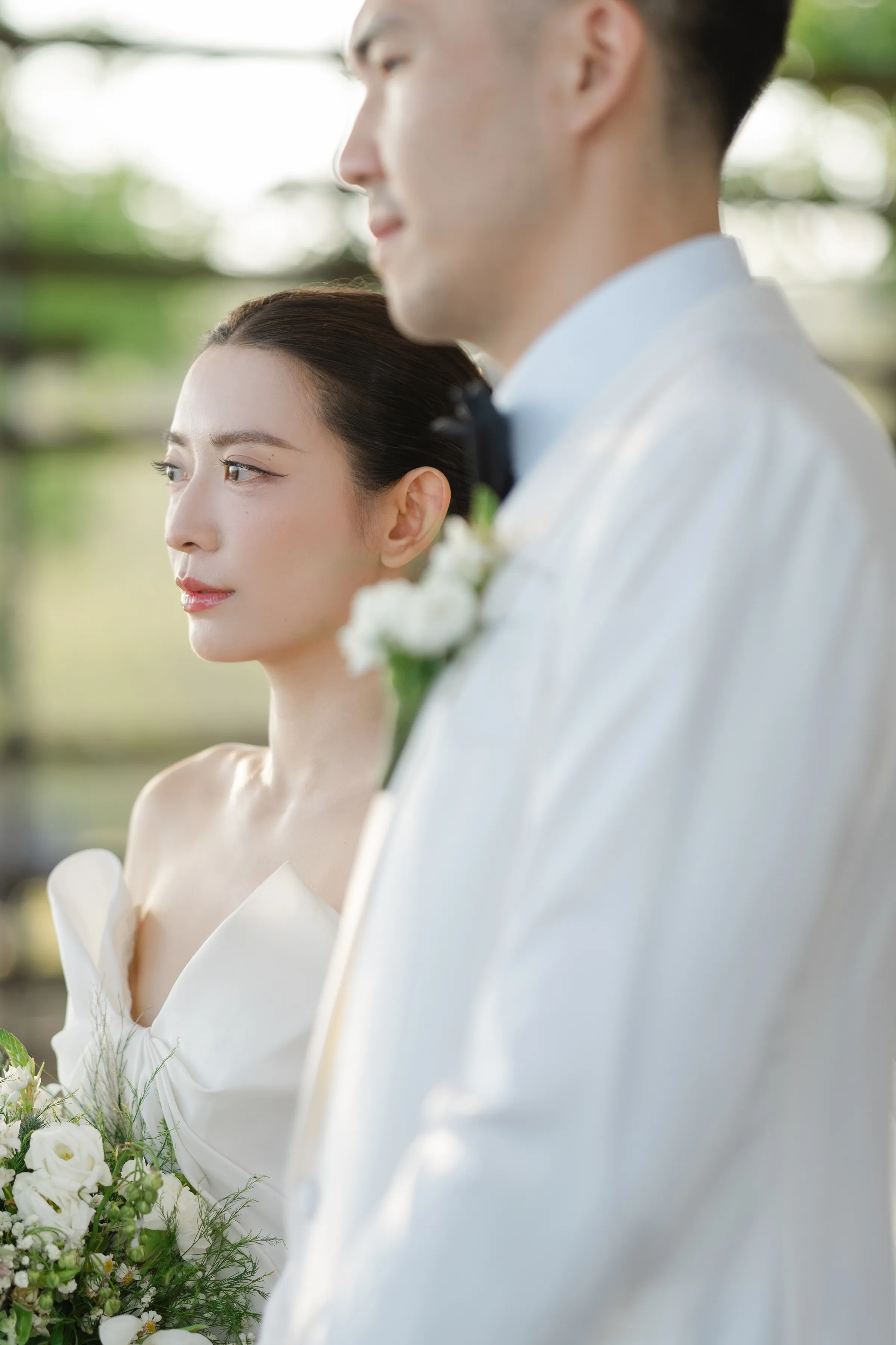 Jacky exuded classic charm in a crisp white tuxedo paired with a sleek black bow tie, epitomizing timeless and refined style. The bride, LiouMonn, looked ethereal in multiple stunning outfits that showcased her radiant personality. For the ceremony, she wore a flowing white gown with handkerchief hems, adding a playful yet sophisticated touch.