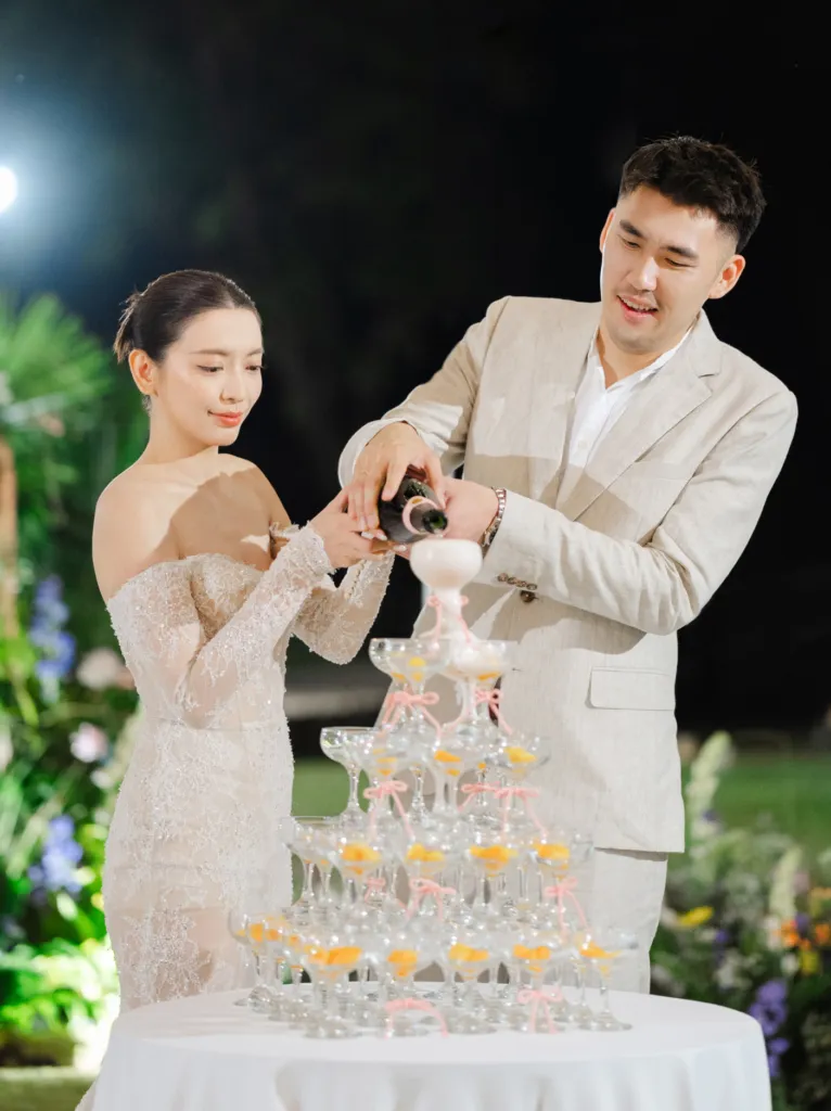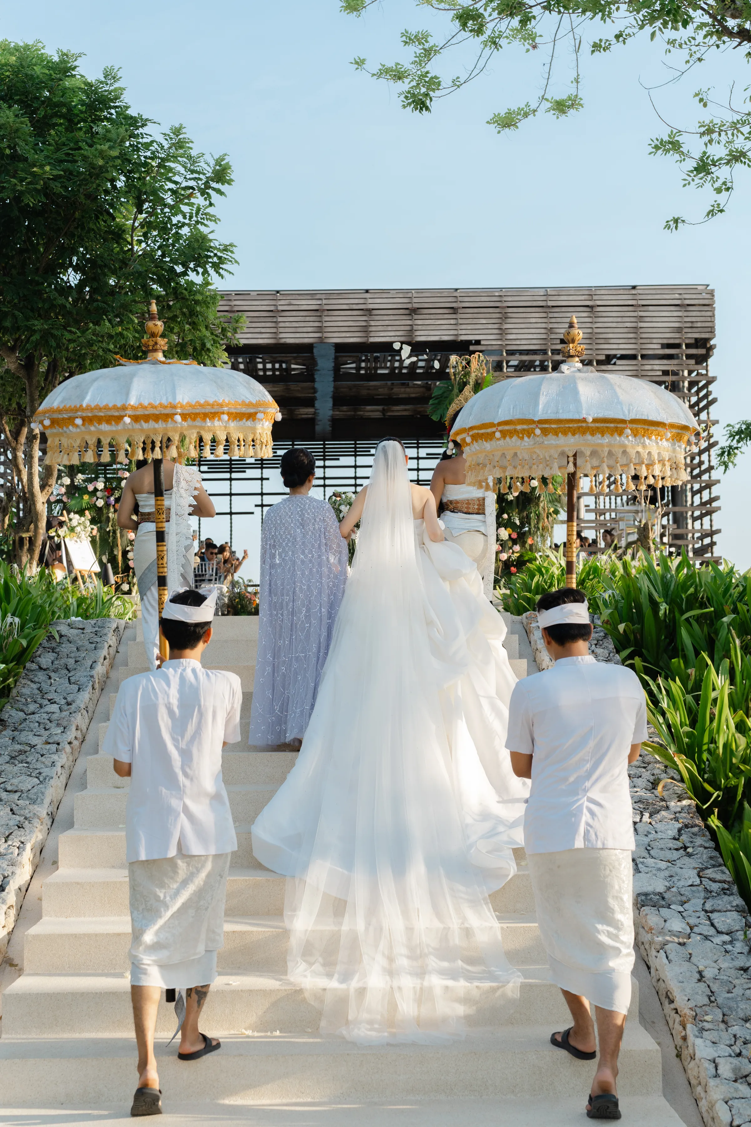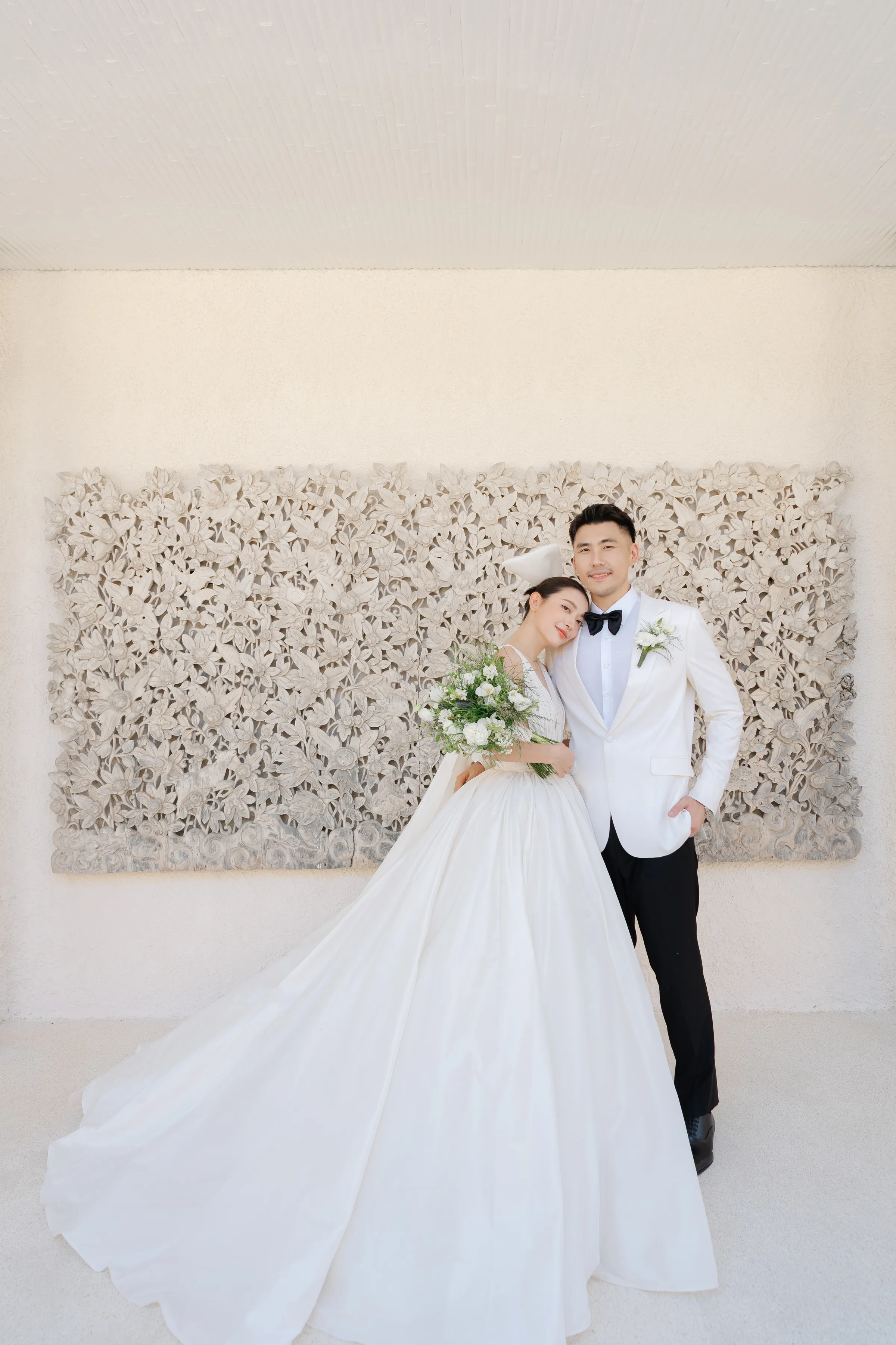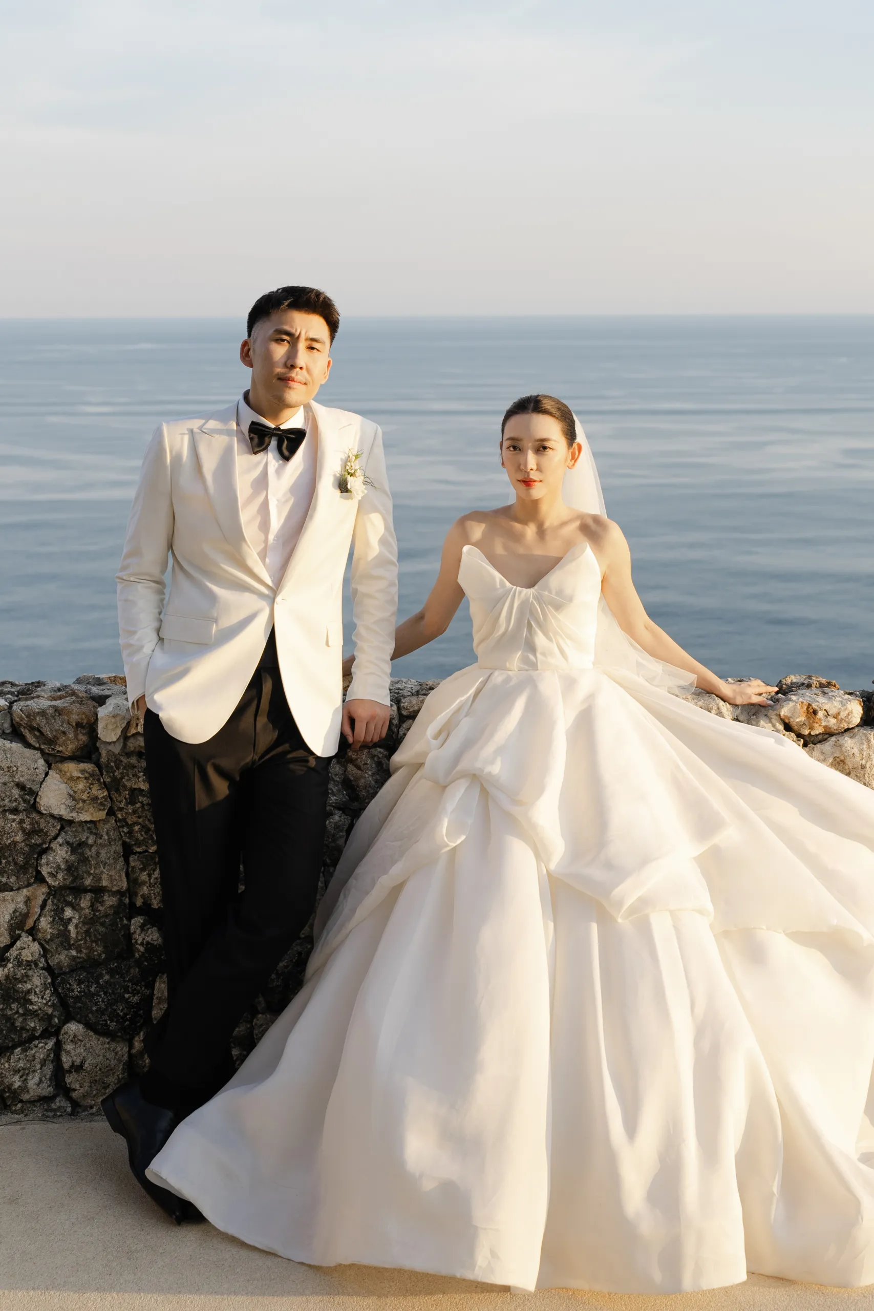 During cocktail hour, guests gathered on the Cliff Top Lawn to enjoy a stunning Balinese sunset while sipping drinks. For the evening reception, LiouMonn made an entrance in a French lace off-shoulder sheath dress, later changing into a short white dress with floral appliqués and a bubble tulle skirt—perfect for dancing the night away. The reception was a grand yet intimate affair, where speeches and toasts filled the air with heartfelt emotion. The evening culminated in a lively after-party, during which LiouMonn showcased her fun personality through a dance performance with her bridal party.