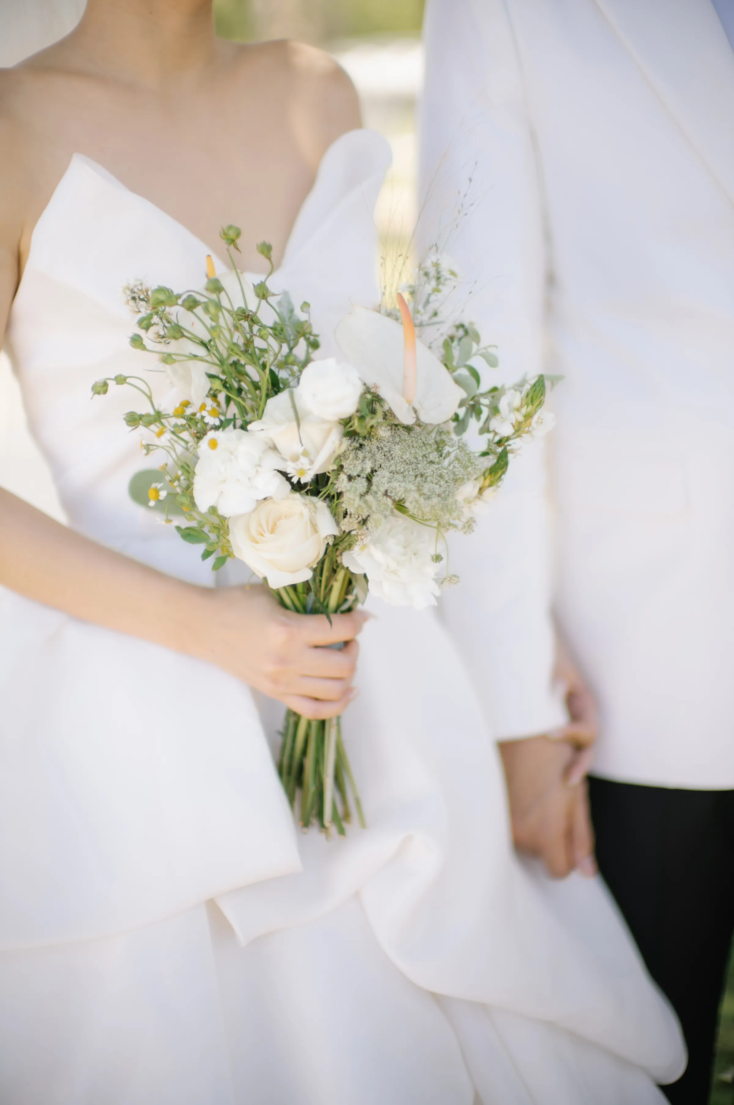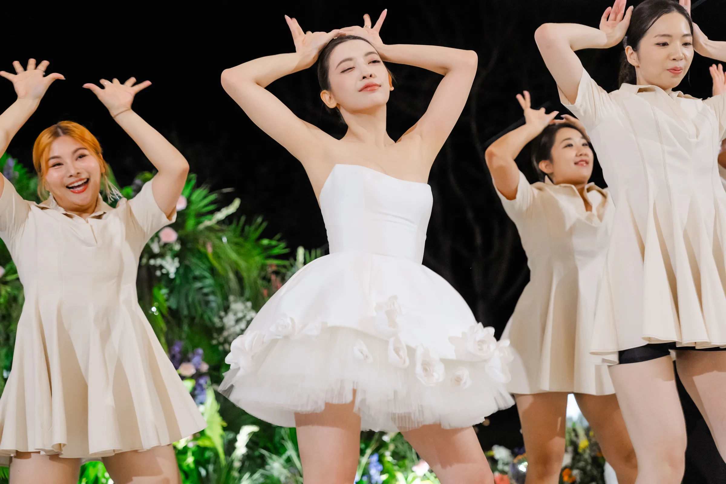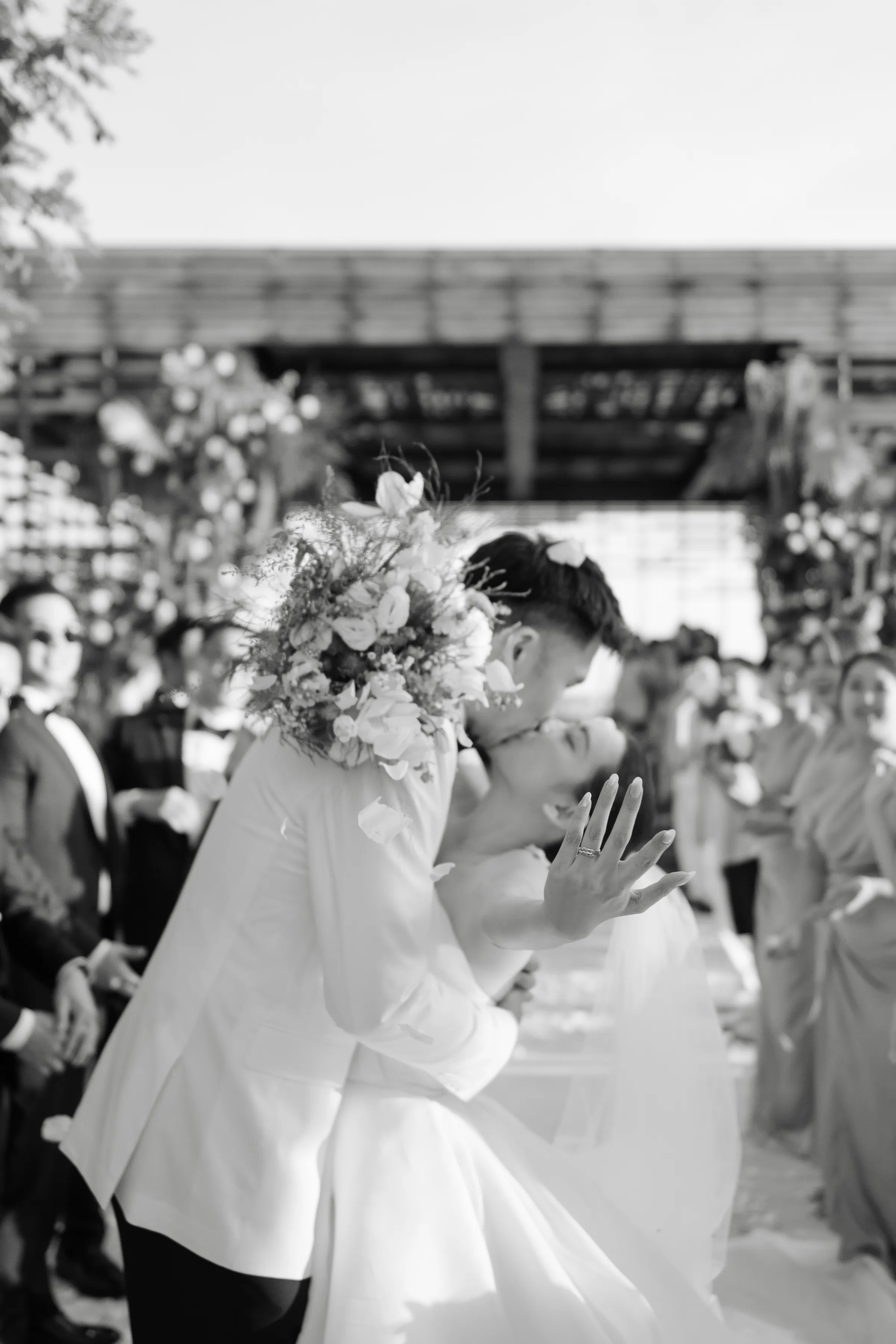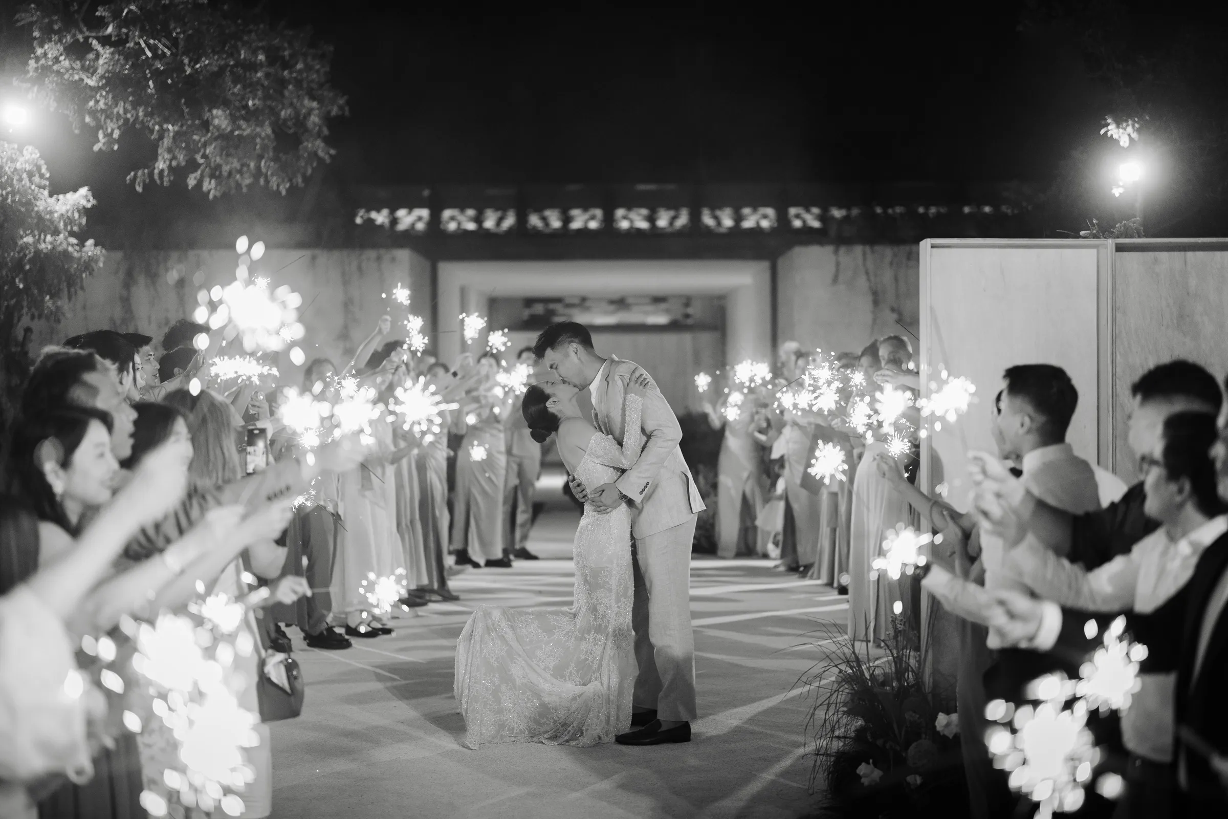 During cocktail hour, guests gathered on the Cliff Top Lawn to enjoy a stunning Balinese sunset while sipping drinks. For the evening reception, LiouMonn made an entrance in a French lace off-shoulder sheath dress, later changing into a short white dress with floral appliqués and a bubble tulle skirt—perfect for dancing the night away. The reception was a grand yet intimate affair, where speeches and toasts filled the air with heartfelt emotion. The evening culminated in a lively after-party, during which LiouMonn showcased her fun personality through a dance performance with her bridal party.