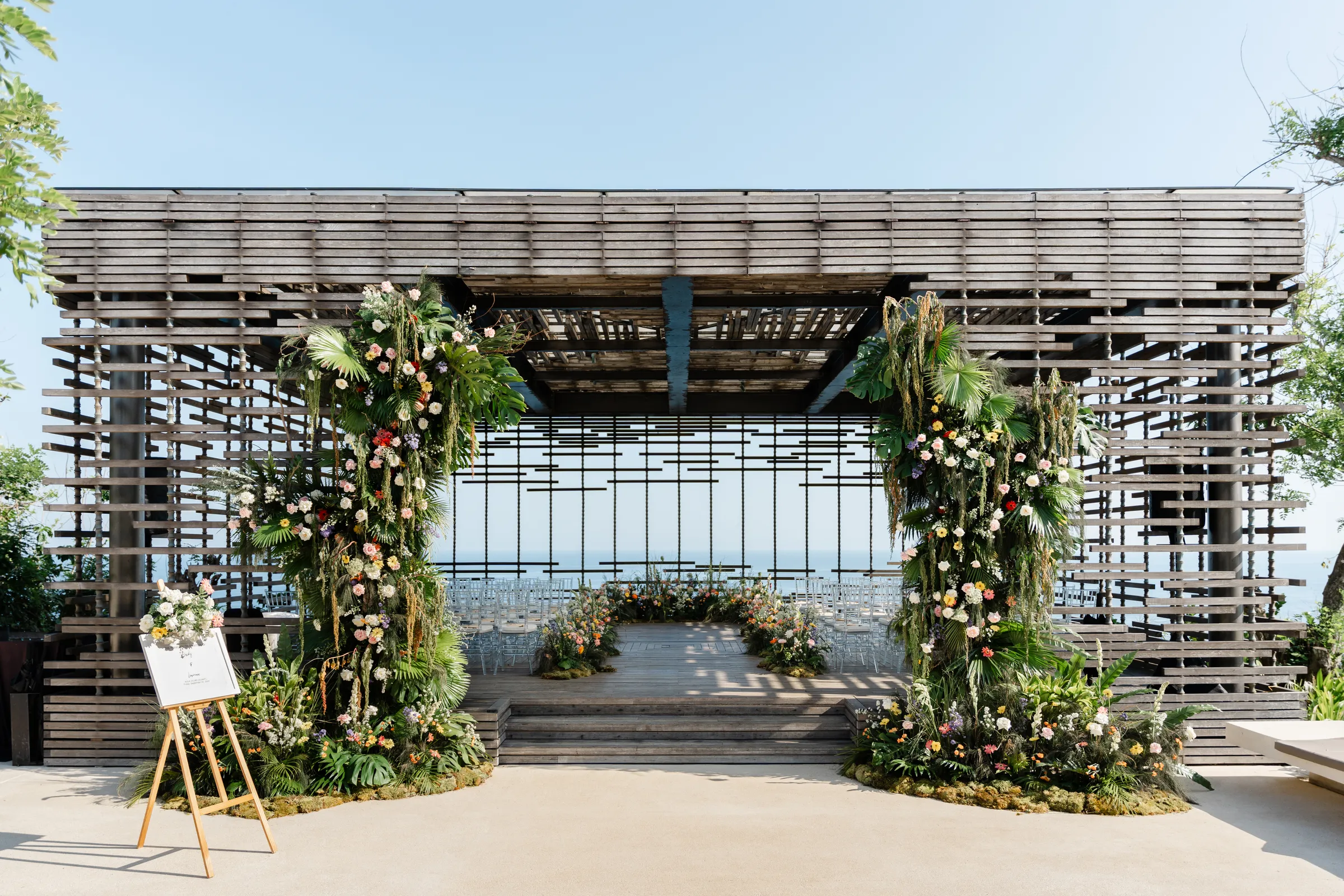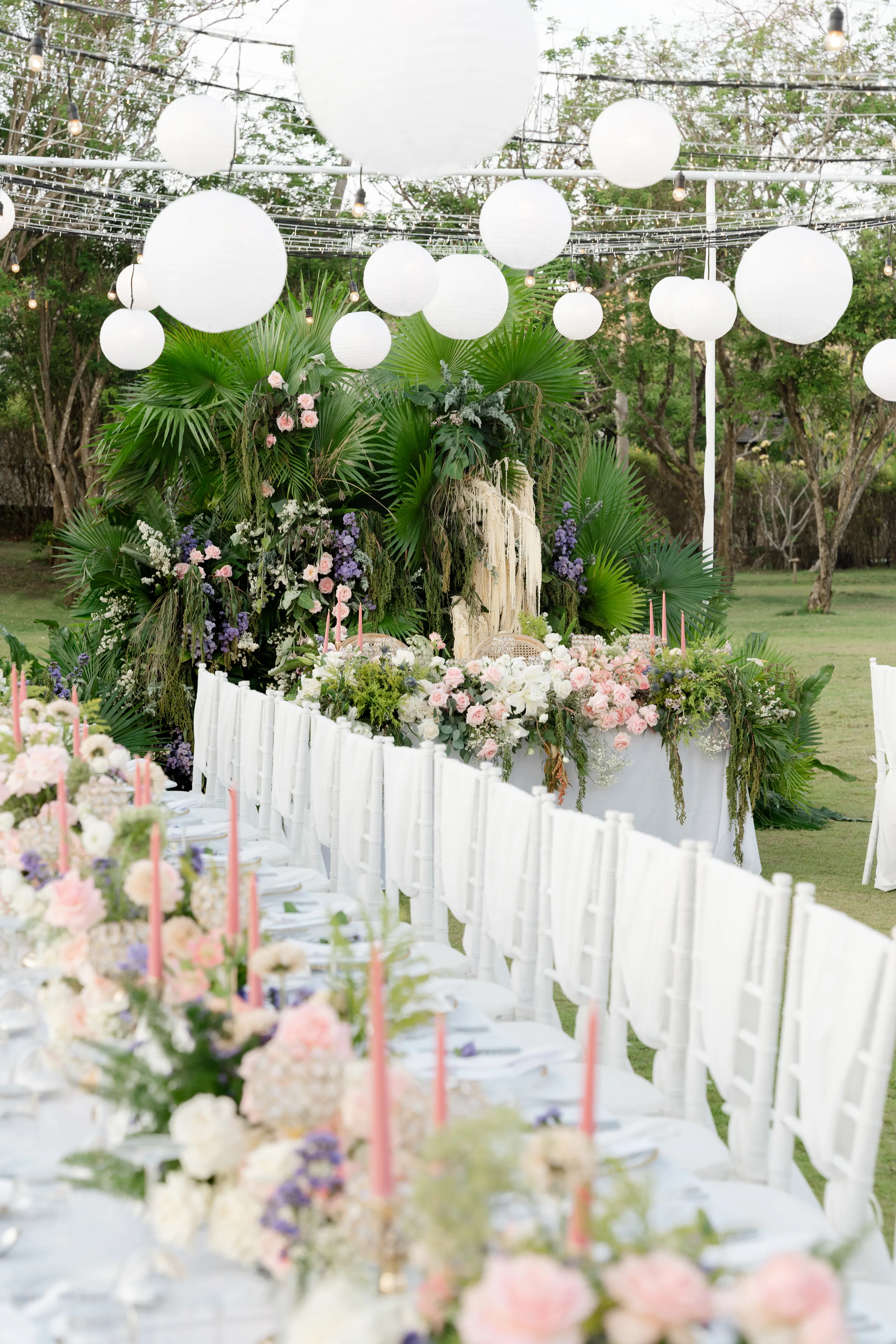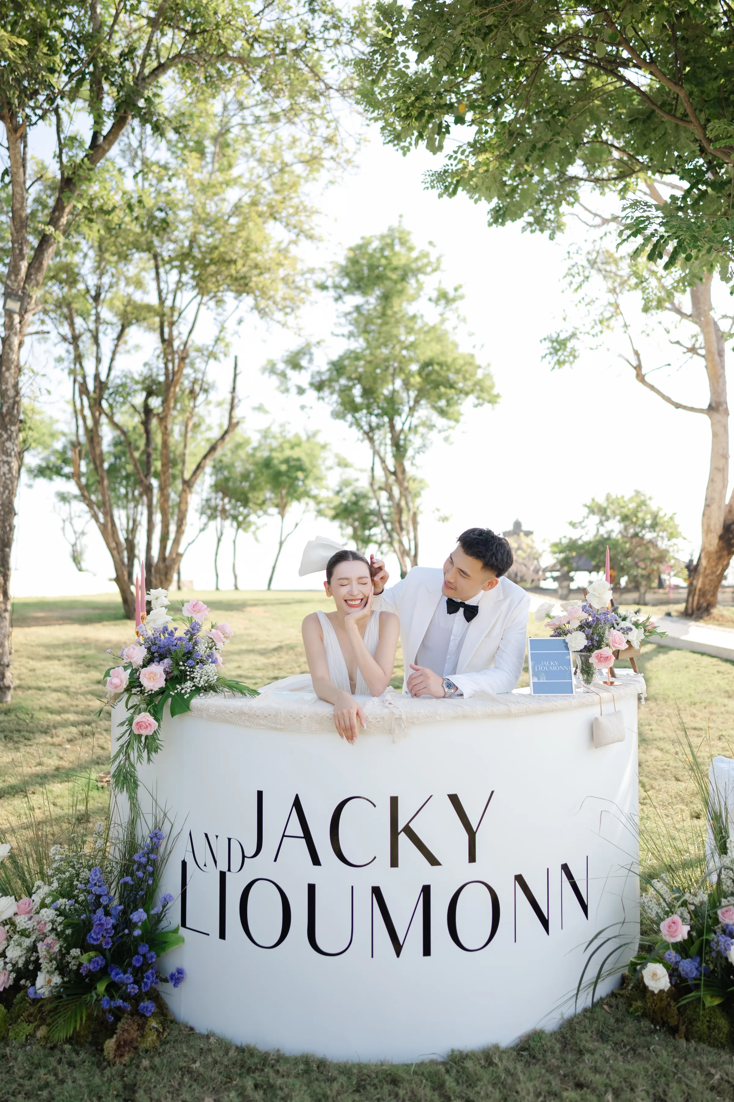 The couple hosted a wedding weekend that began with an intimate welcome dinner. The next day, Jacky and LiouMonn exchanged heartfelt vows at the Cliff Edge Cabana, surrounded by loved ones and framed by panoramic ocean views. Their wedding color palette featured soft hues of blush pink, creamy white, and pastel lavender, accented by vibrant greens from lush tropical foliage.