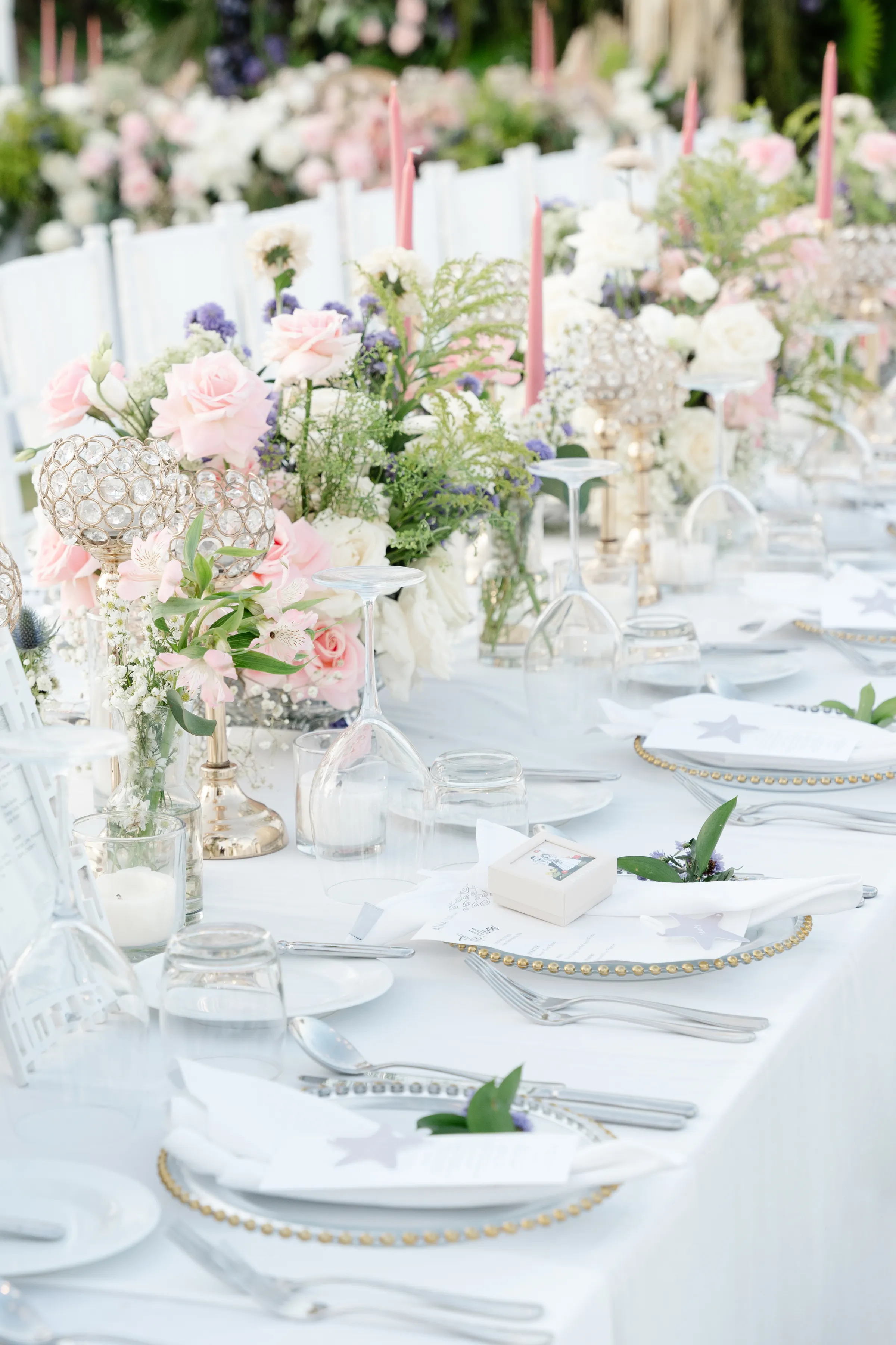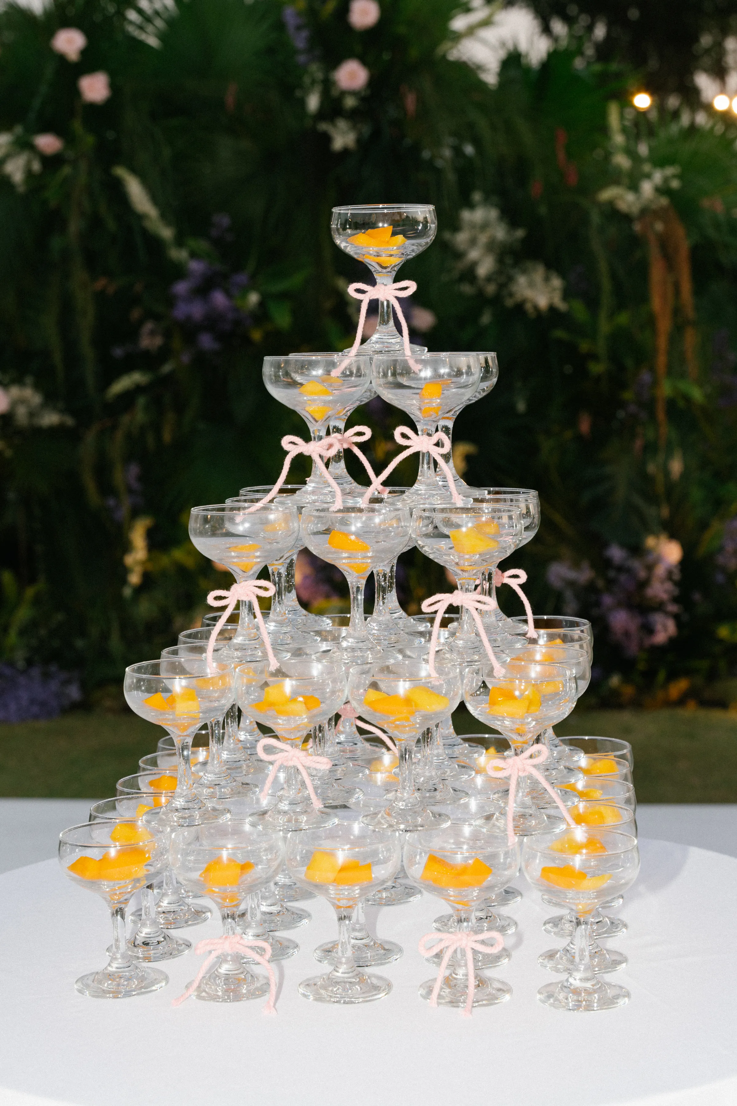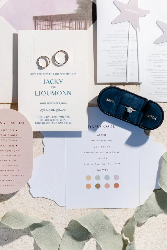 The couple hosted a wedding weekend that began with an intimate welcome dinner. The next day, Jacky and LiouMonn exchanged heartfelt vows at the Cliff Edge Cabana, surrounded by loved ones and framed by panoramic ocean views. Their wedding color palette featured soft hues of blush pink, creamy white, and pastel lavender, accented by vibrant greens from lush tropical foliage.