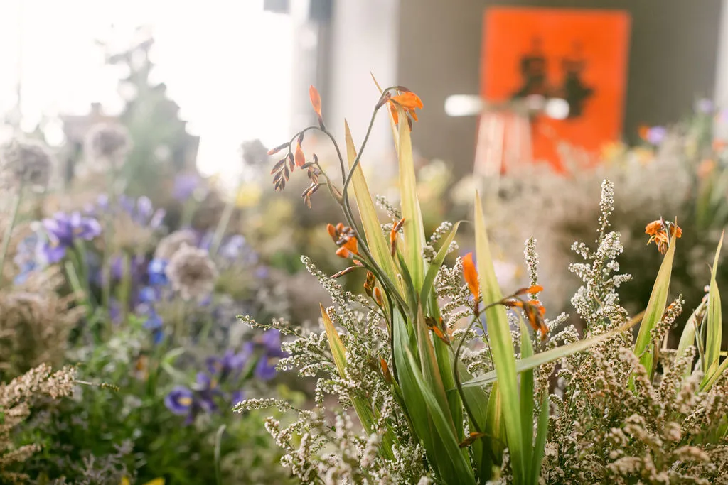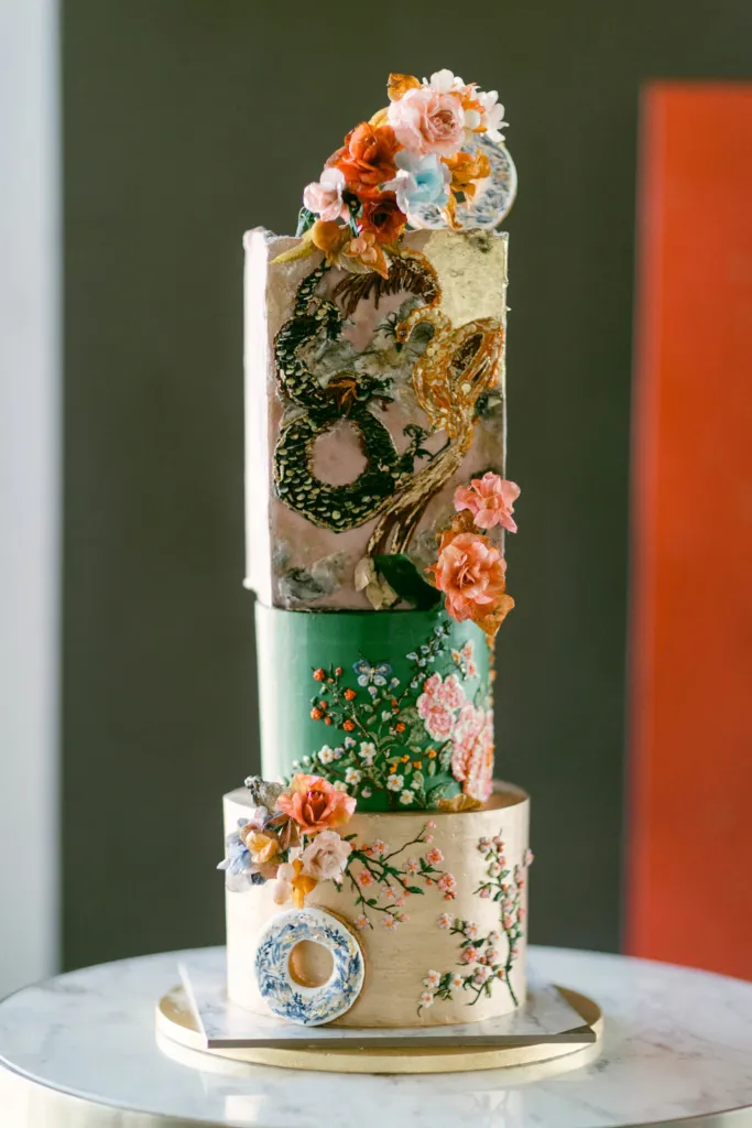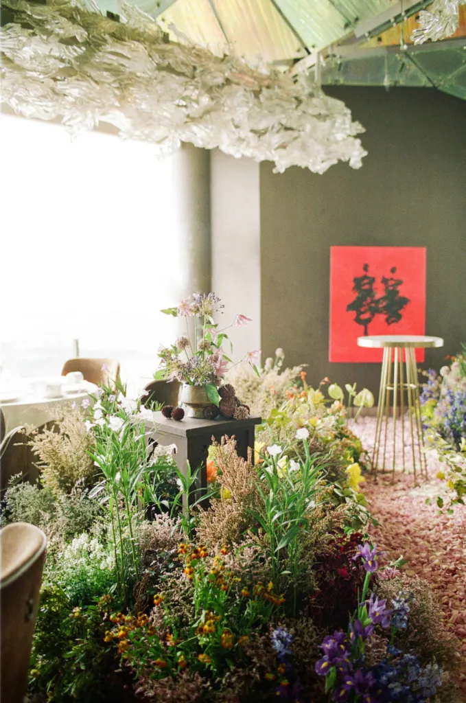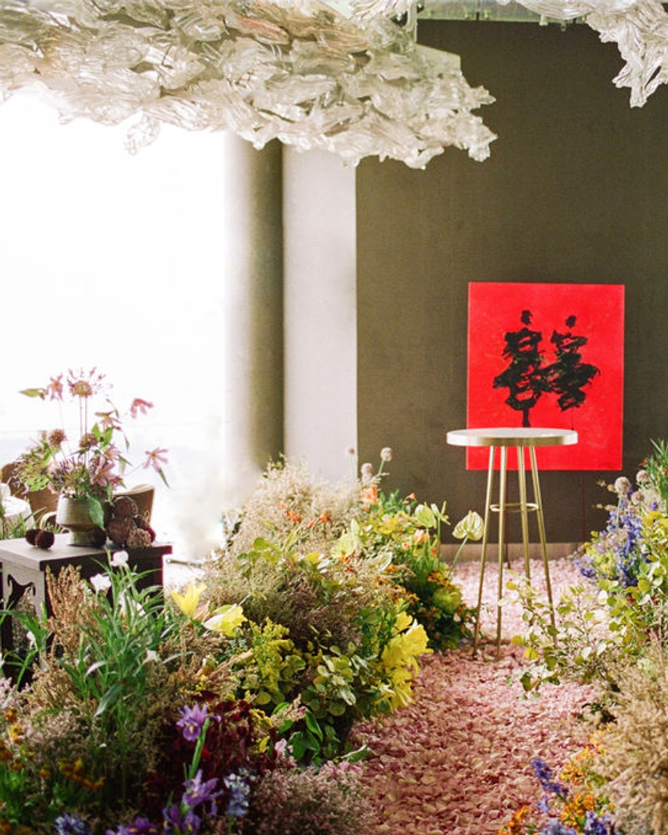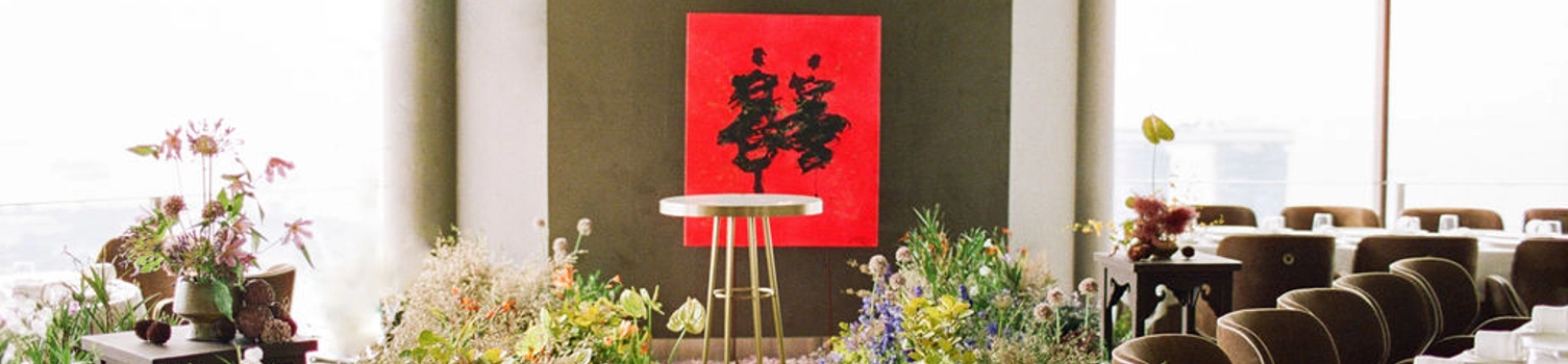 Standing in the middle of the flower-filled space, they exchanged their vows witnessed by those closest to them. A glimpse of a painted artwork with dual meaning could be seen on their backdrop. At first glance, the unmistakable double wording of the Chinese character for happiness, 囍, synonymous to any wedding celebration, takes front and centre. However, on closer inspection one may begin to notice an image of two person dancing together.