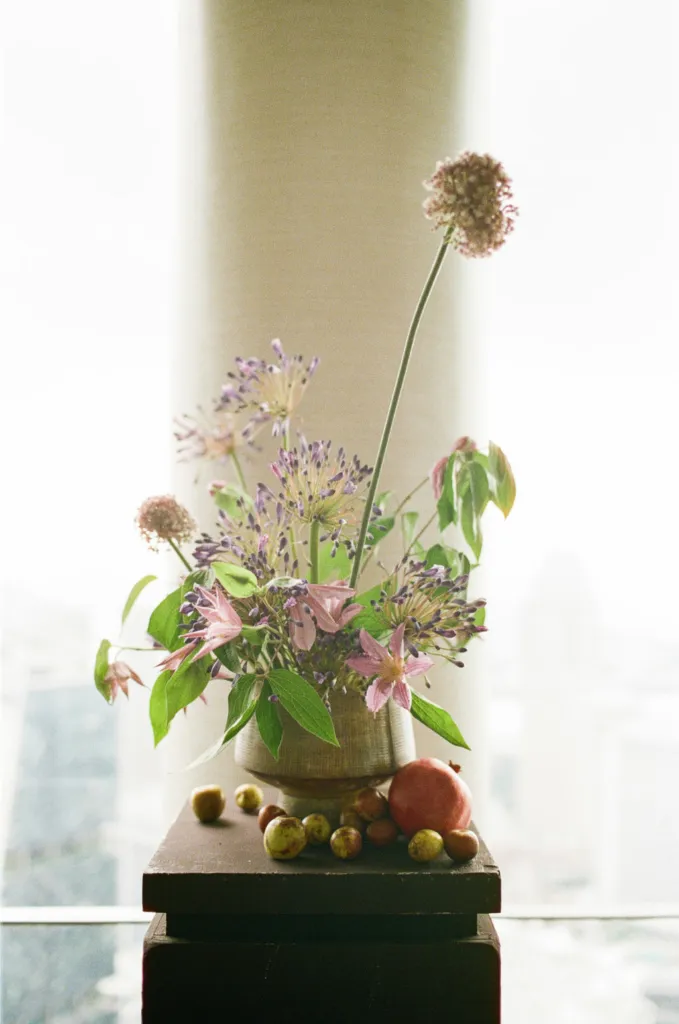 For the décor, Yvonne visualised walking through a meadow with concoction of seasonal wild flowers. Drawing inspiration from both the Chinese and English garden, with the idea of ‘moving the garden into the sky’, her vision was translated accurately by decorator HellofromFlour. Popping Allium Bulbs in between wild grasses of Caspias created the perfect ambiance for them to feel close to nature, but in the comfort of the beautiful space of Jaan.