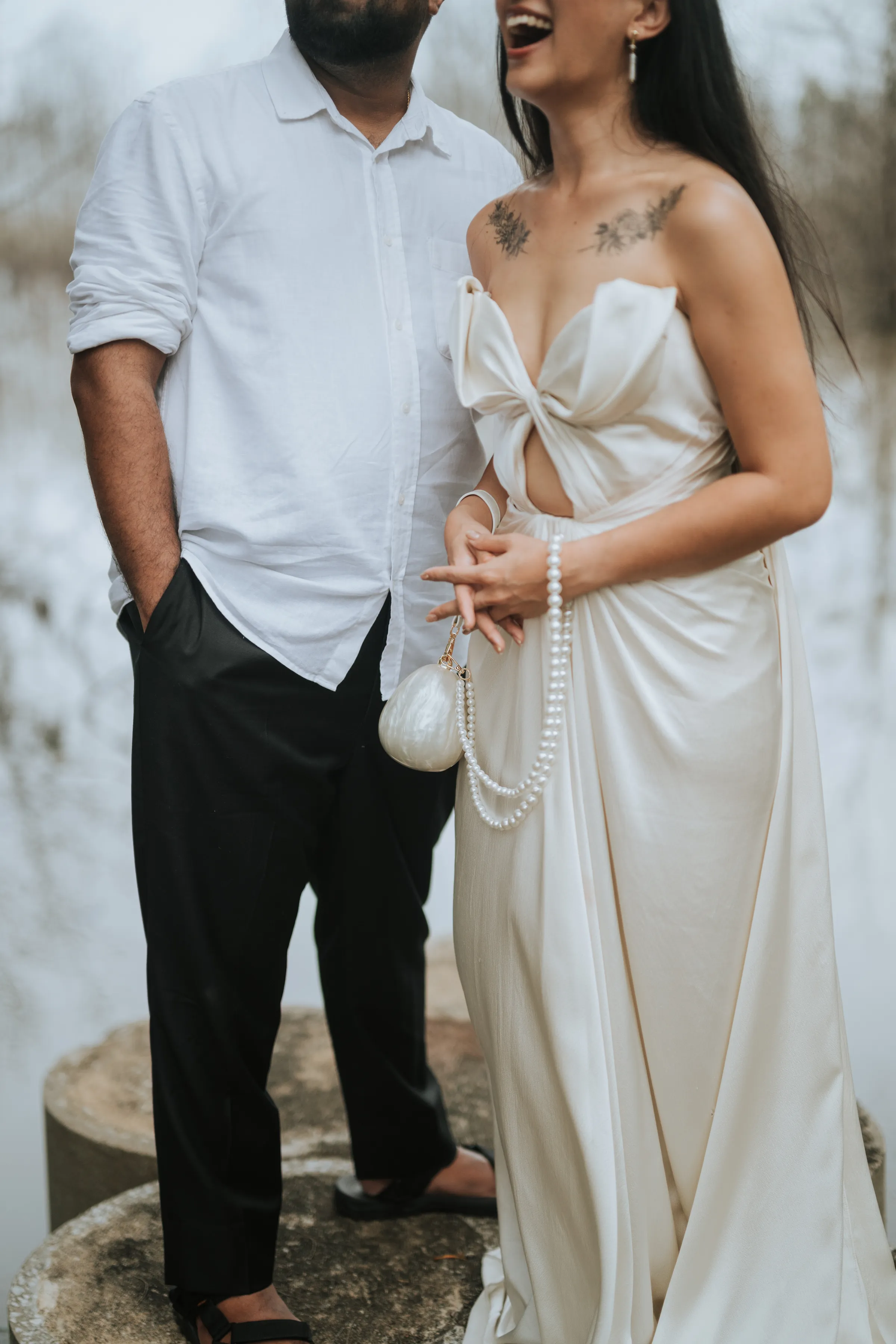 Jessie’s look was effortlessly elegant and refreshingly unconventional. She wore a fluid ivory gown with a central knot detail and front cut-out, giving it both a sculptural quality and an ethereal softness. The dress draped beautifully in the breeze and was paired with a pearl wristlet bag that added a playful, modern touch. Her tattoos and long, loose hair completed the look — nothing felt overstyled, only personality-filled. Joel wore a crisp white shirt with rolled sleeves, paired with black trousers — clean and relaxed, echoing the laid-back mood of the day. Together, their outfits reflected the organic tone of the wedding.