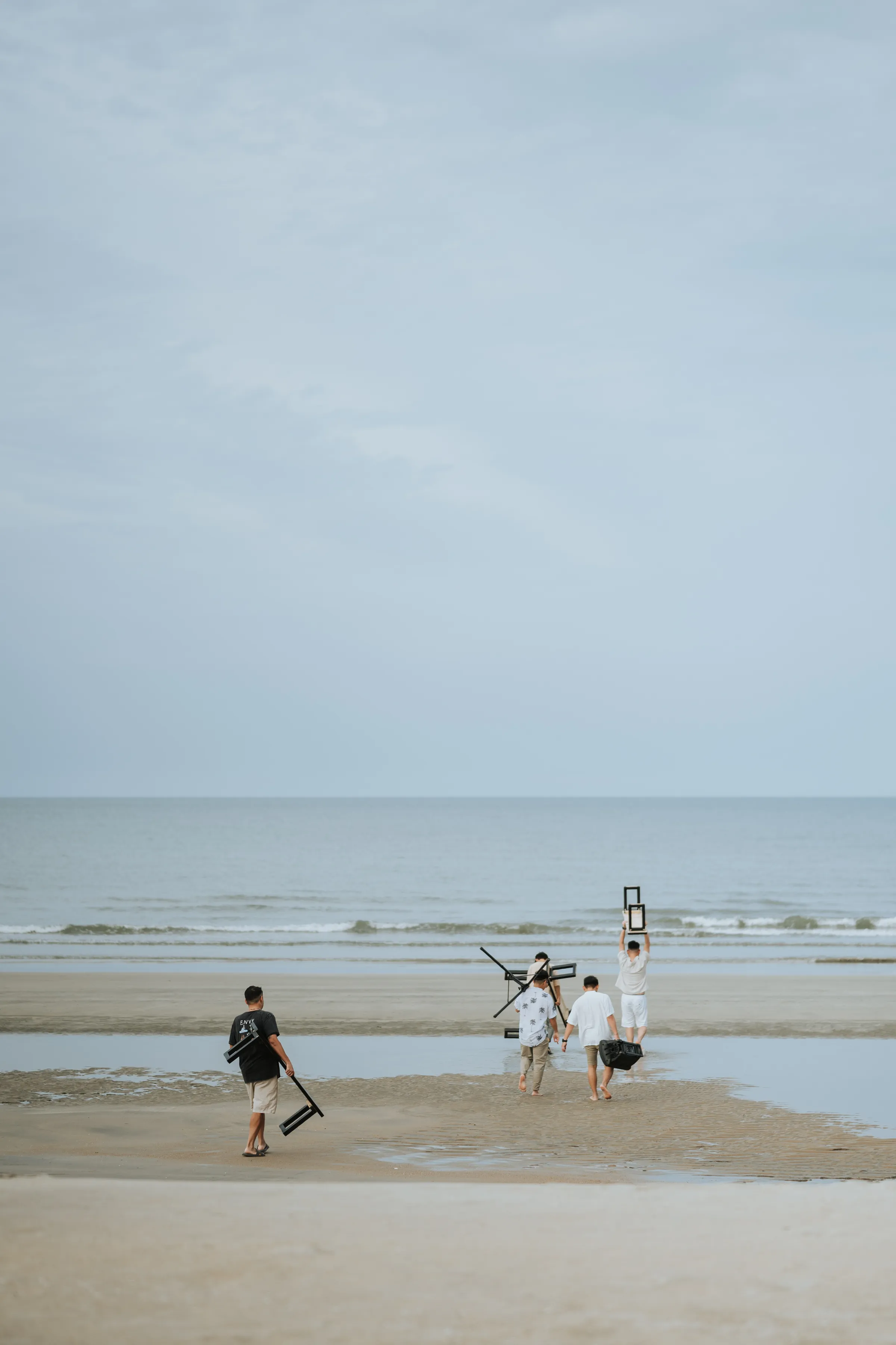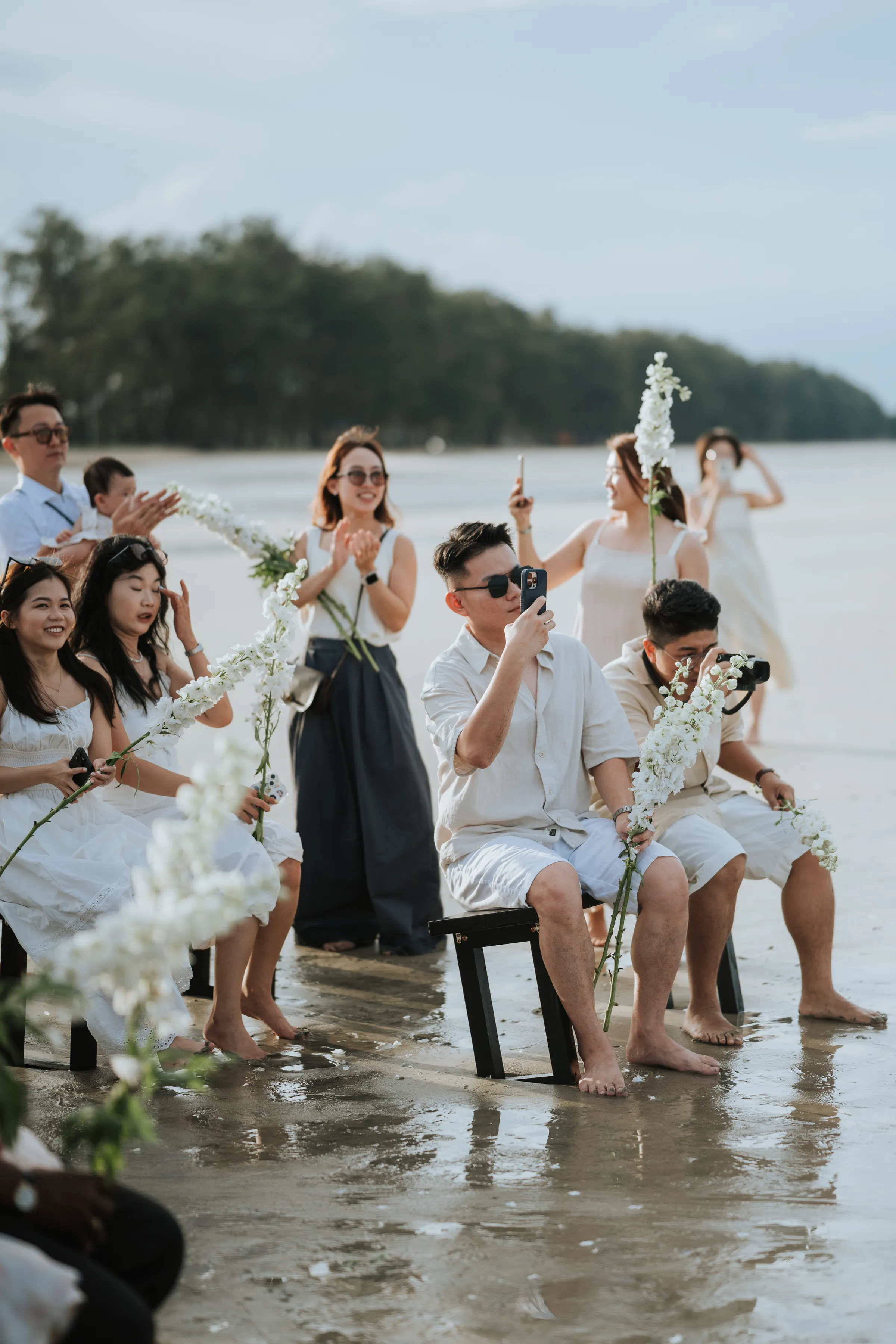 Guests gathered informally by the beach, each holding a single white bloom. Together, they carried benches and chairs, placing them by the tide’s edge as if instinctively creating a sanctuary. There were no arches, aisles, or lavish floral installations — just the sea, the sand, and the people who mattered most.