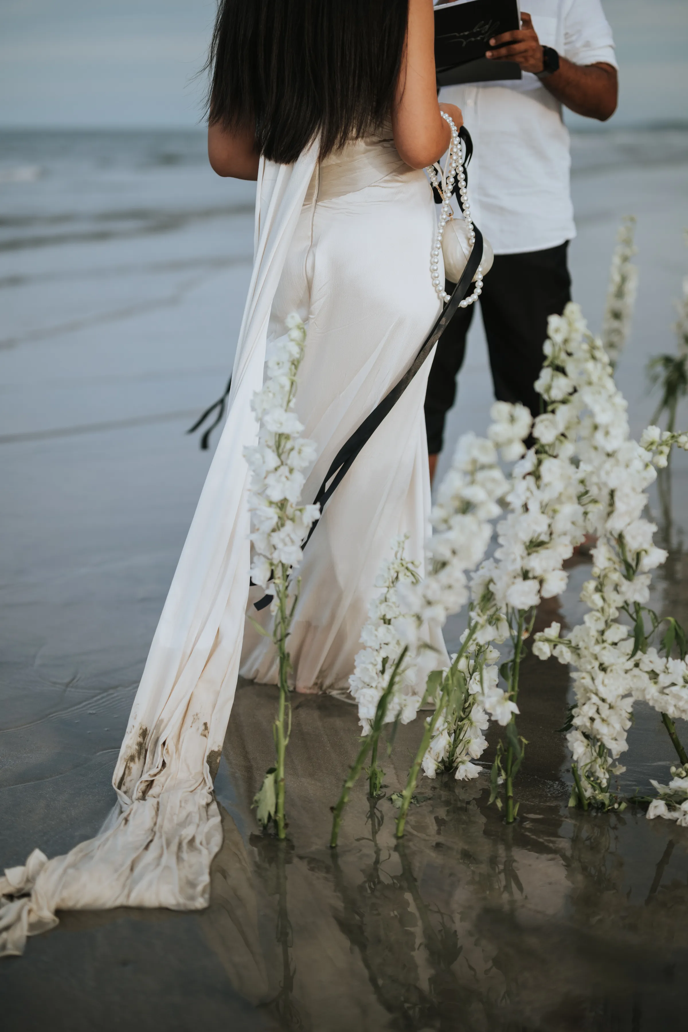The couple arrived on foot, hand-in-hand, walking toward the shoreline they had visited countless times before. Their friends stepped forward one by one, placing their flowers around them in a quiet ritual of unity and blessing. With the waves gently lapping in the background, Jessie and Joel exchanged their vows in the middle of a handmade floral circle — not only sustainable but emotionally resonant.