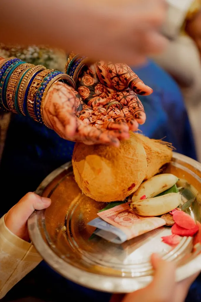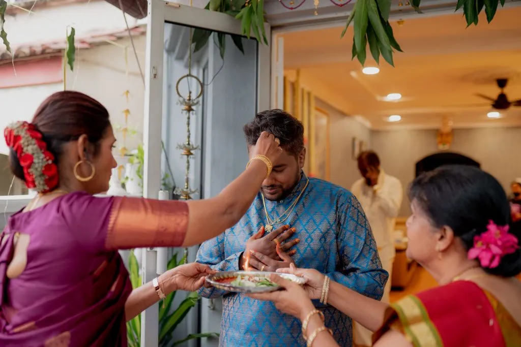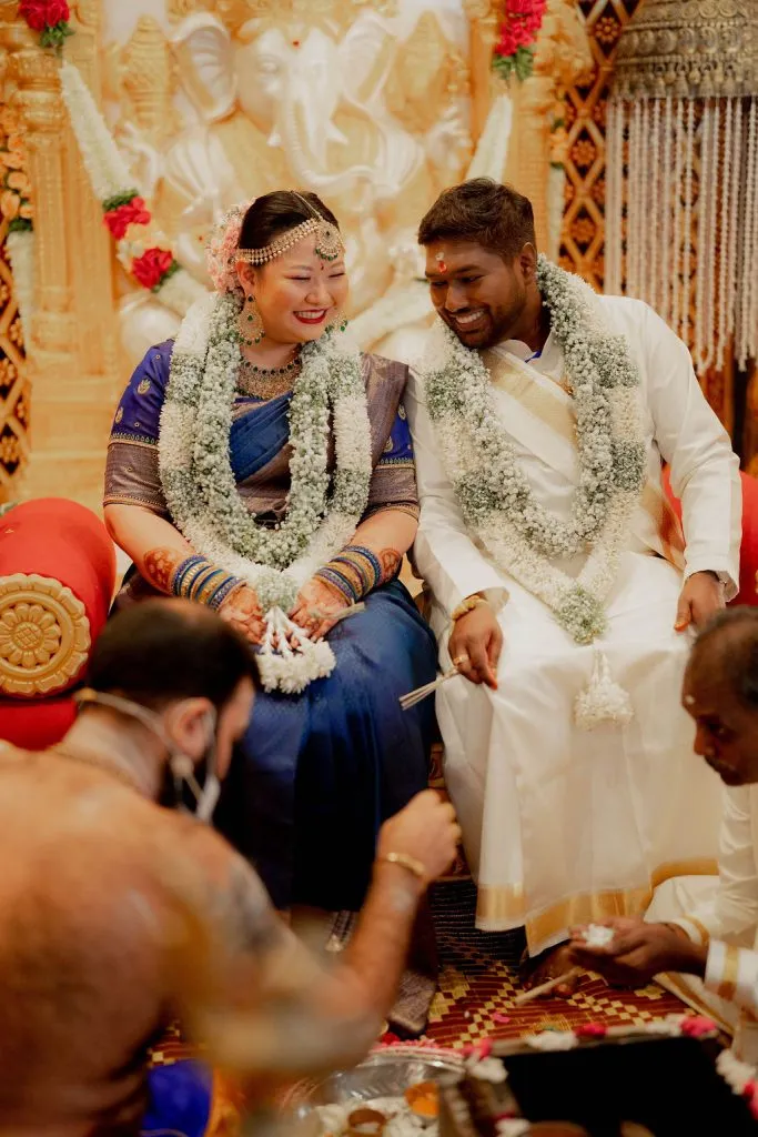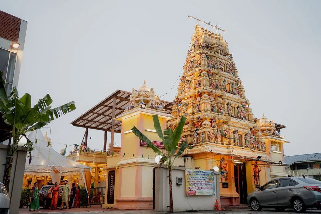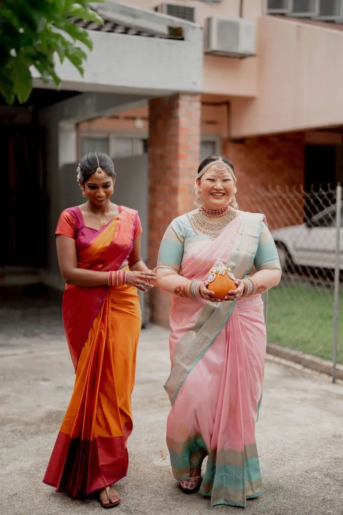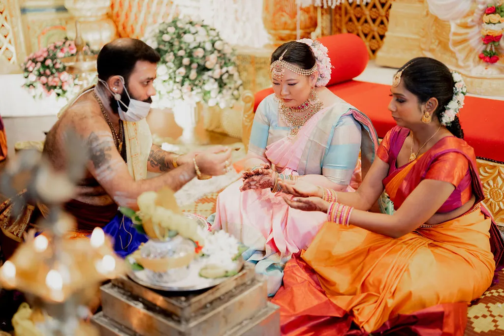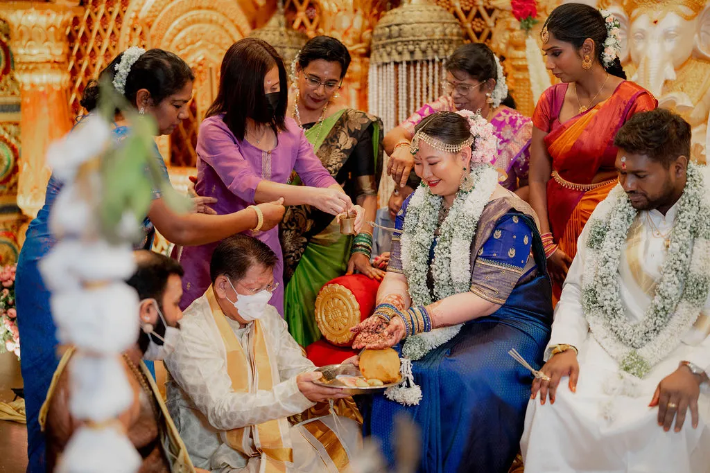 The wedding celebrations lasted over 2 days. Nicole looked flawless in her pink saree and natural makeup as she made her way to the Hindu temple for their first ceremony. And even though Sarvin was delayed by almost an hour having been caught in traffic brought by flooding and heavy rain, it did not show as he stepped out of his vehicle to unite with his bride at the temple. The couple shared a brief first look where Sarvin saw Nicole for the first time in a traditional saree, heavily adorned with matching jewellery and custom drawn henna gracing her hands. To help both families immerse in the customs of both the Chinese and Hindu culture, the bride made placards of the meaning behind each ceremonial step.