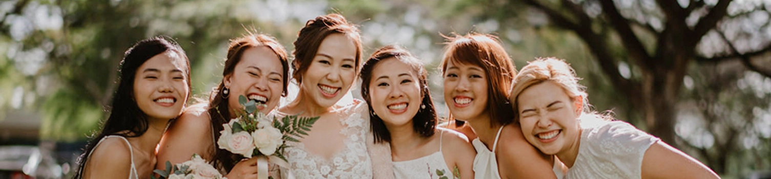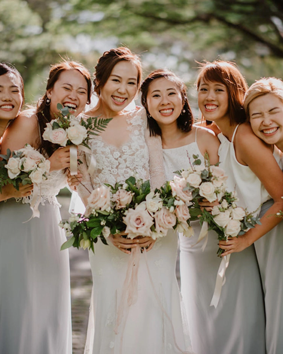 Photography by Bloc Memoire Photography; Wisanto / Videography by Twenty8picks Videography / Ceremony Venue Church of the Good Shepherd, Singapore / Reception Venue Nosh, Singapore / Number of Guests 300 / Bridal Gown by Caramel & Co. and Grace Loves Lace / Bride’s Shoes by Harriet Wilde / Hair and Makeup by Cleo Chang / Jewellery by BHLDN; Maggie Wu Studio / Groom’s Attire by Men’s Tradition / Wedding Bands by Fairy’s Inc / Bridesmaids’ Dresses by Love Bonito / Groomsmen’s Attire by Men’s Tradition / Flowers and Décor by Fiona Treadwell / Catering by Stamford Catering / Art and Stationery by Gifts of Grace Design; Common Hands; dddots
