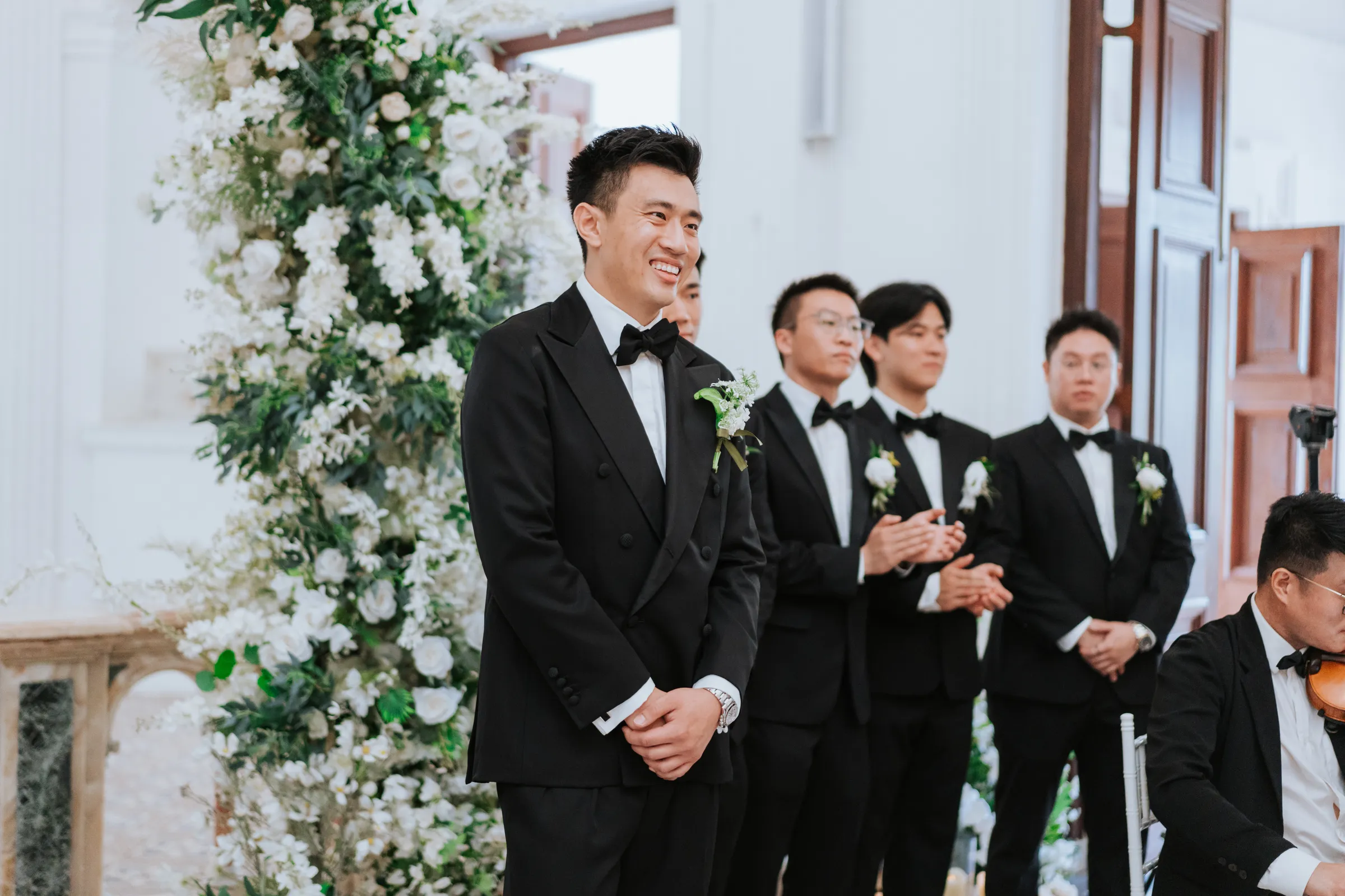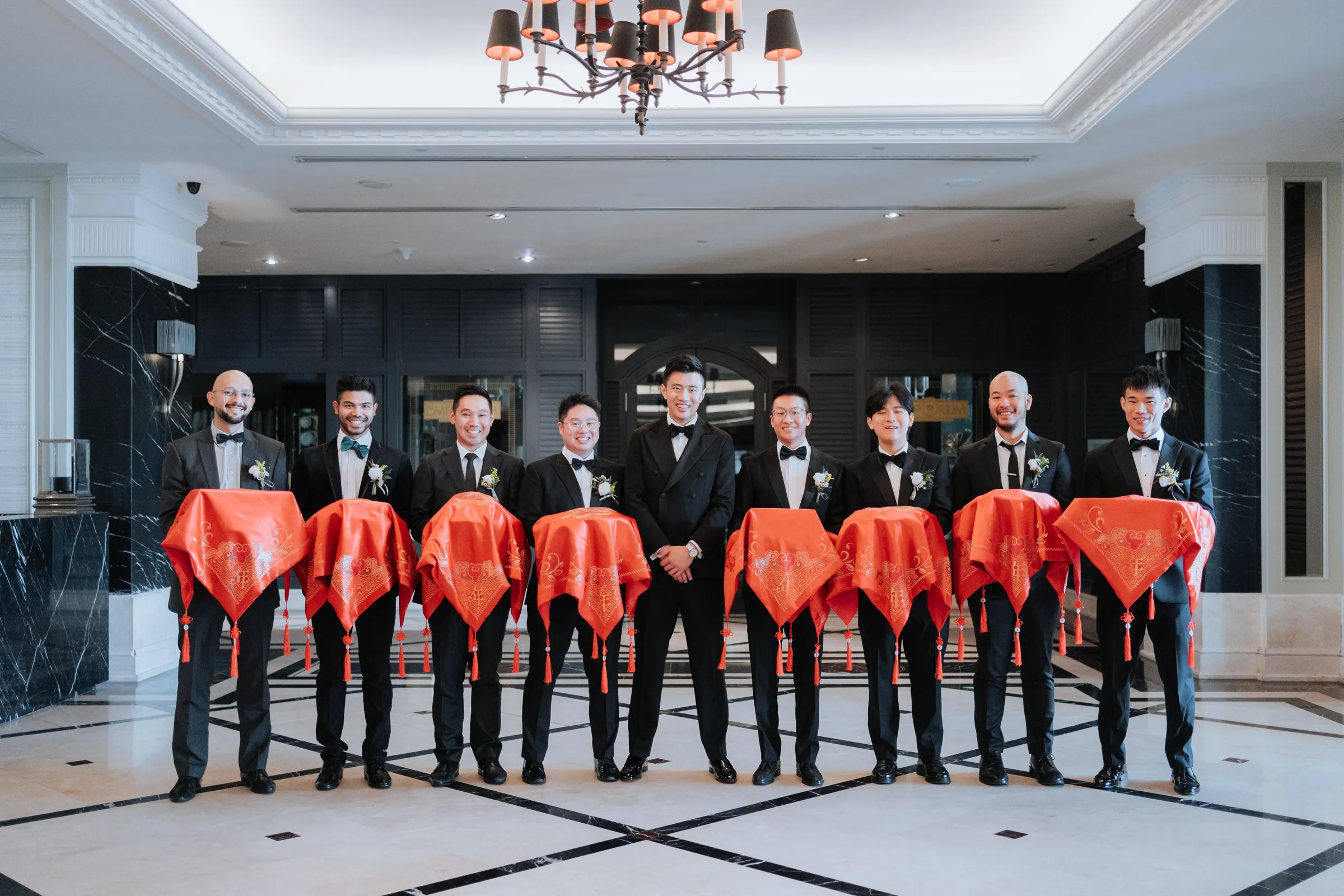 The wedding day started with a traditional Vietnamese gift-bearing ceremony at the bridal suite in the E&O Hotel, featuring trays of gifts including suckling pig, kaya bun, fruits, alcohol, and biscuits. Joel and his groomsmen had to playfully negotiate their way through the door and complete a lively gate-crashing games to reach Melinda. This bustling event was witness by 50 of Melinda’s family members and stood out as one the most memorable moments of the day for this couple.