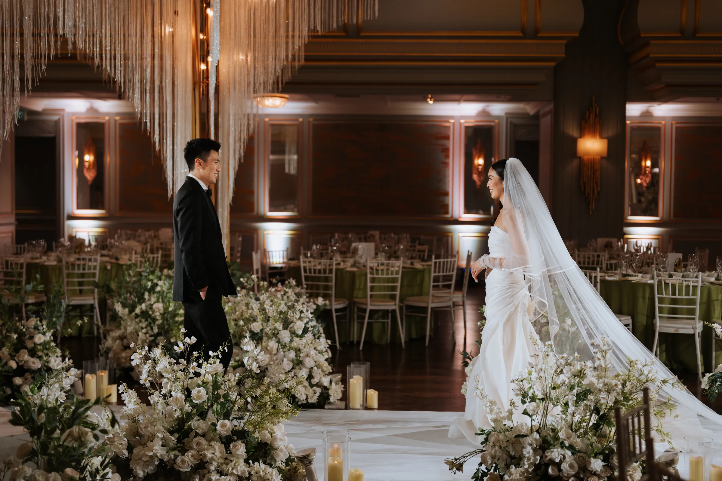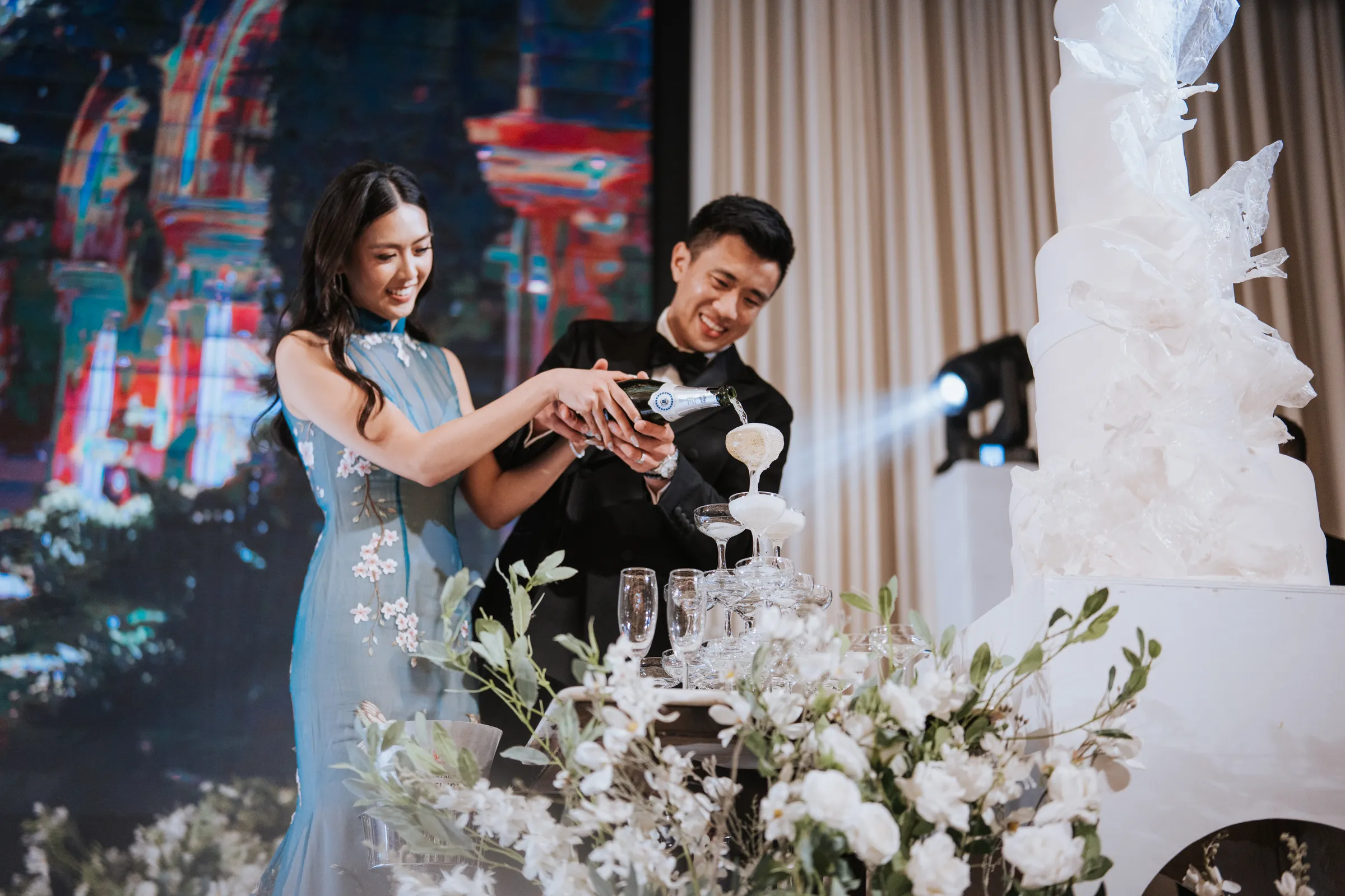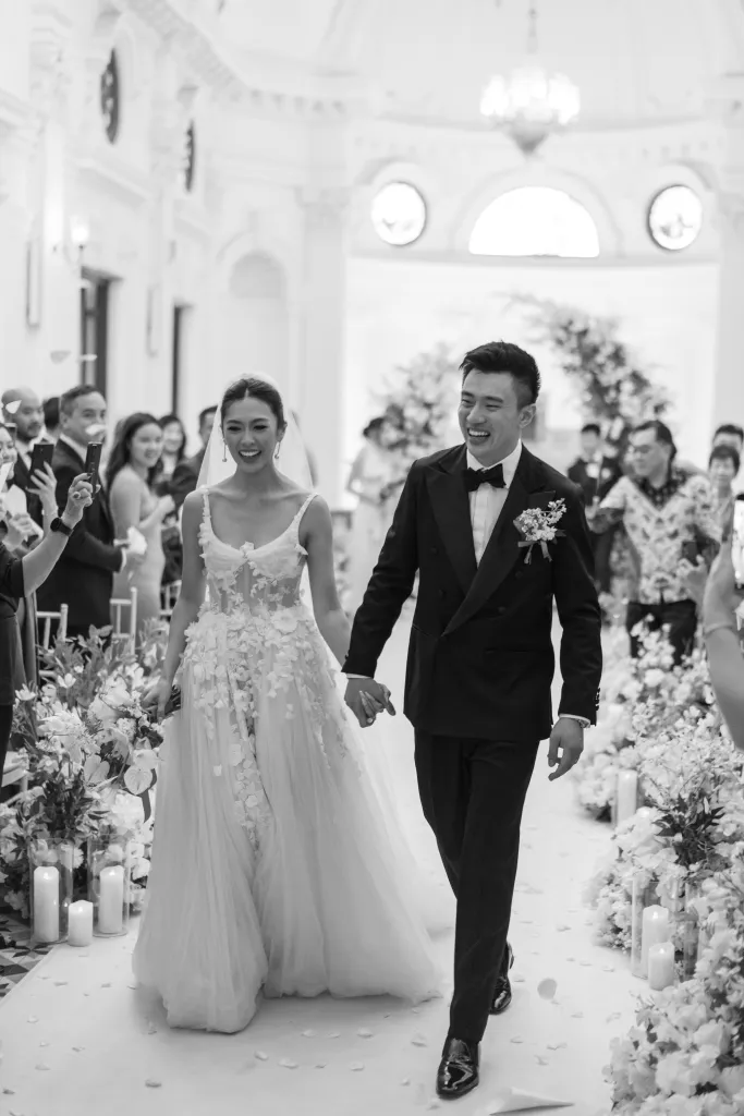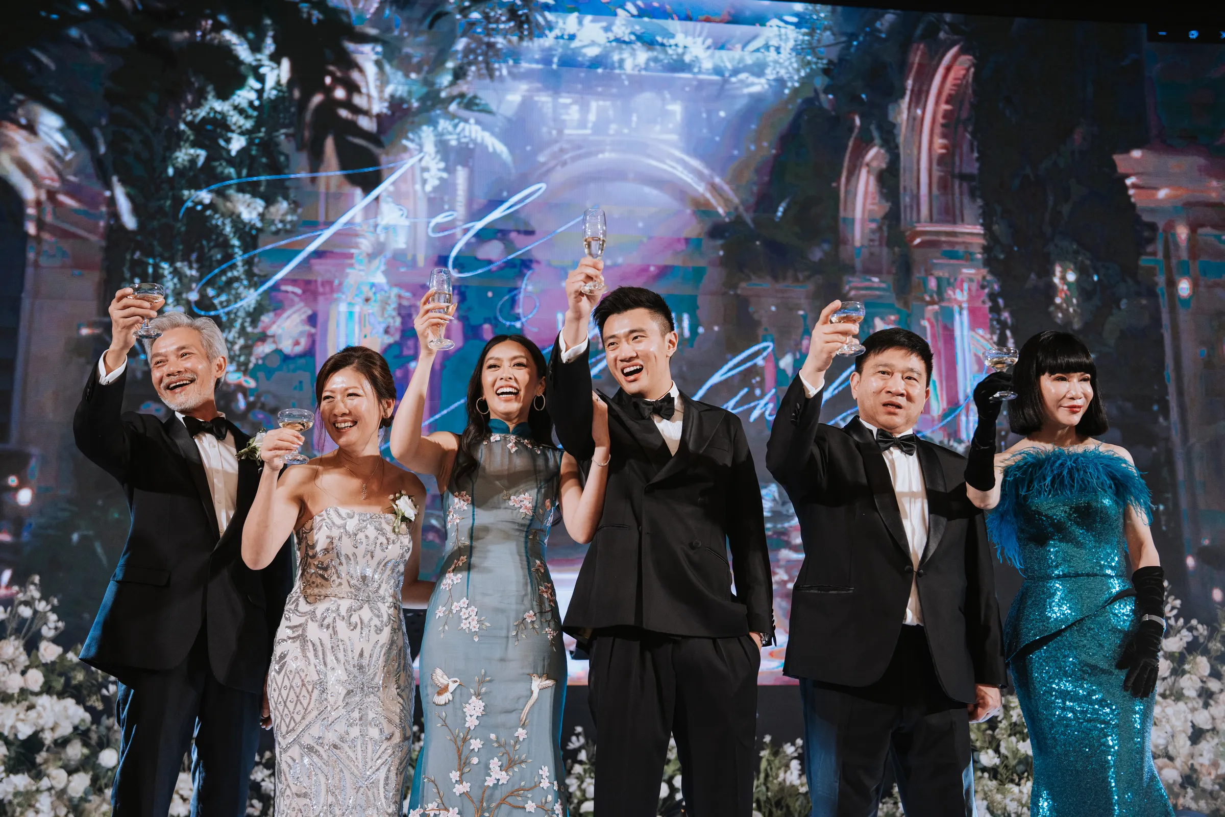 The couple then headed separately to St. Jo @ Gurney Paragon for the wedding ceremony. The evening began with a cocktail session at the grand ballroom courtyard. “We served personalised cocktails included a coriander cocktail as a nod to Mel’s Vietnamese heritage and a green tea cocktail as a nod to Joel’s love for Japan.” As the reception commenced, ballet dancers welcomed guests to their tables, setting a magical tone for the night. Dinner featured a delightful Chinese cuisine, and the evening was filled with live band entertainment, a photo booth with instant prints, and heartfelt speeches.