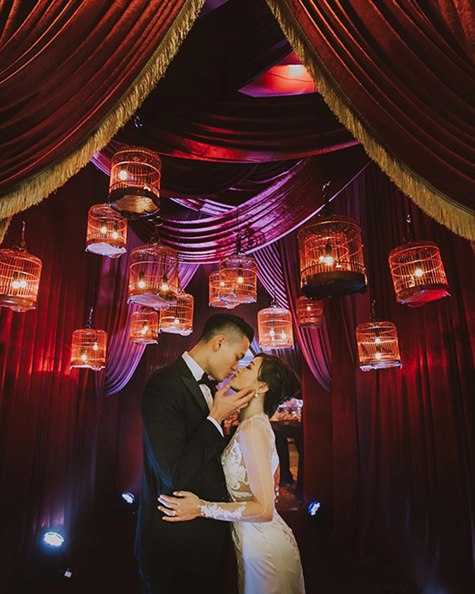 The couple’s openness made them a joy to work with. Drapes in deep shades of burgundy were complemented by wooden birdcages for a dramatic touch. The result was impactful but not cluttered or over the top. “Our first moment of stepping into the banquet hall and onto the red carpet was the best moment ever. We were so anxious but we just rocked it and strutted in like Katy Perry and Justin Timberlake,” said Claudia and Marvin.