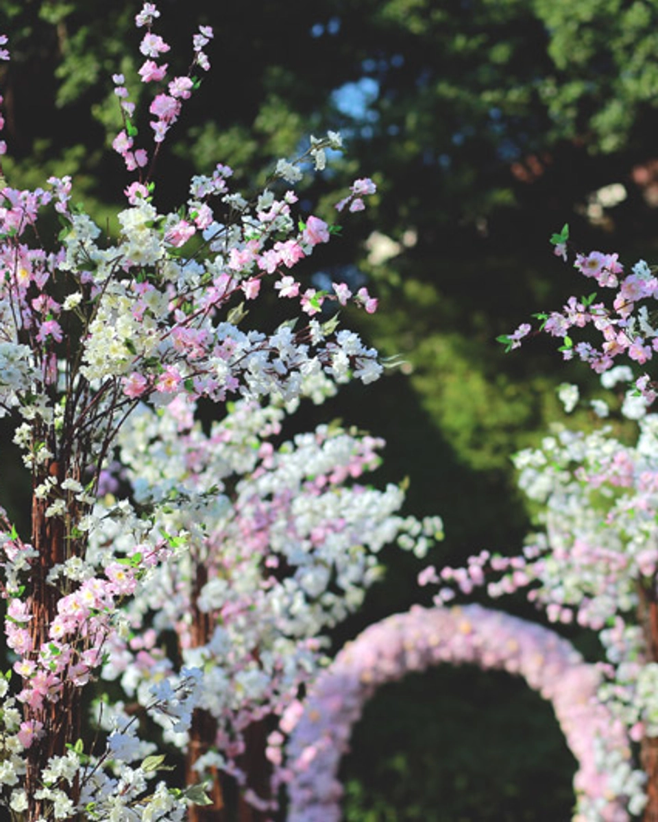 “Inspired by the ethereal beauty of Japanese cherry blossoms, we decided to use them to create an enchanted garden look for both our garden ceremony and dinner reception. A variety of flowers in shades of blush pink were used to decorate the venue. The bridesmaids carried bouquets of pink hydrangeas that stood out against their navy blue dresses. We used pink peonies for my bridal bouquet and the groom’s boutonnière. The wedding cake was made by a family friend and decorated with fresh pink peonies. I have always loved peonies; they are so beautiful and smell so good!