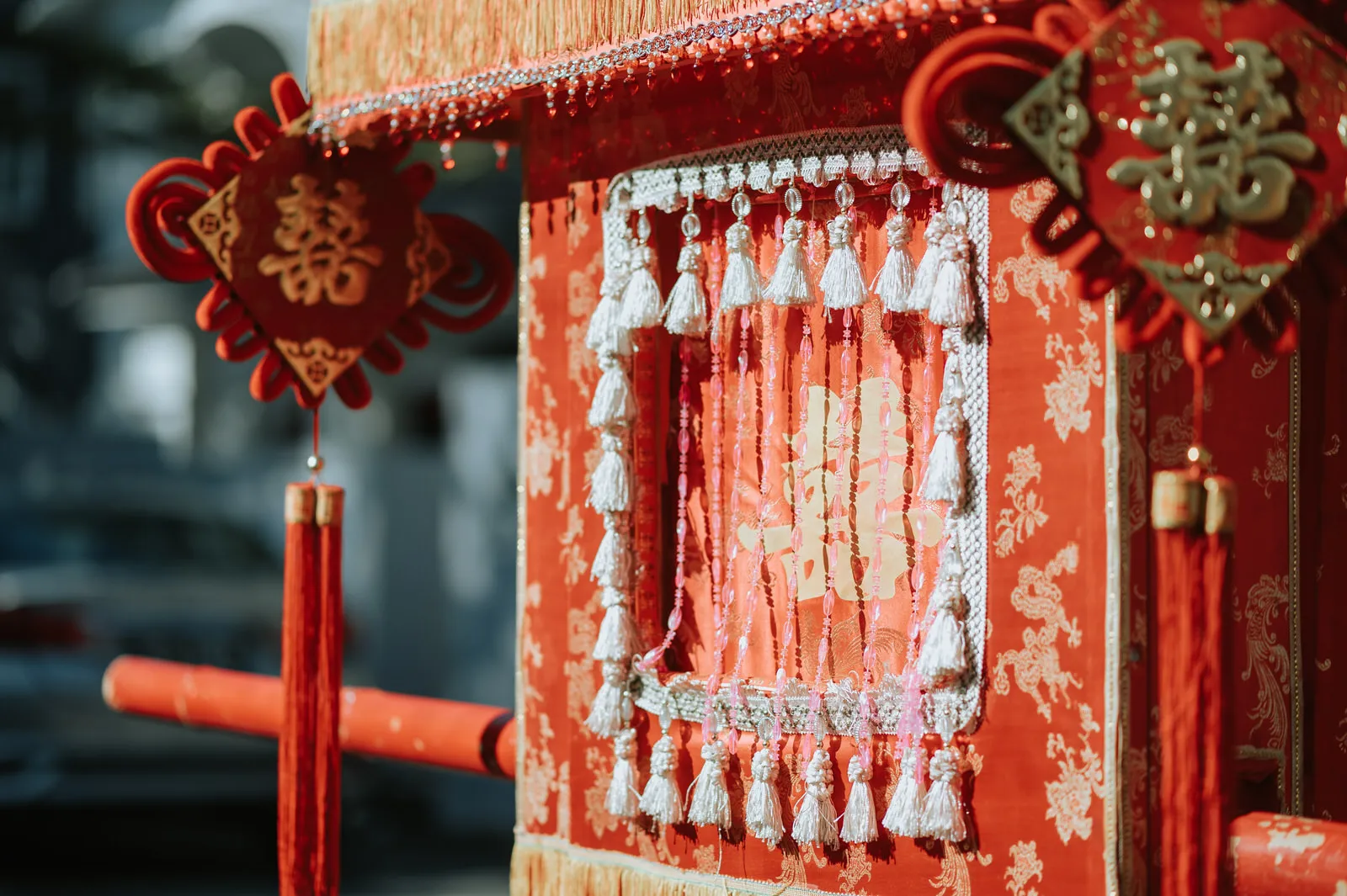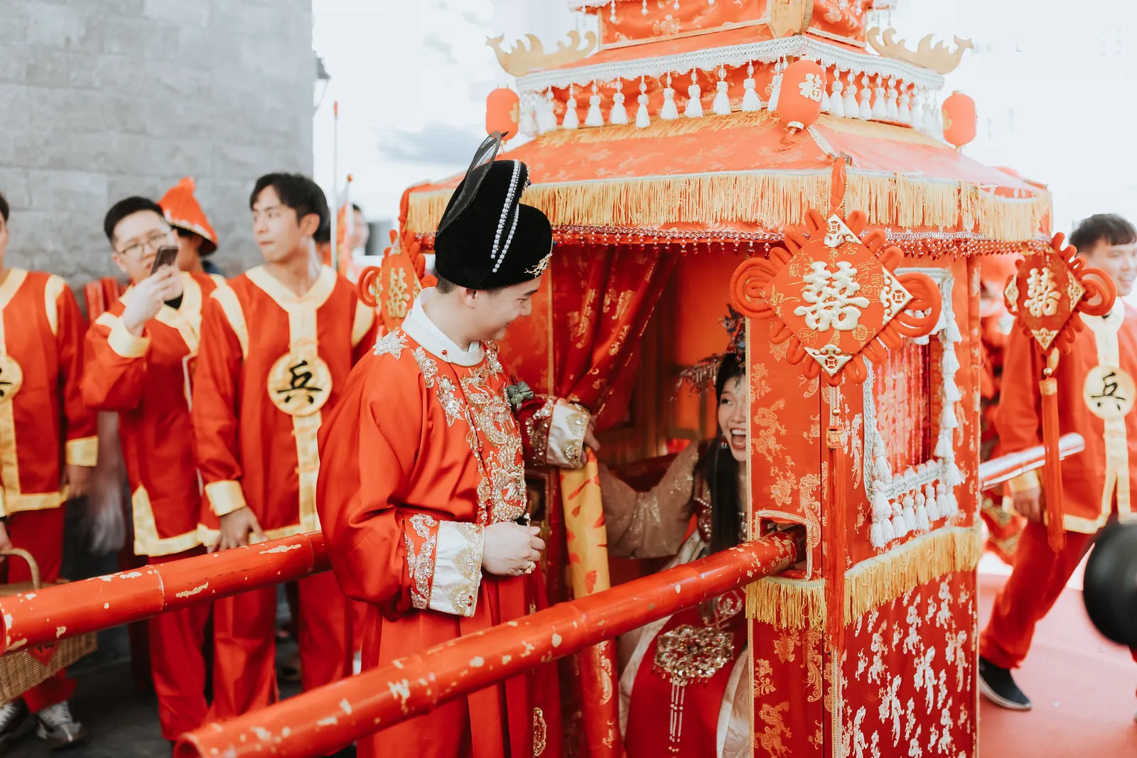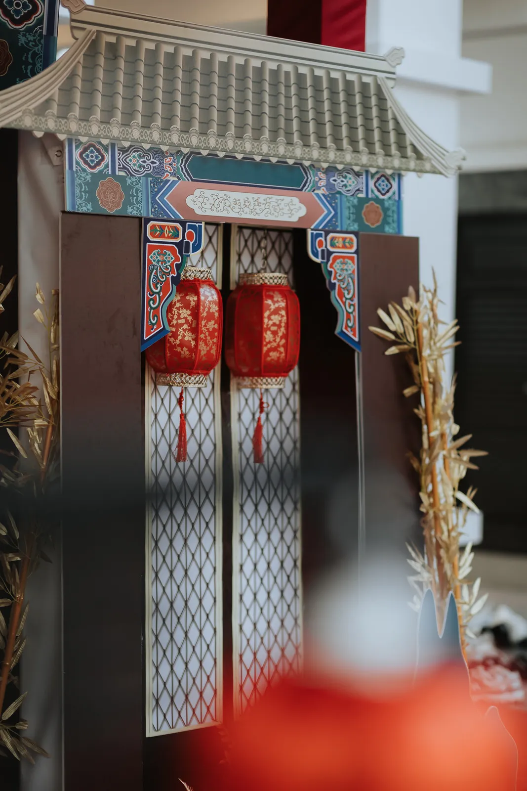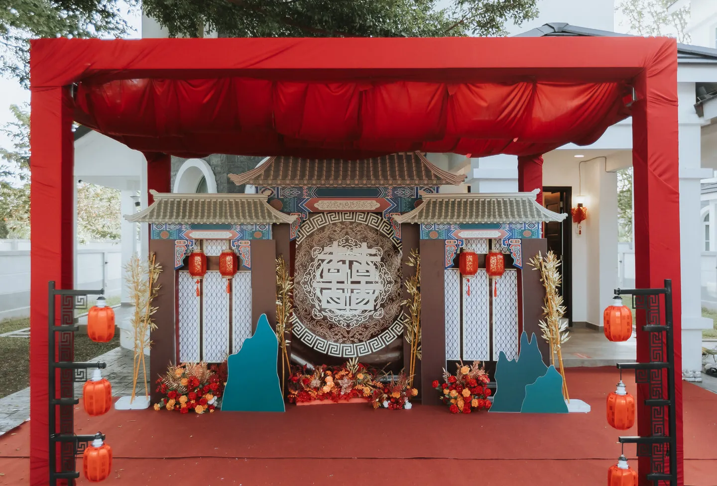 The wedding was an explosion of traditional Chinese elements. The color palette predominantly featured red, symbolizing luck and joy, interspersed with touches of gold for opulence. The decorations included a replica of an ancient Chinese bridal carriage, detailed with tassels and intricate patterns and a Chinese garden pavilion at the entrance of the bride’s home.
