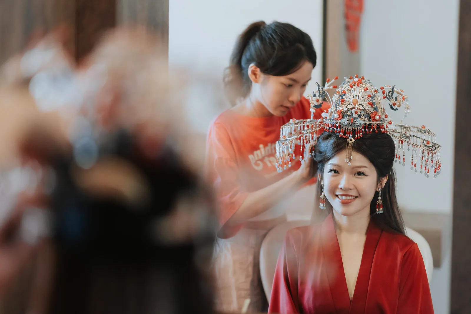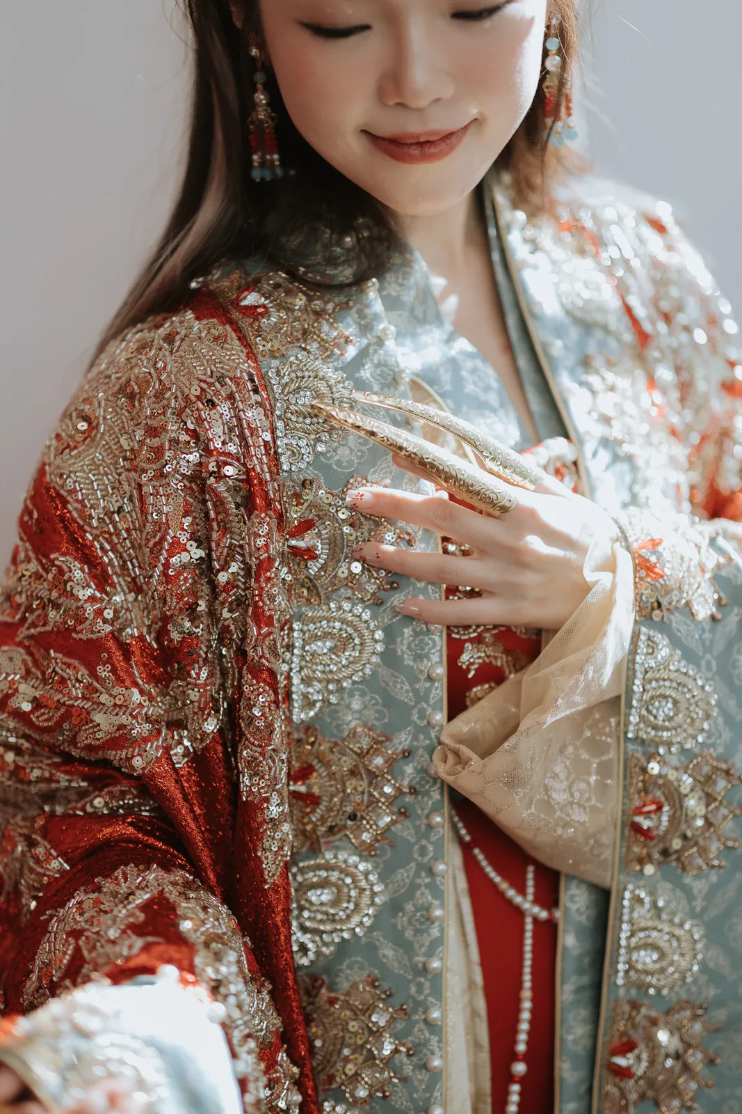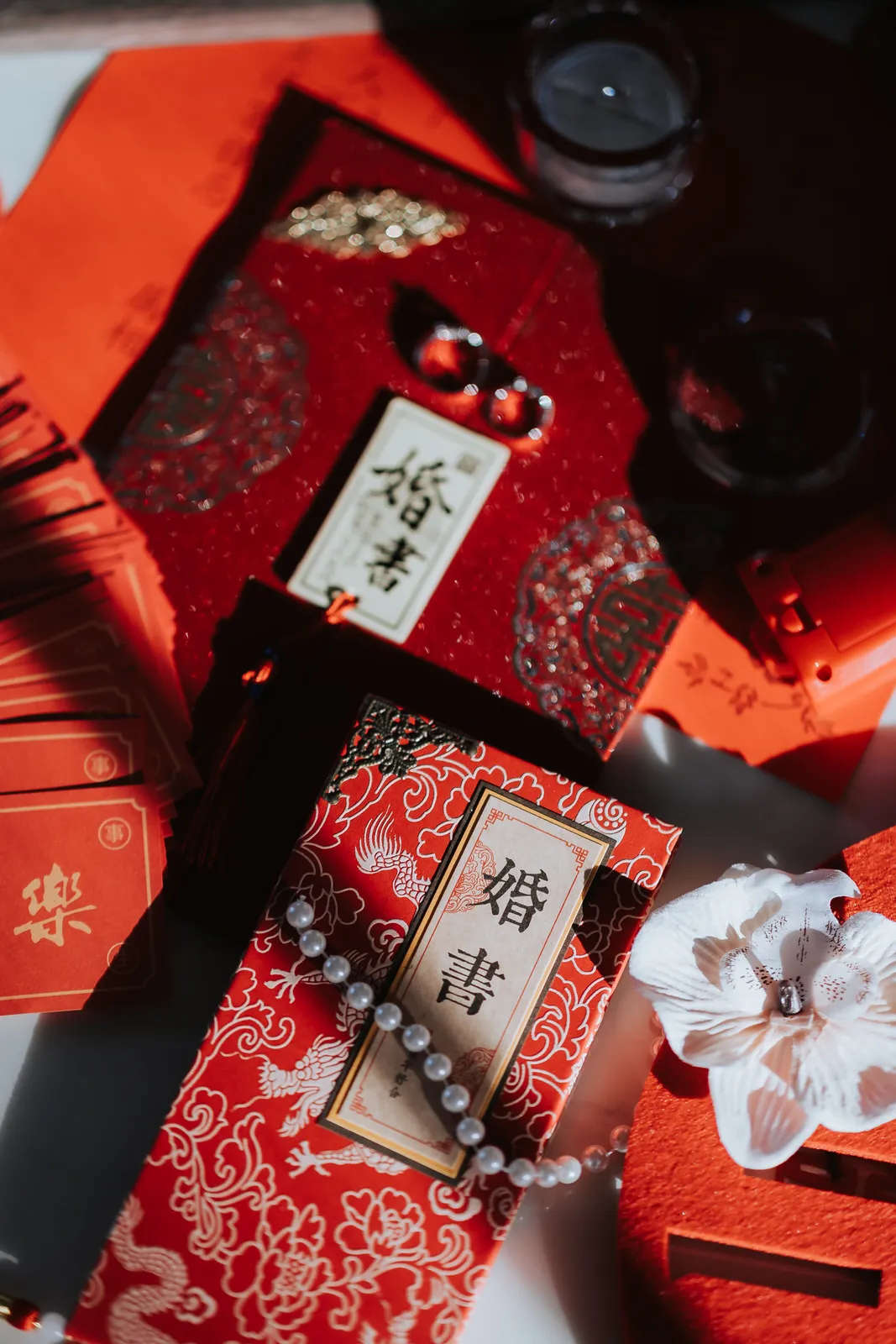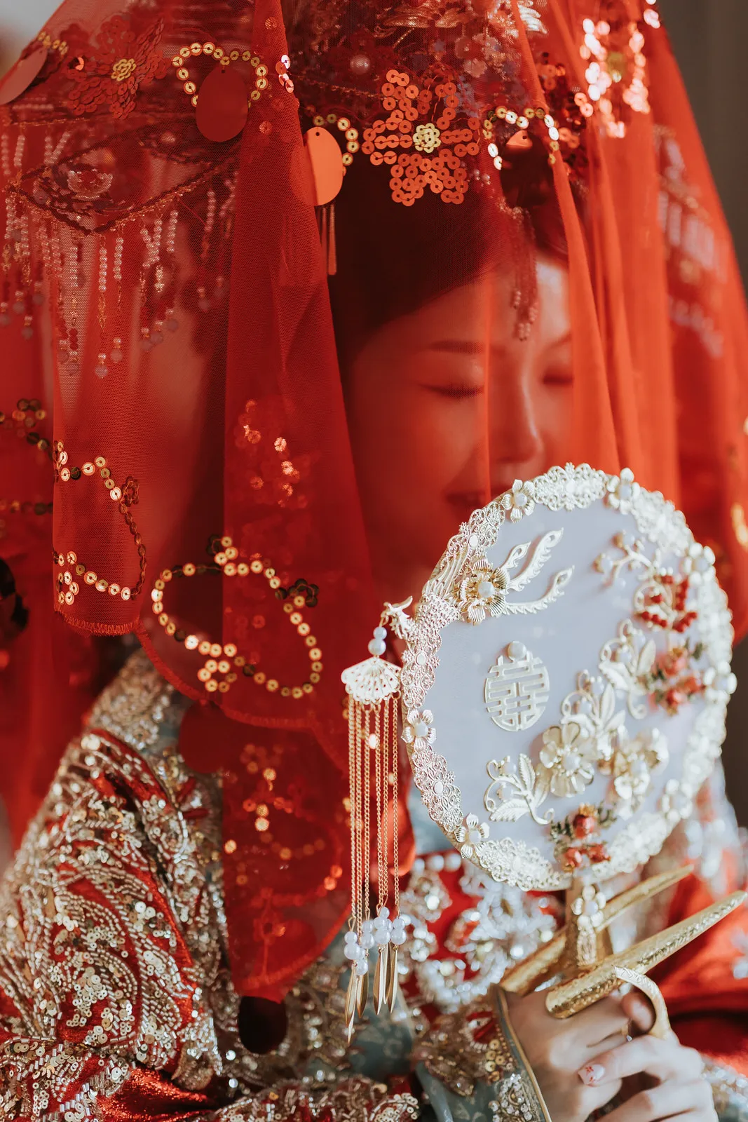 The wedding was an explosion of traditional Chinese elements. The color palette predominantly featured red, symbolizing luck and joy, interspersed with touches of gold for opulence. The decorations included a replica of an ancient Chinese bridal carriage, detailed with tassels and intricate patterns and a Chinese garden pavilion at the entrance of the bride’s home.