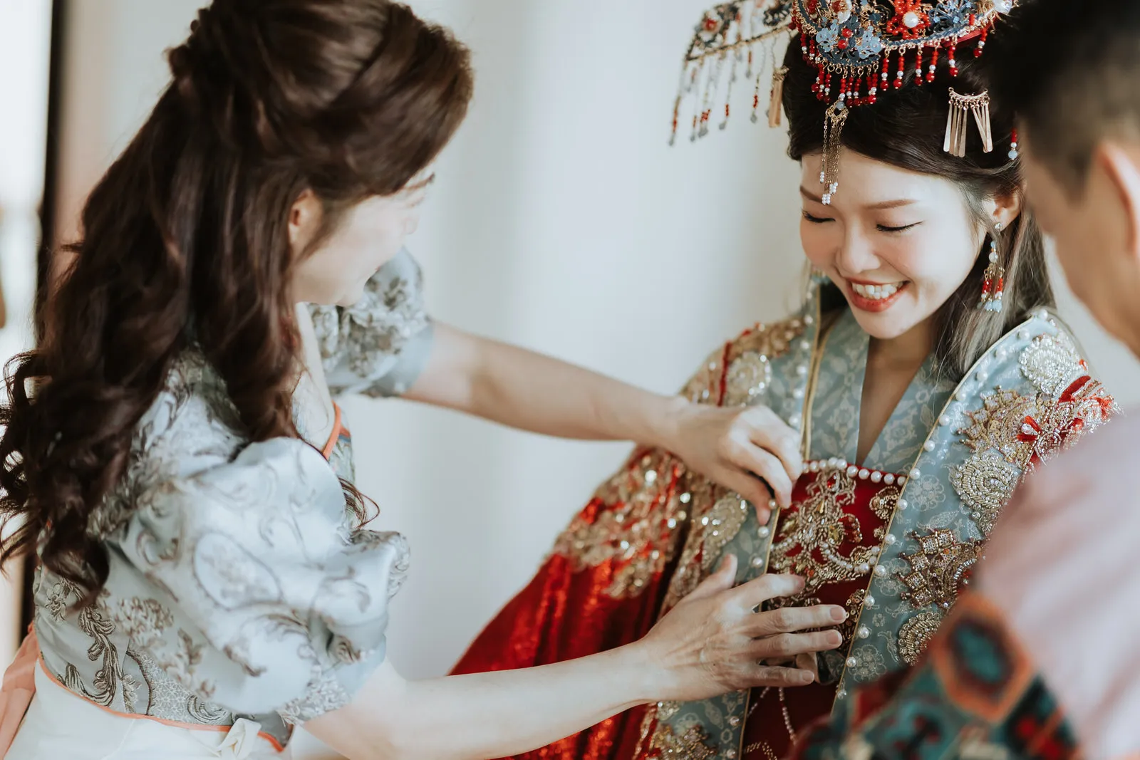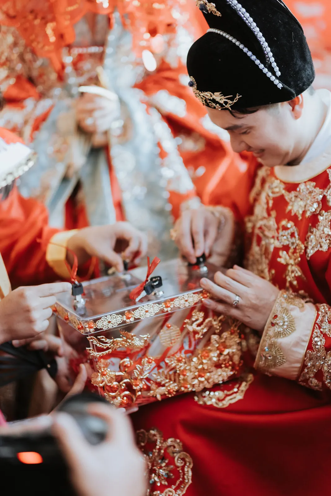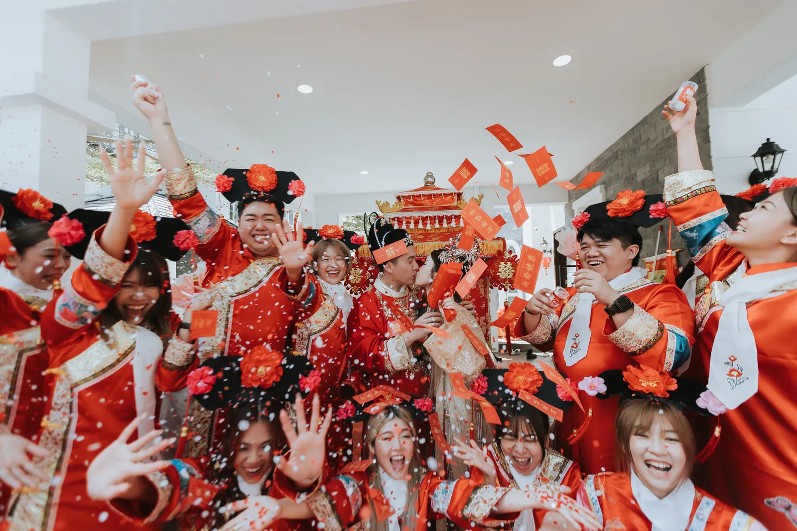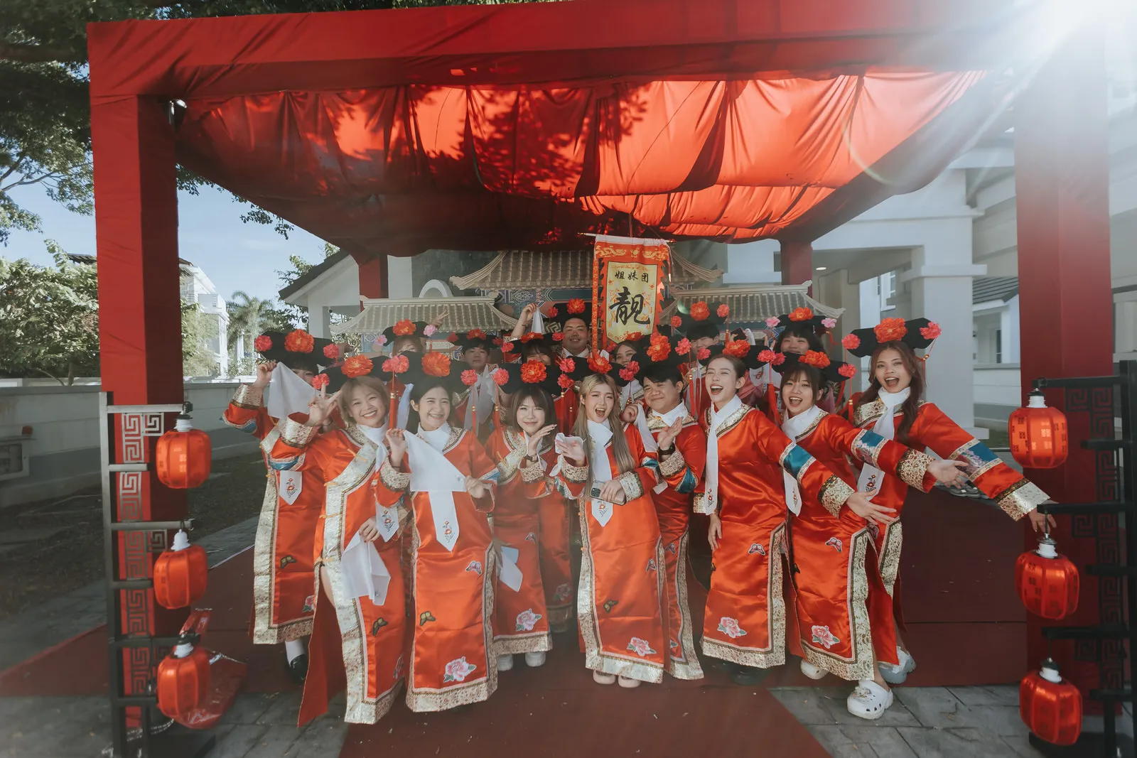 Perhaps the most memorable aspects of the day was the lively participation of the bridesmaids and groomsmen. Numbering a total of 30, dressed in coordinated outfits mimicking various Nucai (奴才) such as ladies’maids and male servants. Their comical enthusiasm added a dynamic energy to the gatecrashing games, ensuring Aaron faced worthy challenges before he could reach his bride. The spirited activities, full of laughter and camaraderie, were a testament to the strong bonds between the couple and their friends.