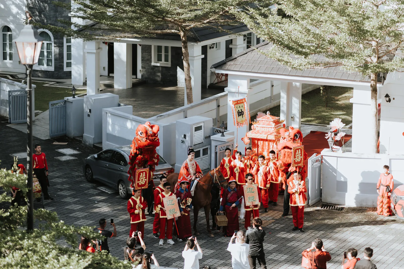 Aaron and Cayee leaned fully into the display of cultural richness and personality, highlighted by their choice to don full traditional Hanfu (漢服) attire. Cayee’s wedding attire was a visual feast, featuring intricate embroidery and a luxurious blend of red and gold threads. Her headdress and accessories mirrored the elegance of her outfit. Aaron, equally majestic, arrived at Cayee’s house on horseback complete with entourage that matches the ancient affluent Chinese families of old.