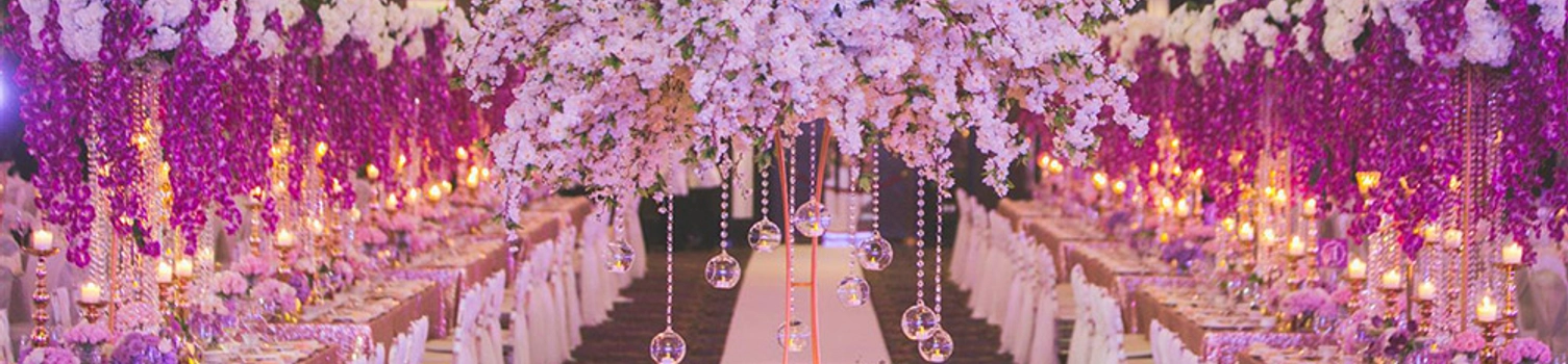 With the theme of purple romance, this wedding dinner in the fabled Majestic Hotel is a visual fairytale of dreamy florals and glowing candlelight. Various shades of purple were used throughout, accented by soft whites, pale pinks and glittering gold. With elegant candlesticks and gleaming crystal hangings to round things out, the whole atmosphere was one of romantic softness through and through.