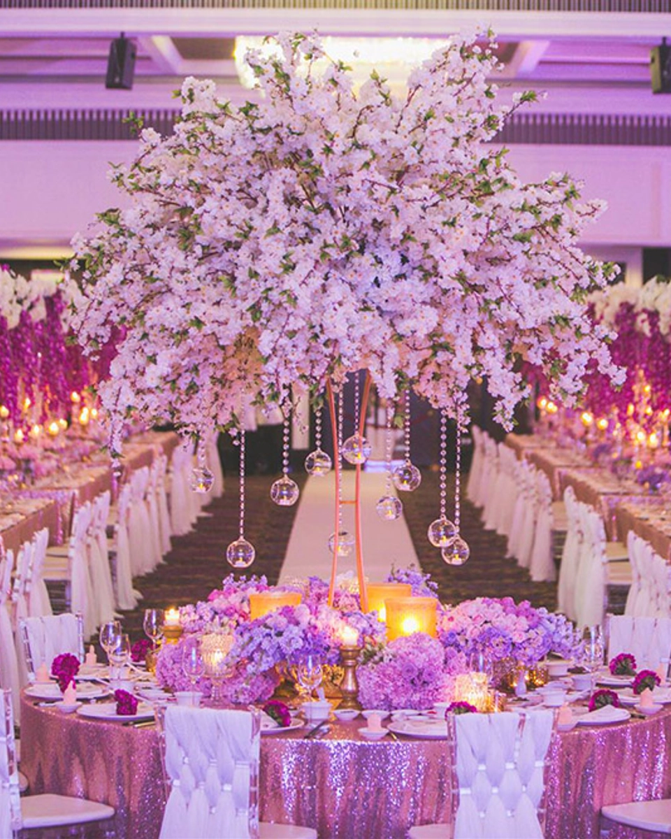 One standout feature that we loved in particular were the Viking table arrangements on each side of the aisle. This allowed for the very effective use of vertical centrepieces, which lead the eye in an unbroken line to the focal point of the whole hall — the main table with its towering centrepiece of cherry blossom branches. With such flawless execution, it must have been a dream come true for the wedded couple!