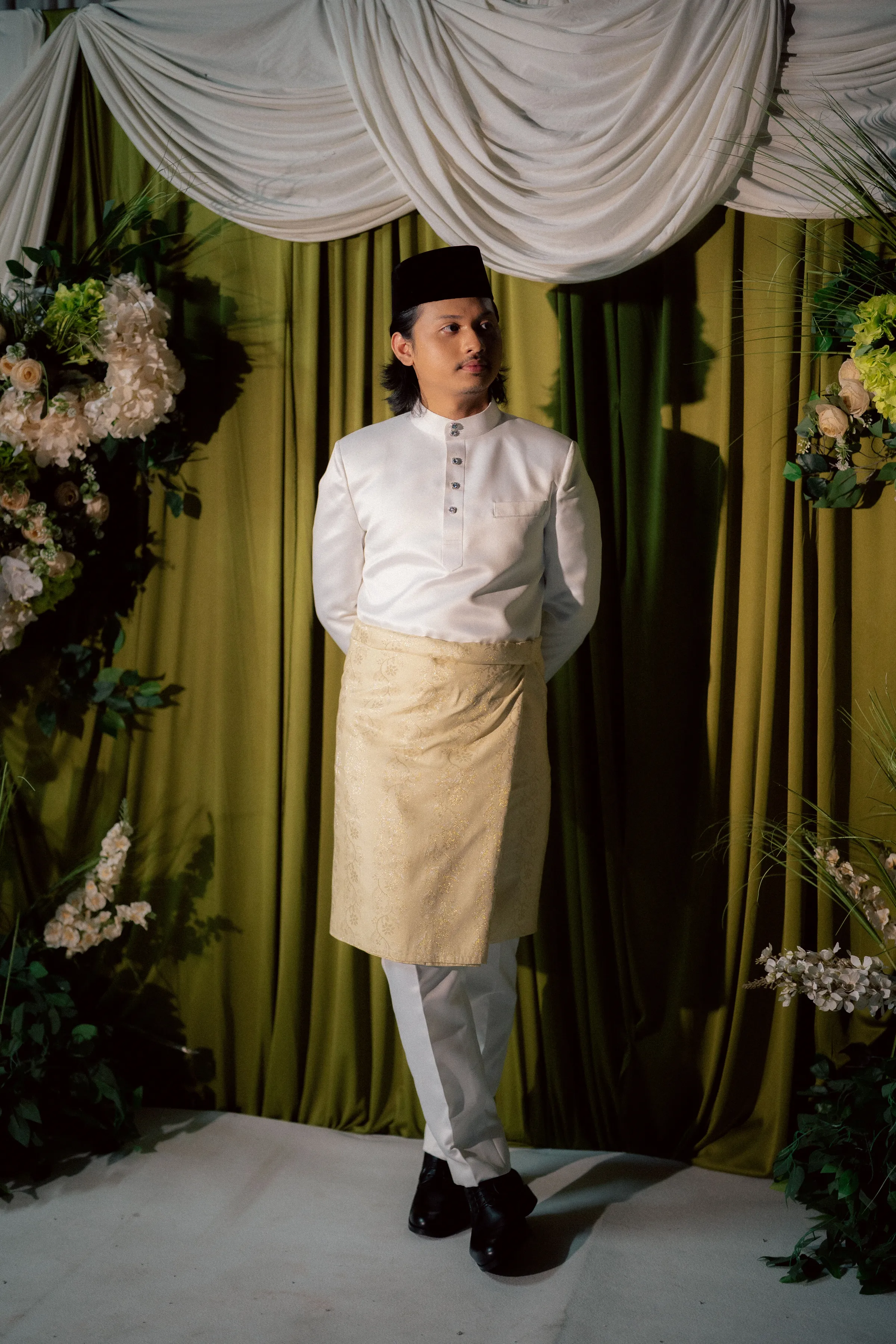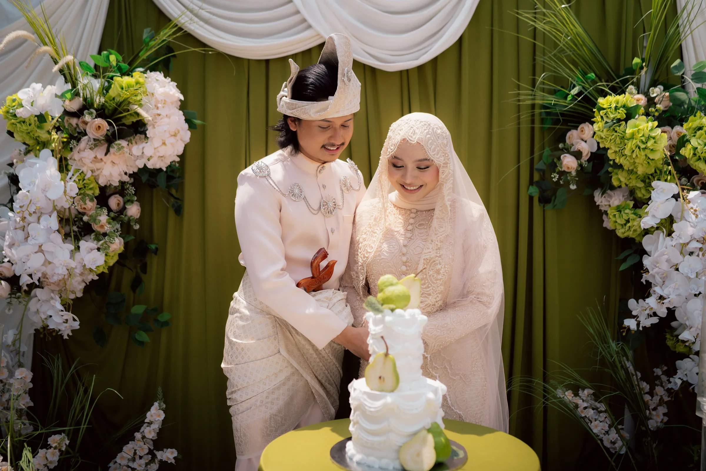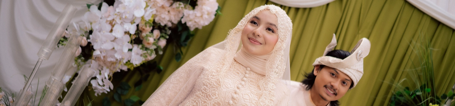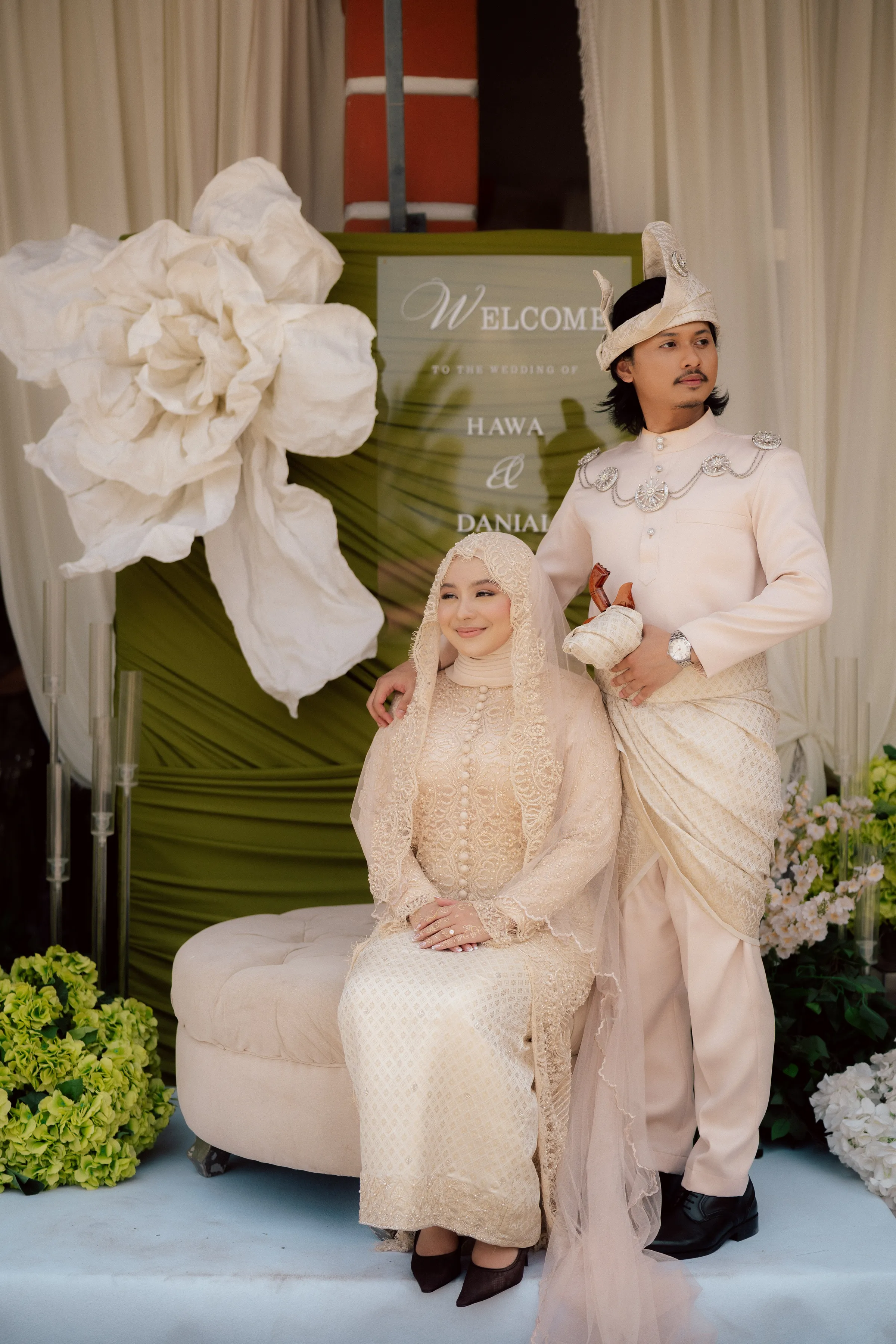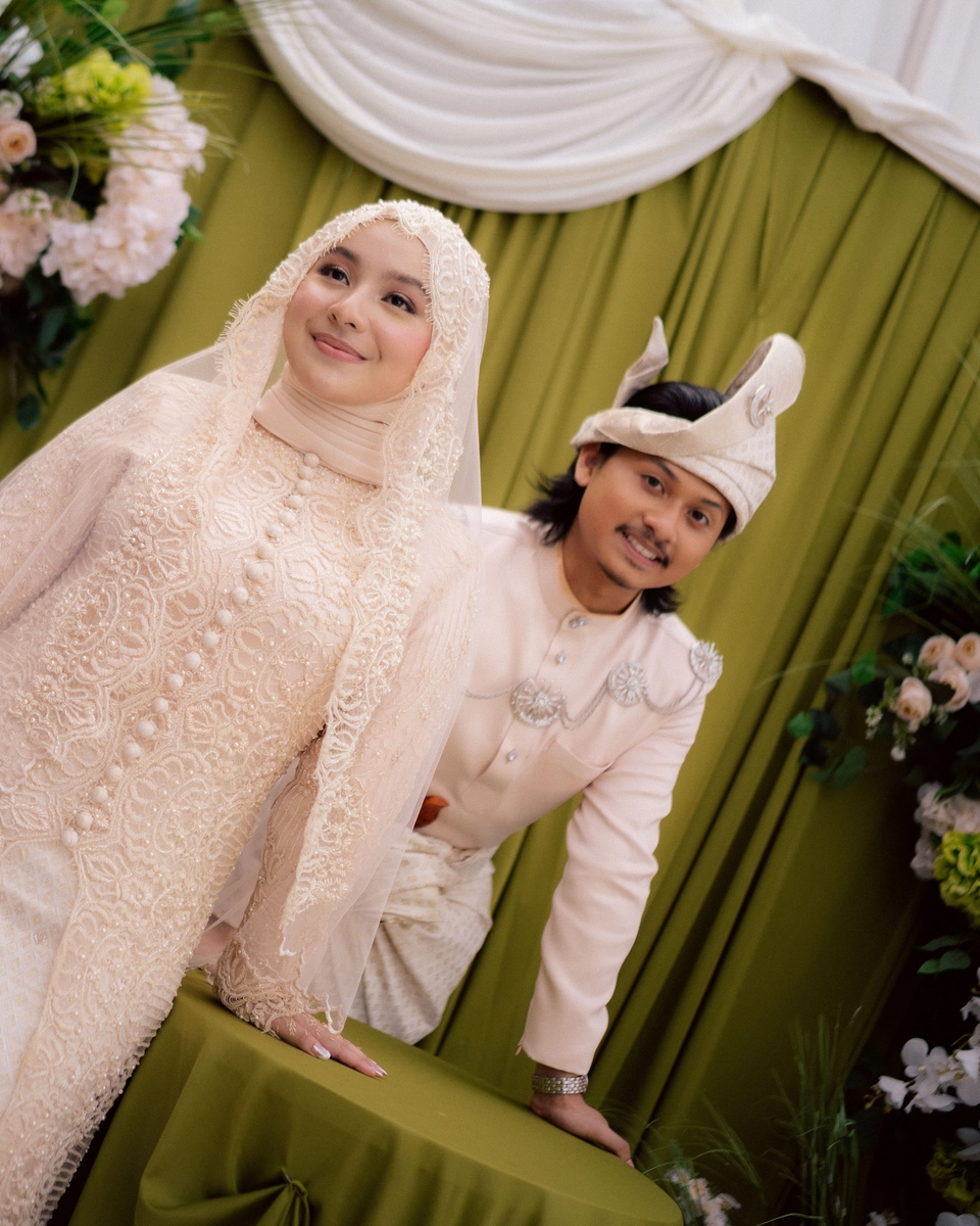 The bridal styling reflects a refined interpretation of traditional Malay wedding attire, elevated with contemporary detailing. Hawa's second look is a delicately embroidered ensemble in soft champagne tones. The lacework and bead detailing lend a couture-like finish, striking a balance between modesty and opulence. Her overall look is luminous, allowing texture and craftsmanship to take centre stage. Danial complements her in a classic baju Melayu, styled in a muted, harmonious palette. Together, their outfits feel cohesive—anchored in heritage yet thoughtfully align with the wedding’s aesthetic direction.
