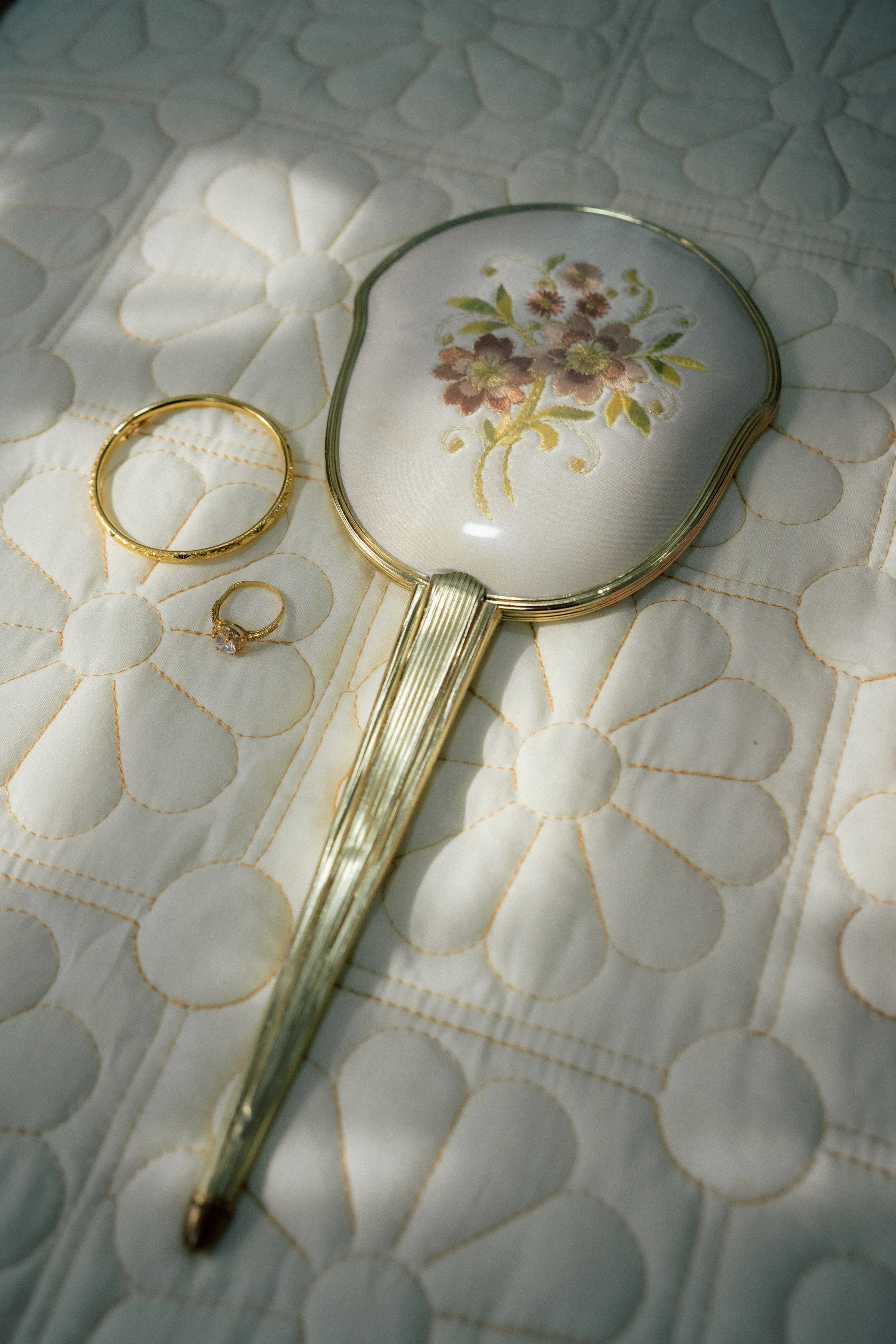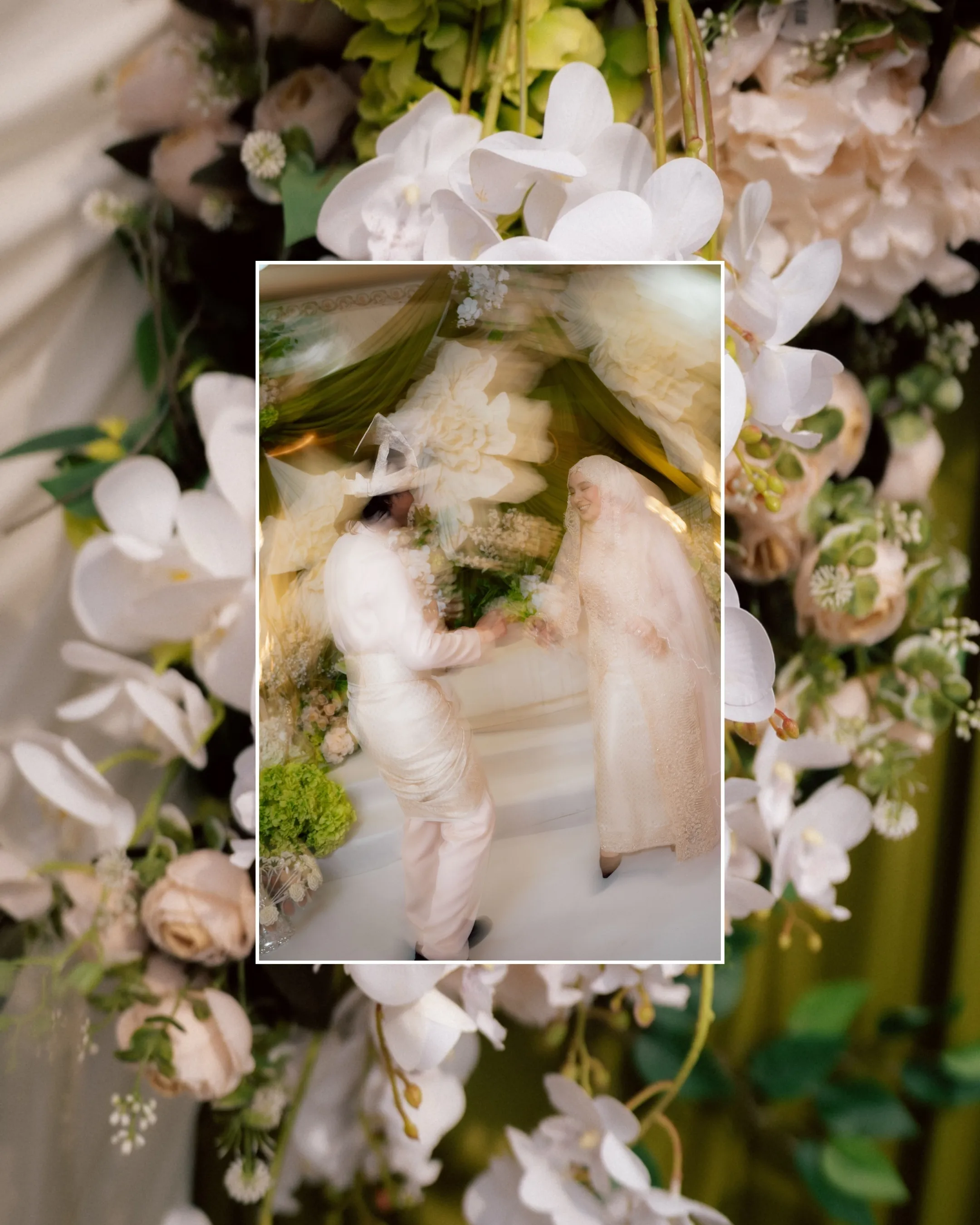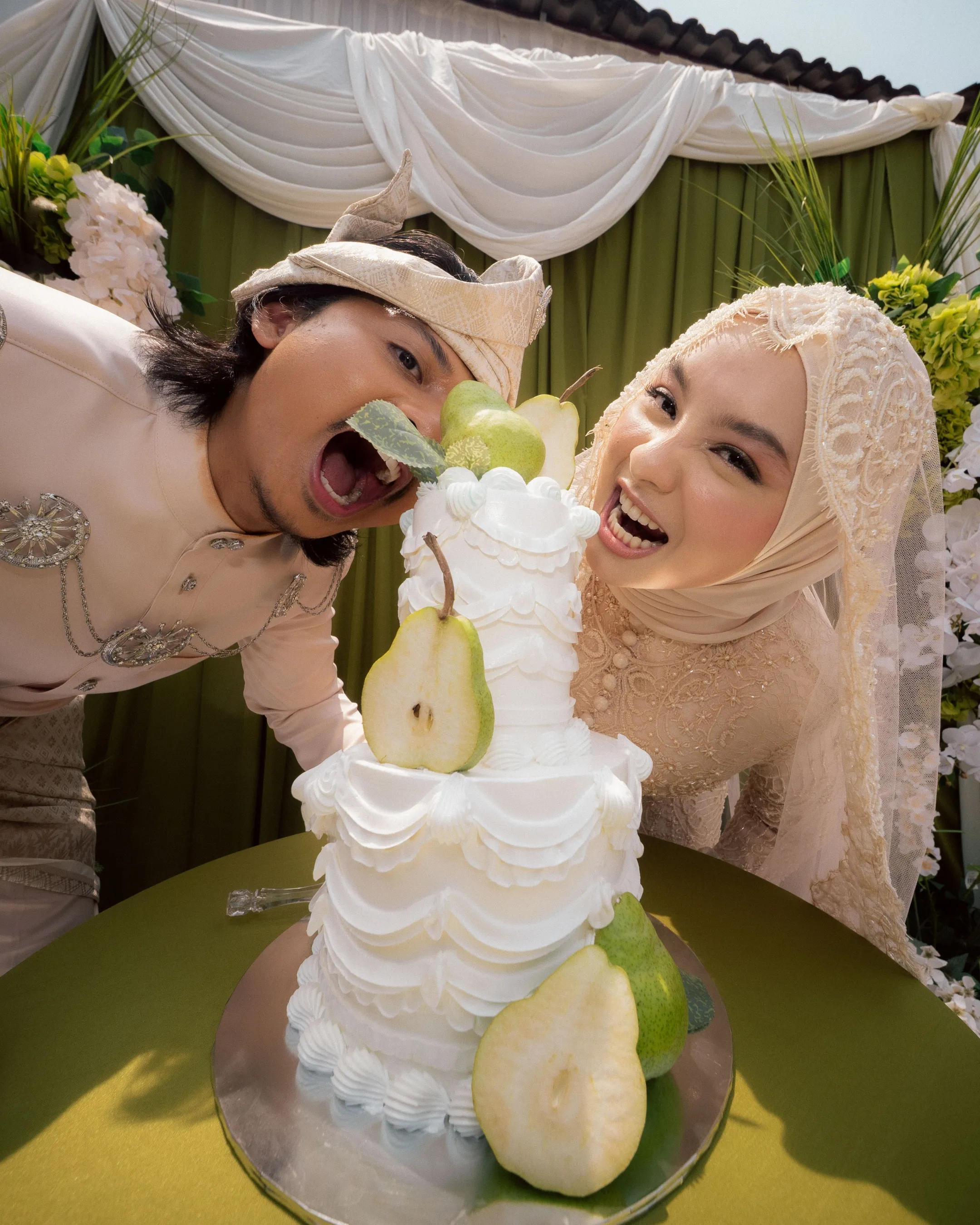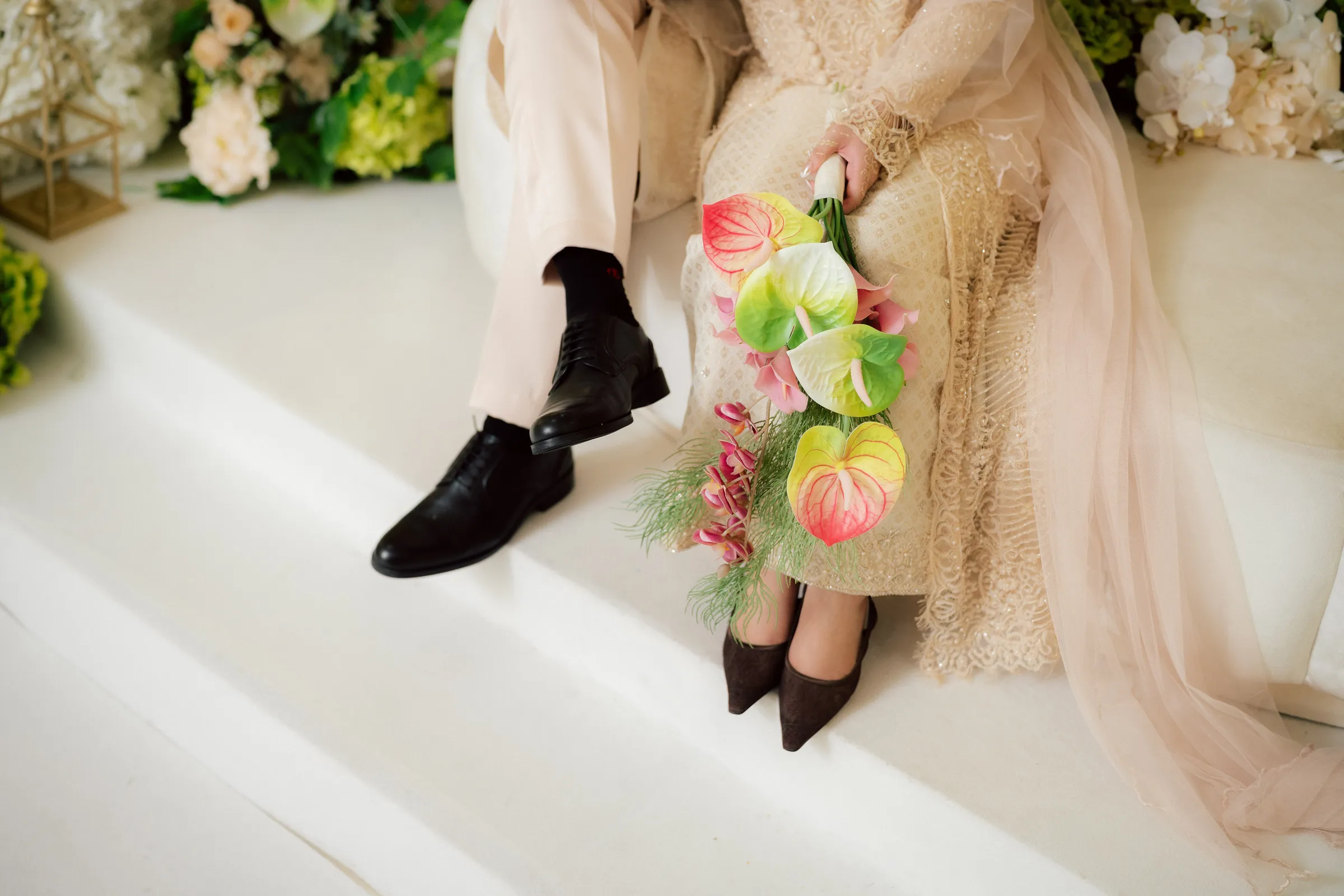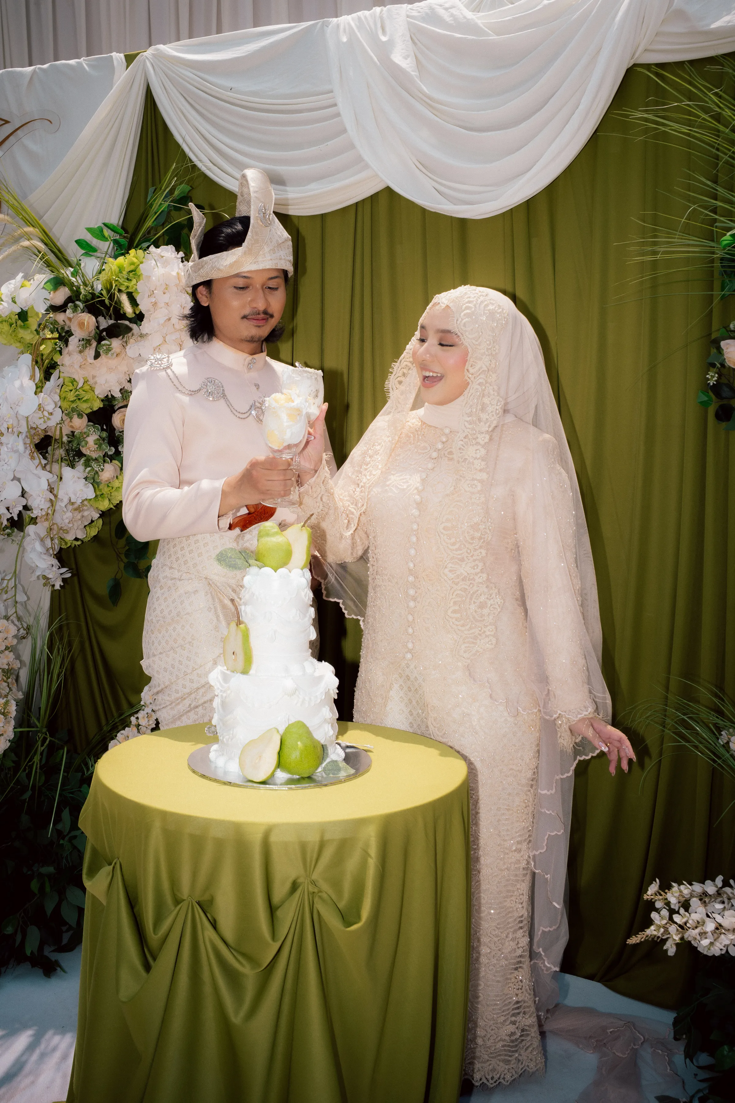 The bridal styling reflects a refined interpretation of traditional Malay wedding attire, elevated with contemporary detailing. Hawa's second look is a delicately embroidered ensemble in soft champagne tones. The lacework and bead detailing lend a couture-like finish, striking a balance between modesty and opulence. Her overall look is luminous, allowing texture and craftsmanship to take centre stage. Danial complements her in a classic baju Melayu, styled in a muted, harmonious palette. Together, their outfits feel cohesive—anchored in heritage yet thoughtfully align with the wedding’s aesthetic direction.