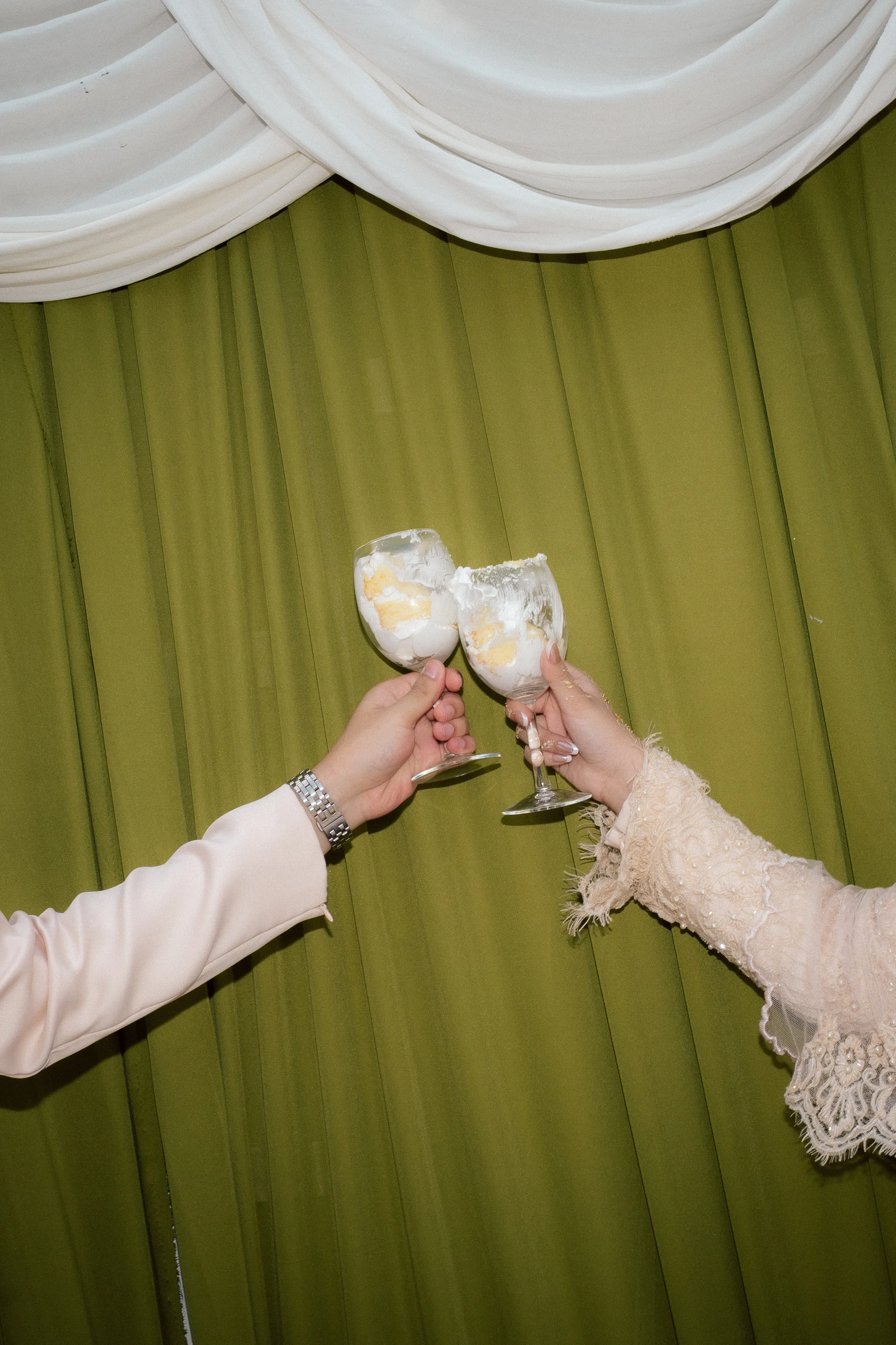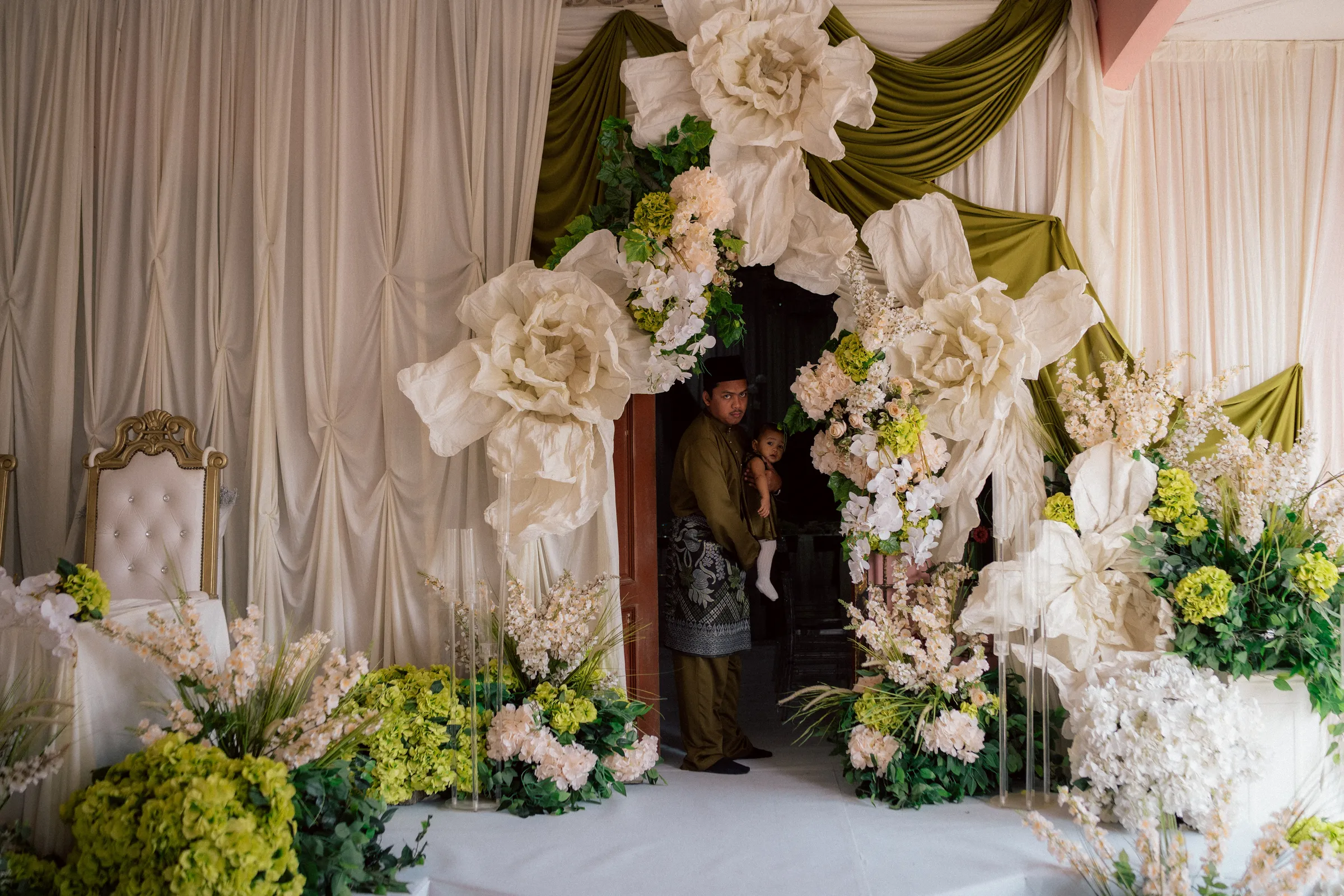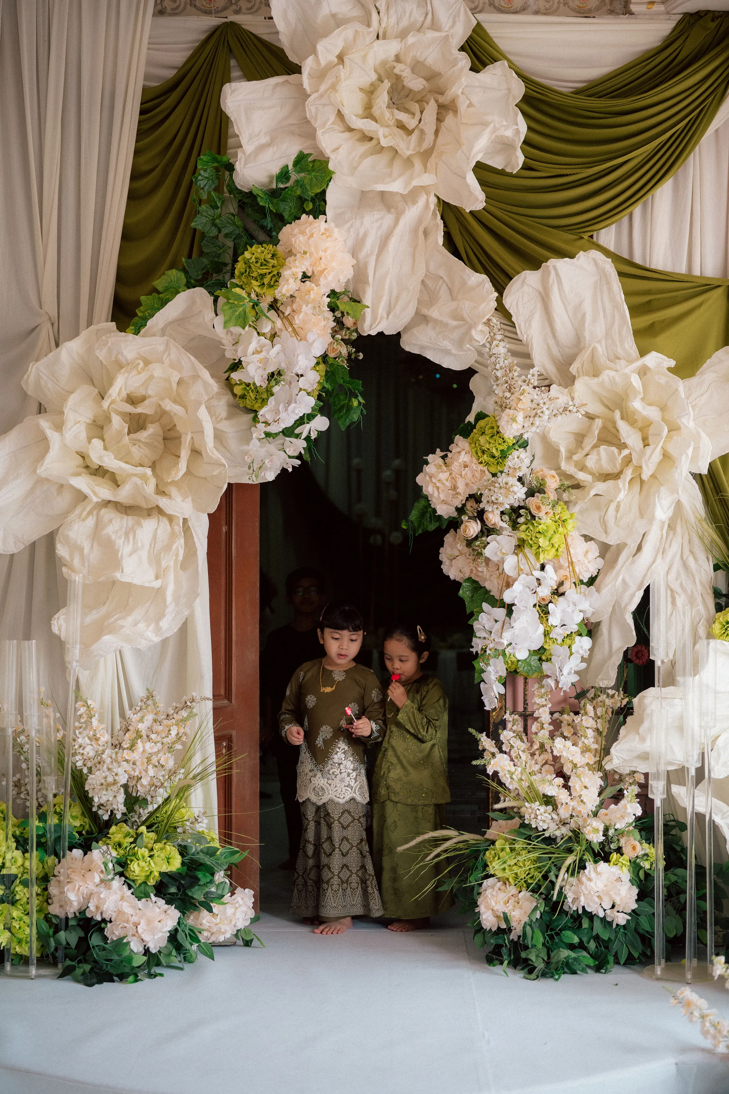 Olive green drapery forms the backbone of the space, cascading across walls and framing the ceremonial area. This is contrasted with voluminous ivory fabric swags with their subtle gradients of green and coral tones adding visual interest. Oversized sculptural florals—resembling handcrafted paper blooms—serve as striking focal points, lending an almost dreamlike quality to the environment.