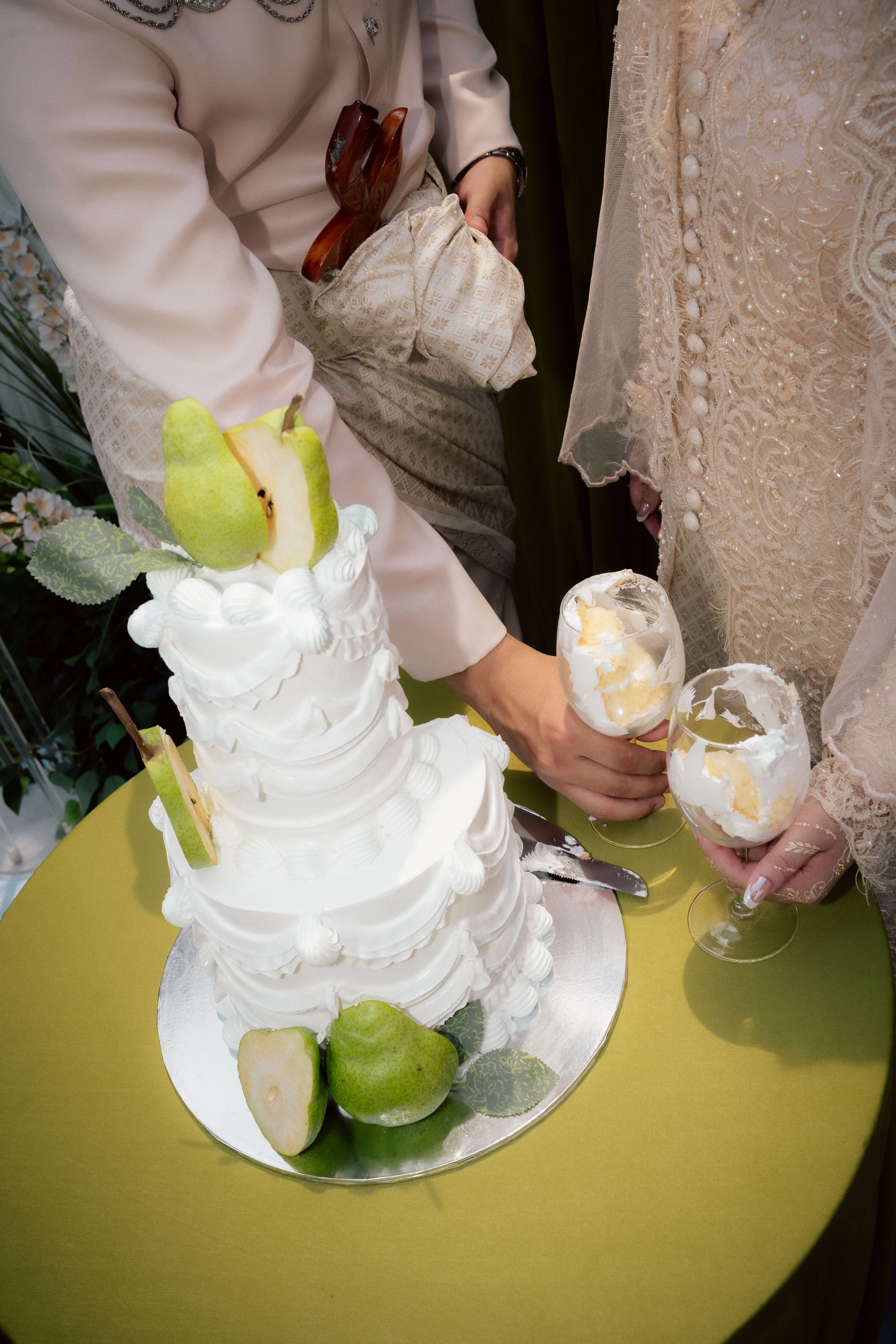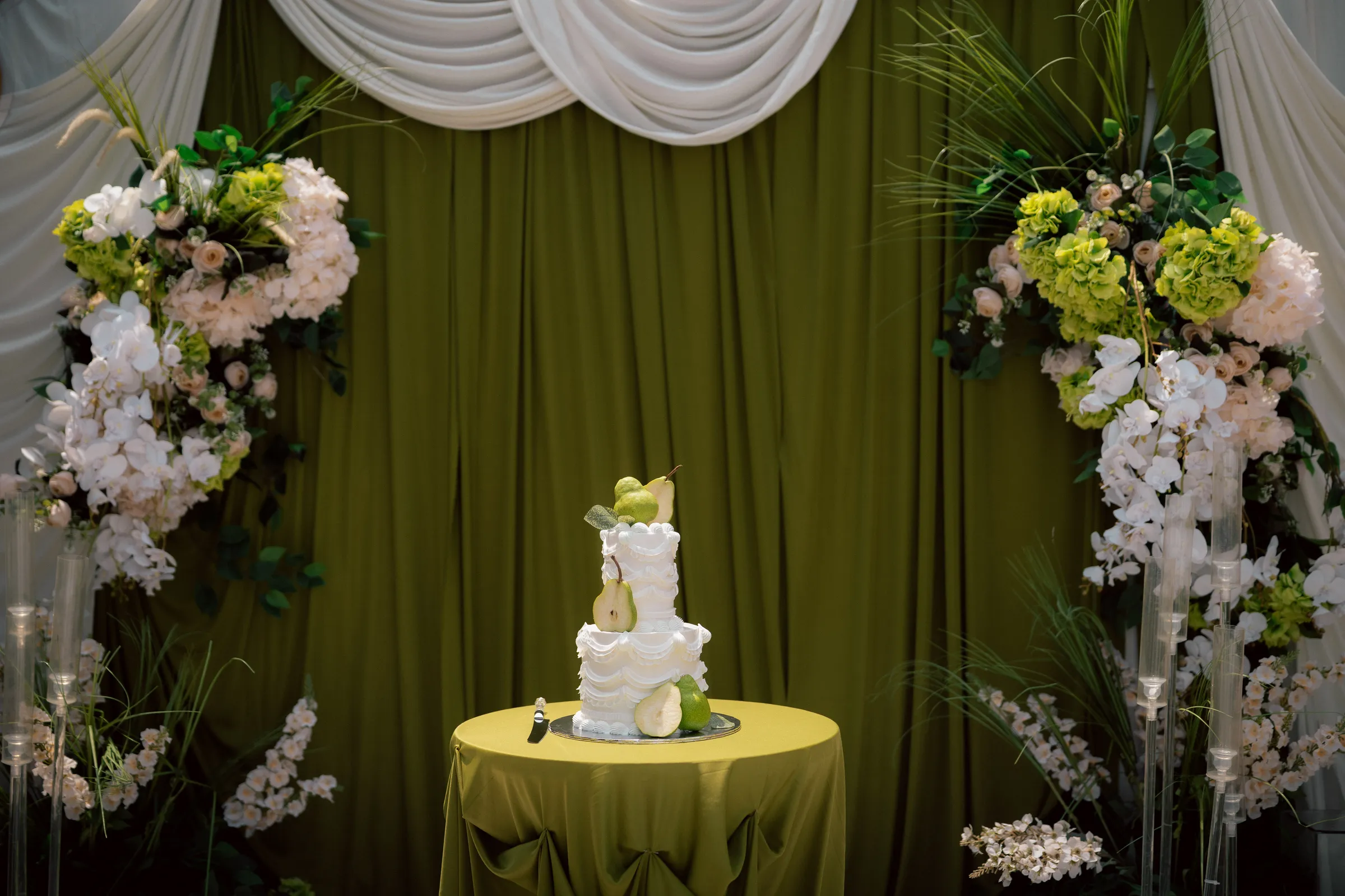 Even the tablescape details are meticulously curated. Gold accents, delicate printed stationery, and fruit elements—particularly pears—appear as unexpected yet cohesive styling choices. The wedding cake echoes this direction, adorned with realistic pear motifs and soft, piped textures, seamlessly tying into the overall theme.