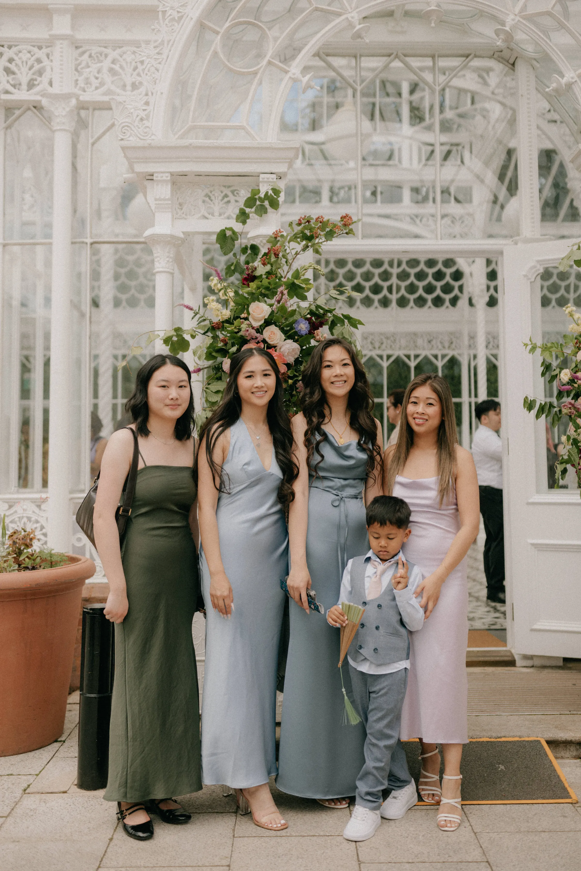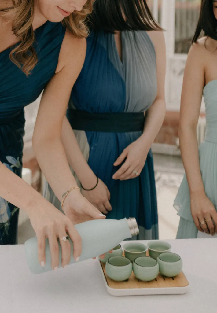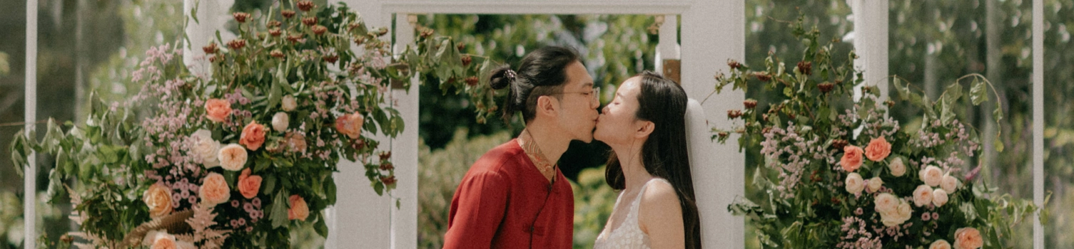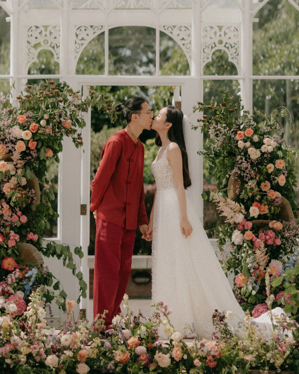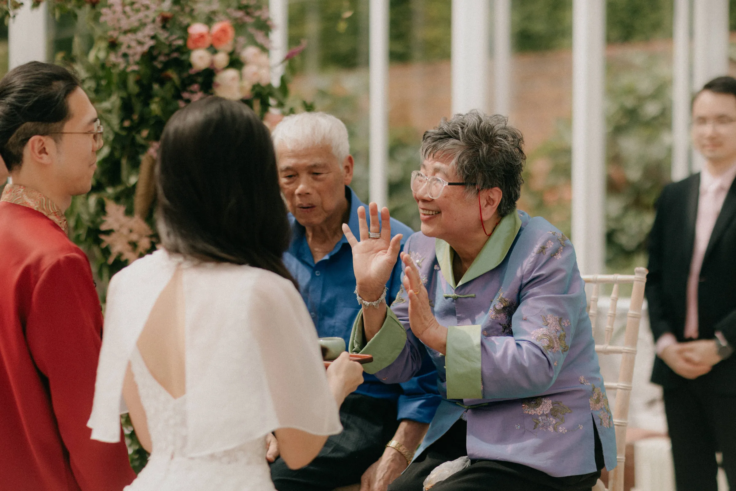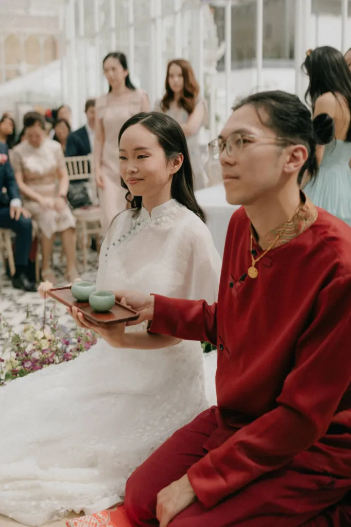 Afterwards, the couple transitioned to the main event—a Chinese tea ceremony. A deeply meaningful part of the day, this ceremony honoured their shared Chinese heritage and allowed their families, especially Jason’s grandparents, to partake in a tradition that was both personal and cultural. The beautifully decorated conservatory, filled with florals in soft pinks, greens, and whites, provided the perfect backdrop for this intimate ceremony.