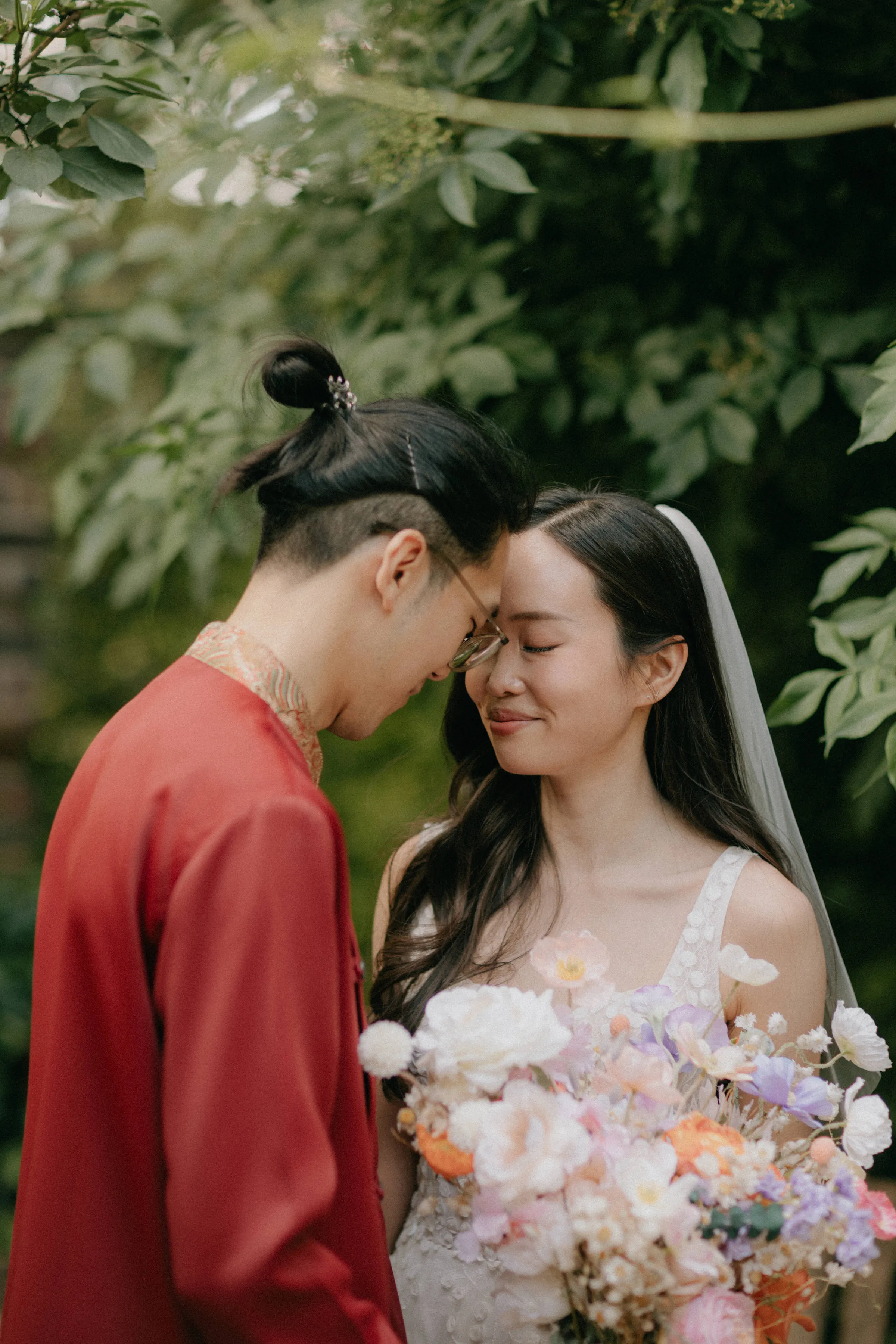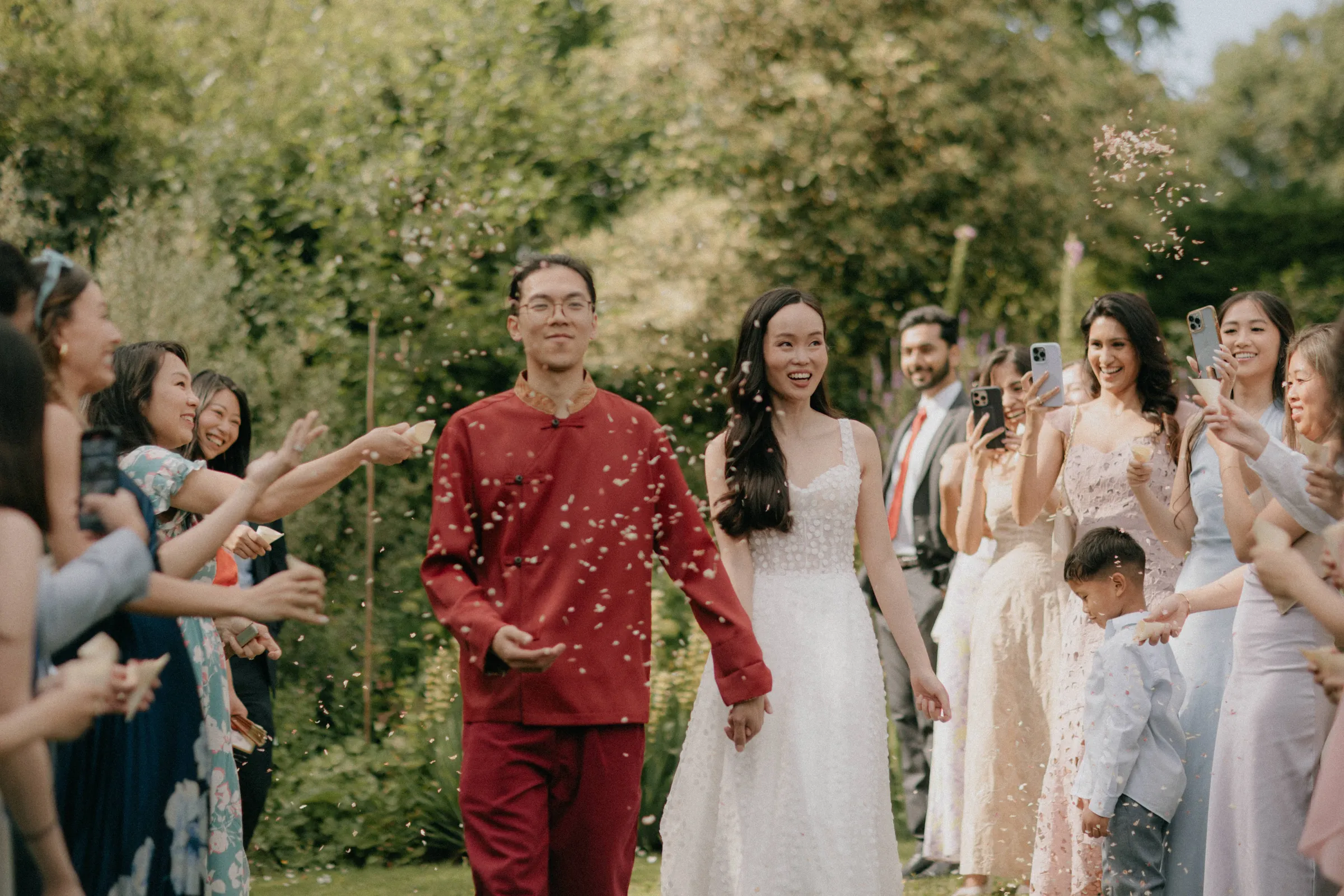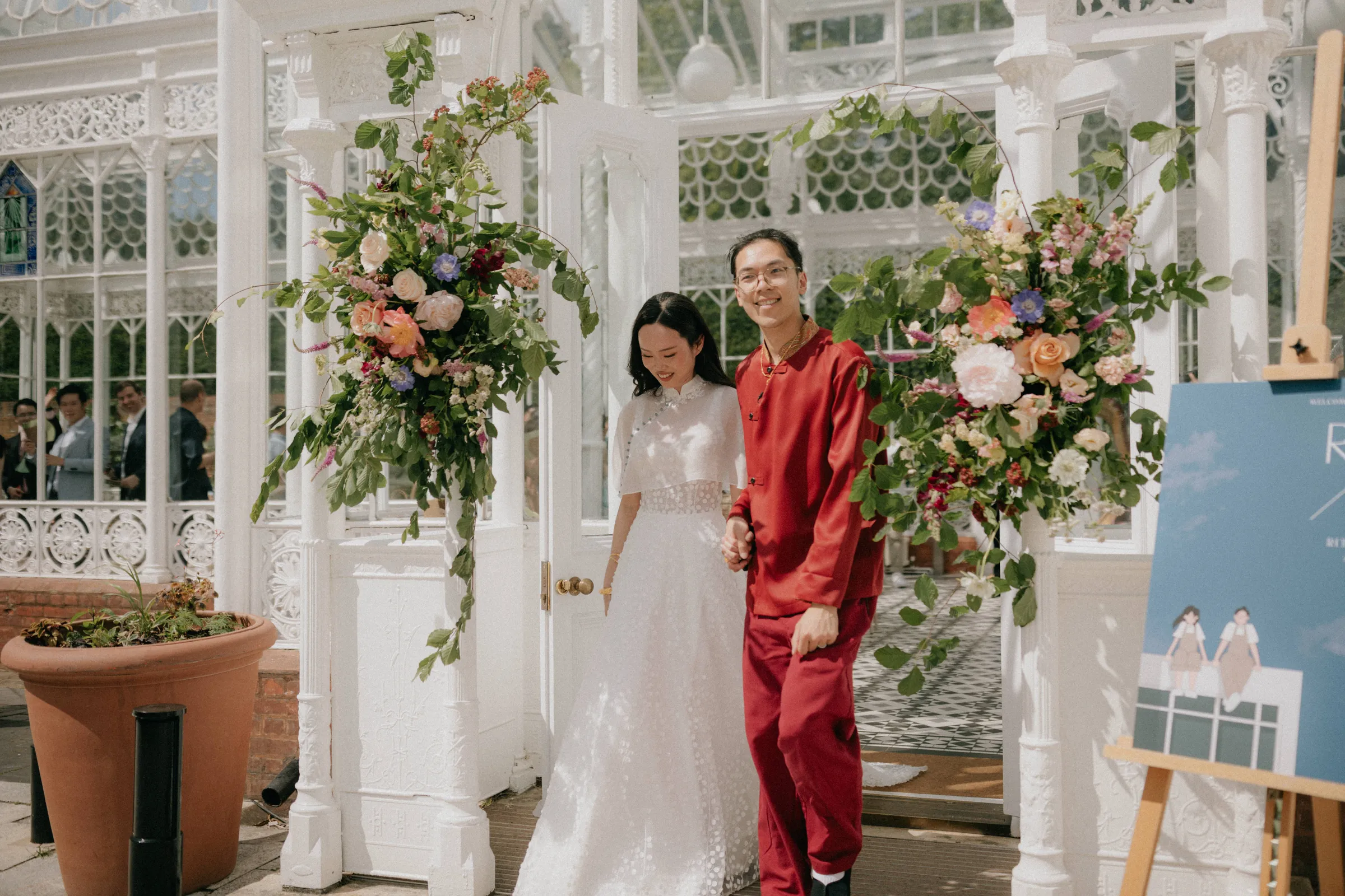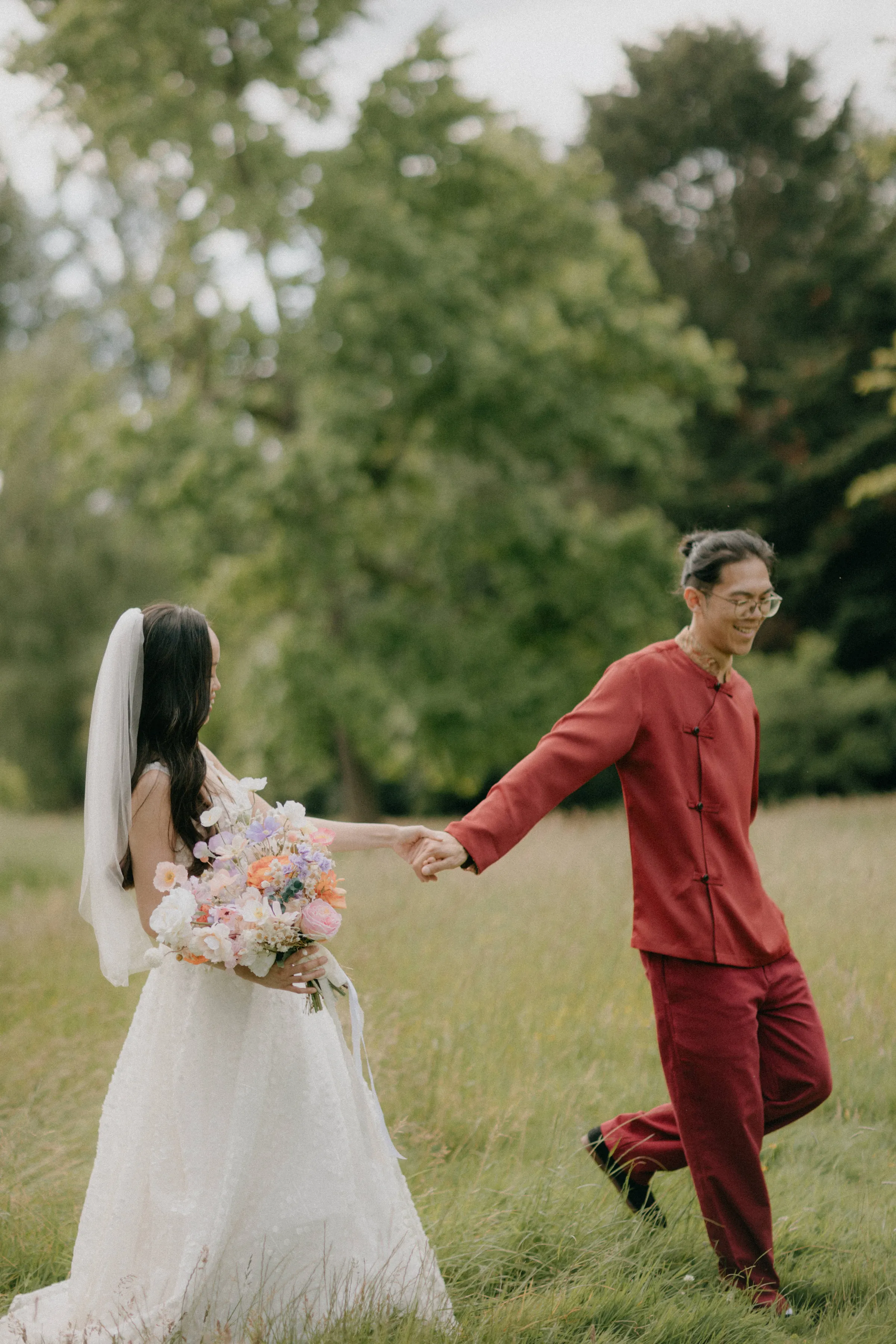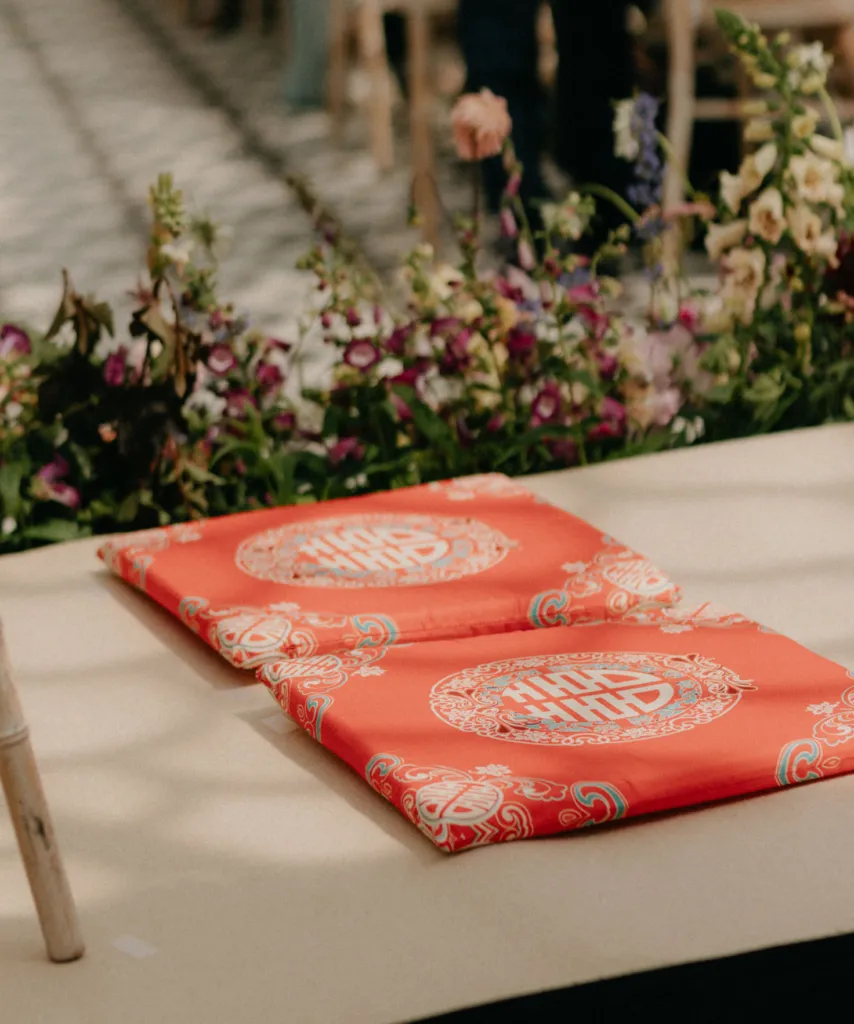 Rita and Jason’s wedding attire beautifully reflected their cultural heritage and personal style. Jason embraced his Chinese and Vietnamese roots by wearing a modern Chinese wedding suit. The top, sourced from Thailand, was paired with red linen trousers found in a Nepalese vintage clothing store in Dalston. His outfit was a vibrant nod to tradition, yet with a contemporary twist that made it uniquely his own.