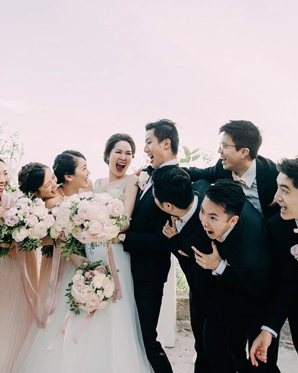 For their third and final reception, the couple’s vision was to have an intimate and relaxing evening with family and friends at Sergeant Mess Sydney, a splendid function venue with terrific views of the ocean. The bride got on to Instagram and pored over various DIY projects for inspiration. She soon found a fantastic florist who was able to bring her ideas to life with floral elements that were minimalist and classic. To complement the bridesmaids’ ethereal blush gowns, each wore ivory and blush hued corsages. Taller bouquets of ivory and lavender stood in white porcelain jars, all of which made for beautiful photos without adding too much to the venue. The bride recalled, “I didn’t need very many decorations, as the venue itself was amazing.” Thanks, Daren Chong Photography, for sharing with us this beautiful set.