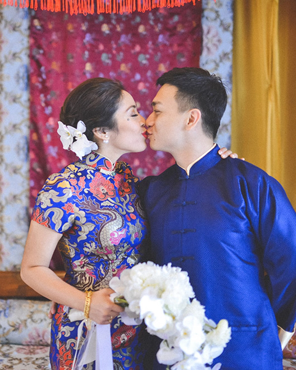 “We had our ‘akad nikah’ in the morning at my house, where I wore my Nyonya ‘kebaya’ and my late grandmother’s ‘kain batik’ and antique jewellery pieces, while Mark wore a traditional ‘baju melayu’. After the solemnisation, we changed into our Chinese outfits and had a really fun Chinese tea ceremony, which was a first for my family. I wore a special royal blue ‘cheongsam’ while Mark wore a matching ‘samfu’. It was then followed by a garden reception at home, where we were serenaded by friends. The wedding party ended at the Smokehouse Lounge at Majestic Hotel to keep with the old-school theme.