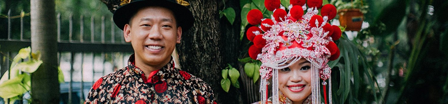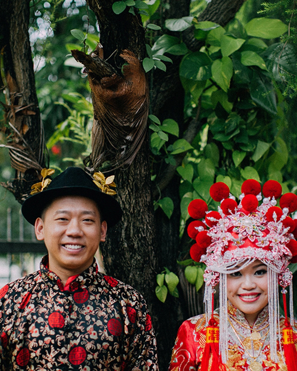 Caryn: “Since we had a simple ROM, we decided to go full traditional and dramatic for our actual wedding ceremony! I wore the traditional kwa with coronet (headgear), while my husband wore the magua with changpao, both for the gatecrashing ceremony and the march in during the dinner reception. As we have friends of different races and cultures, we thought it would be fun for them to experience a full traditional Chinese wedding, plus it’ll look great in photos!