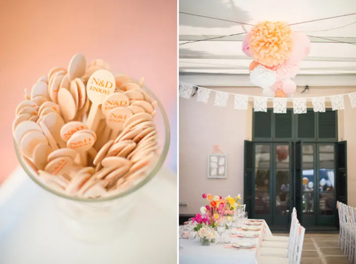 Sugarcoated Events beautifully crafted and put together the stationery. The wedding programme fans – complete with handpainted handles – menus, signs, meringue bar labels, right down to the cushions for the little ones at the end of the aisle. Detailed to the last dot, they also hand-dyed vintage napkins and aprons for the waiters to wear.